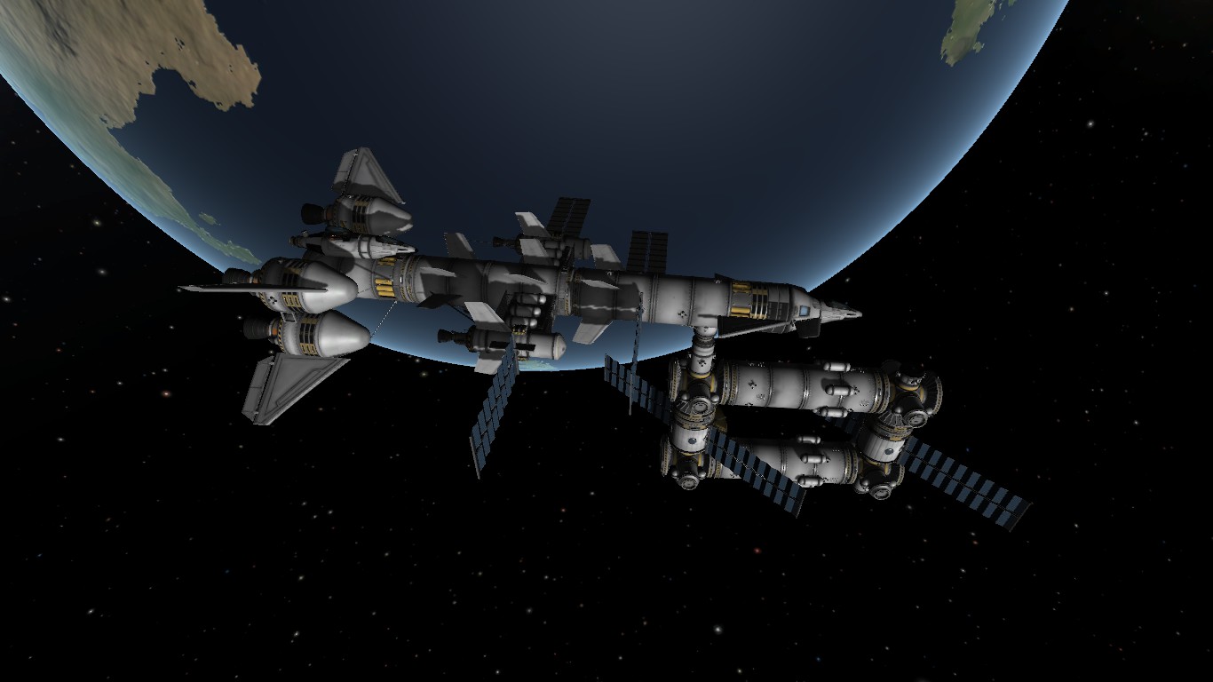 Soeben erreicht uns das Tankschiff. Es wird die Leere Abstiegsstufe auffüllen, ein Zusatzsegment dafür anbringen und unser Joolschiff nachtanken. Wahrscheinlich reicht der Treibstoff sogar, um einen Teil des Hauptantriebs wieder nachzufüllen...