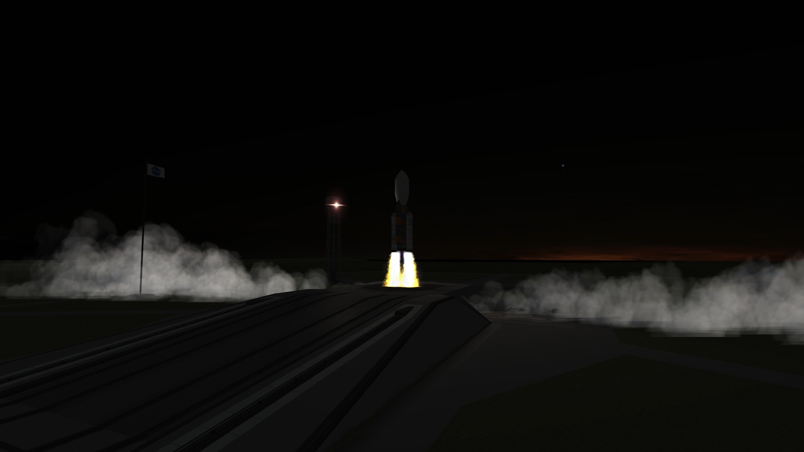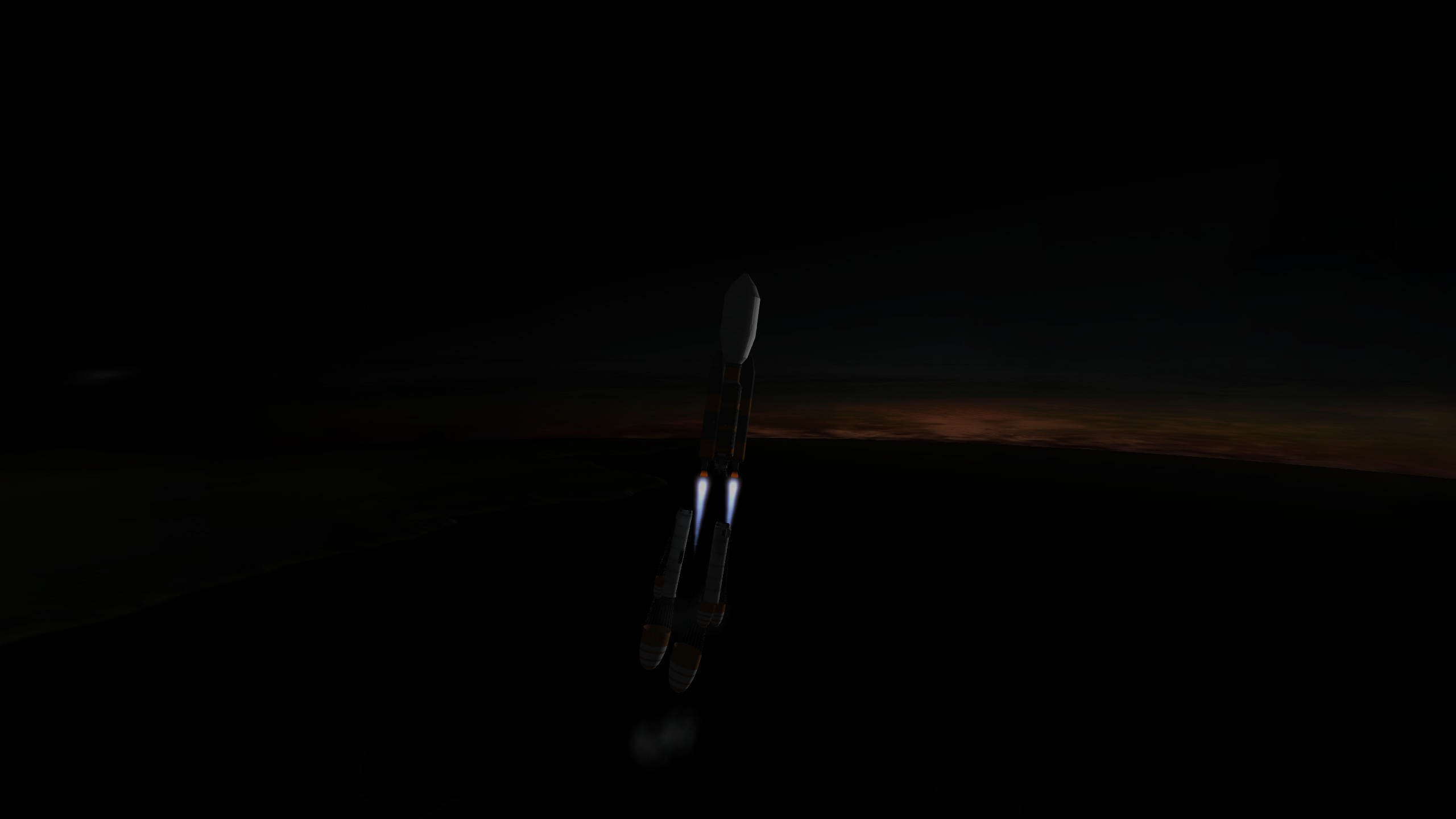 Nun startet er die Rakete, die ein Verlinkungs-Modul für die Weltraumstation um Kerbin transportiert.Mit Donnergrollen drückt sie sich nach oben. Es sieht spektakulär aus.