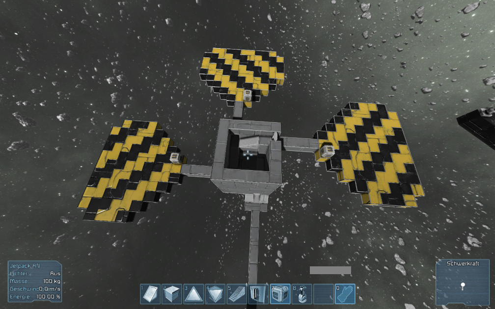 So mein Aktuelles Schiff ist zwar noch nicht ganz komplett aber sieht schonmal gut aus wie ich finde. Fehlen eigentlich nur noch die Triebwerke nach rechts, Links, oben und unten im inneren ist noch ein haufen Platz für Reaktoren oder sonstiges.