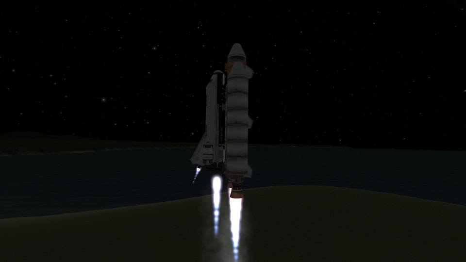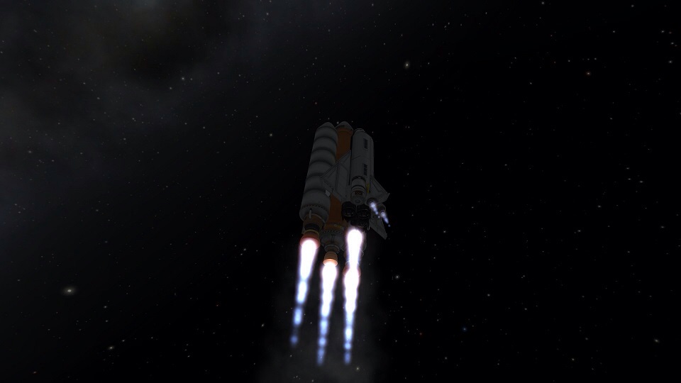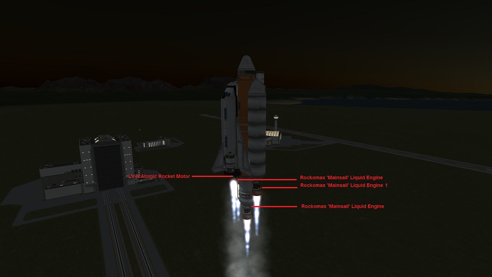 Beim Start werden die drei grossen Triebwerke(Rockomax Mainsail) + Atomtriebwerk am Space Shuttle gezündet. Wie man gut auf Bild zwei sieht wird im Weltraum das Haupttriebwerk Rockomax Mainsail abgesprengt und durch ein Rockmax Skipper ersetzt, damit die Schubbalance wieder besser stimmt. Zum restlichen ausgleich des Schubunterschiedes vom Skipper zum Atom sind vorne auf der Spitze des Haupttanks 5 kleine Rockomax 24-77 verbaut. Die können auf Wunsch einzeln gezündet werden.