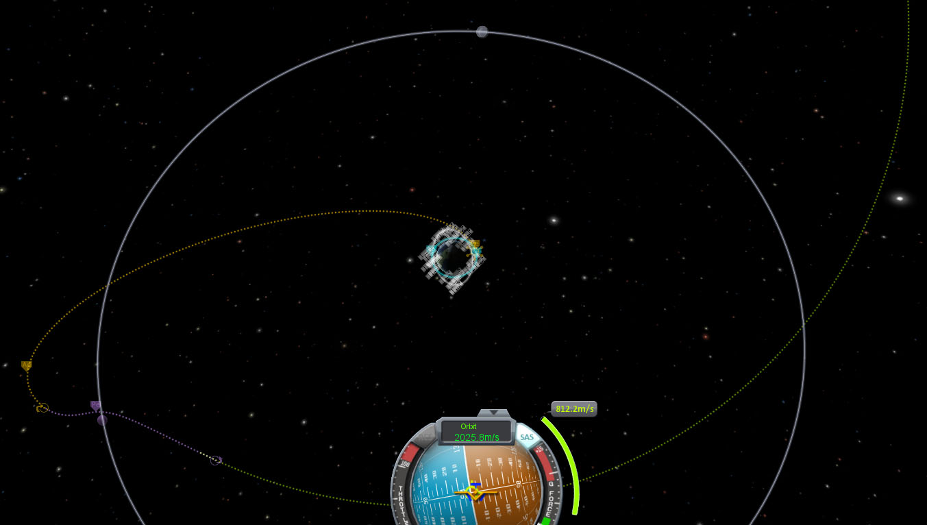 Wenn ihr Glück habt, seid ihr jetzt bereits direkt auf Kurs. Meistens wird das aber nicht so sein. Das liegt daran, dass der Rechner von kreisrunden Orbits ausgeht und die Bahnneigung nicht berücksichtigt wird. Außerdem könnt ihr nicht direkt auf die benötigte Geschwindigkeit beschleunigen, auch das braucht Zeit. Je nach dem ob ihr die Bahn des Ziels zu früh oder zu spät trifft, müsst ihr noch beschleunigen oder abbremsen. Im Zweifelsfall einfach schnell-speichern, warpen und schauen, wo ihr landet, dann schnell-laden und die Bahn korrigieren.