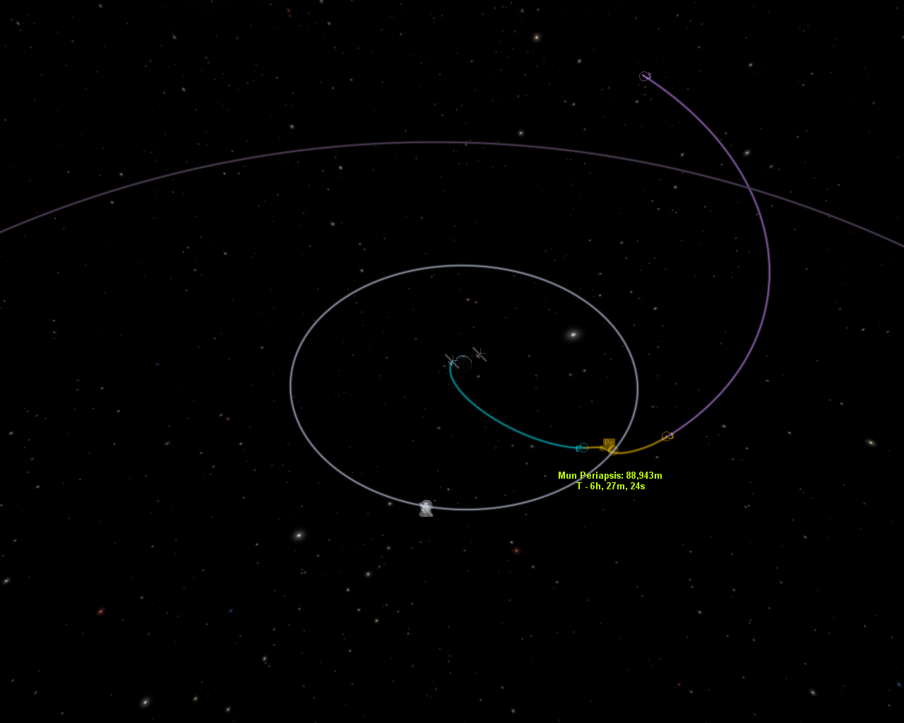 • Das kam letztens bei mir raus, als ich ein Swing-By getestet habe. Erst am Mun vorbei und dann nach Minmus :D Ich habe auch herrausgefunden das man so ungefähr 10% Sprit sparen kann, um Kerbin zu verlassen (Ohne noch an Minmus vorbei). Man muss mit dem Flight Planer "einfach hinterm Mond ansetzen" bei vllt 100 Km und schon wird man rausgeschossen (zweites Bild) Dadurch das einem mit dem Flight Planer ja auch noch die weiteren Orbits angezeigt werden, sieht man so immer wo man rauskommt, wenn man das Manöver erfolgreich fliegt. Das ist jetzt neuer Standard geworden ^^