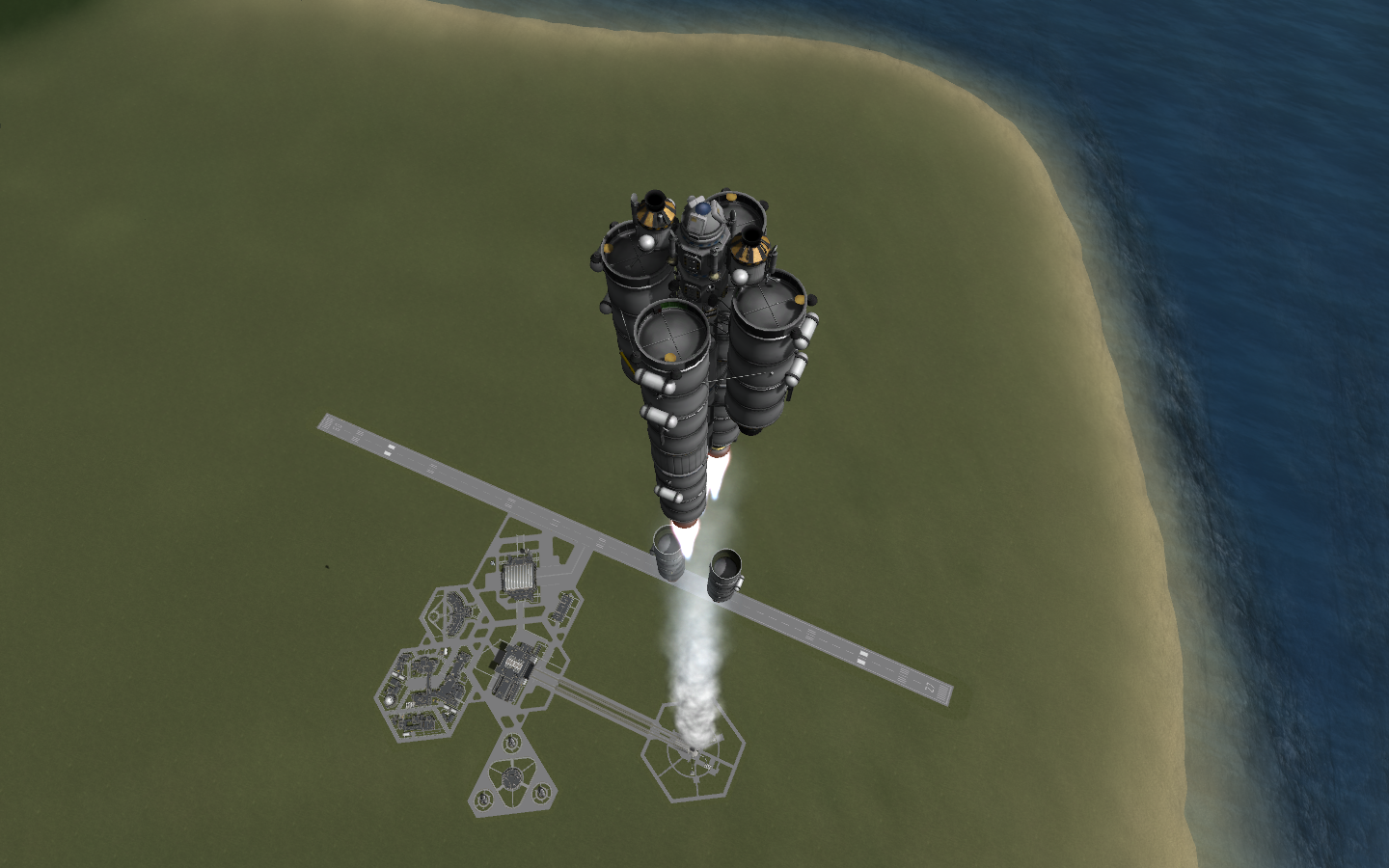 Zunächst einmal muss ich sagen, dass die Rakete für einmal Mun und zurück total overpowert ist. Der Hinflug und das Landemanöver verliefen problemlos, aber leider musste ich ja unbedingt an einem Hang landen und so hab ich mich erstmal mehrfach überschlagen bis der Lander endlich auf der Seite zum liegen kam. Start vom Mun und Rendevou mit dem Mutterschiff verliefen ebenfalls problemlos, aber dann fingen die Probleme an: Mir ist erst da nämlich aufgefallen, dass der Lander überhaupt keinen Dockingport hat. Einfach umsteigen ging nicht, da ich schlauerweise auch einen Kerman in die Landekapsel gesetzt hatte. Also hab ich mich mit meinem Kerman einfach an die Leiter des anderen Comandpods rangeklammert und hab dann damit meinen Burn nach Kerbin durchgeführt. Und so ist der Kerman dann den ganzen Weg EVA neben dem Raumschiff nach Kerbin zurückgeflogen und hat sogar den Wiedereintritt auf der Leiter überstanden. Und etwa 5km über der Oberfläche, als ich mir gedacht hab "jetzt hab ich das schlimmste hinter mir" bemerk ich erst, dass es überhaupt keine Fallschirme gibt und so sind beide Kerman letztendlich ins Meer gestürzt...