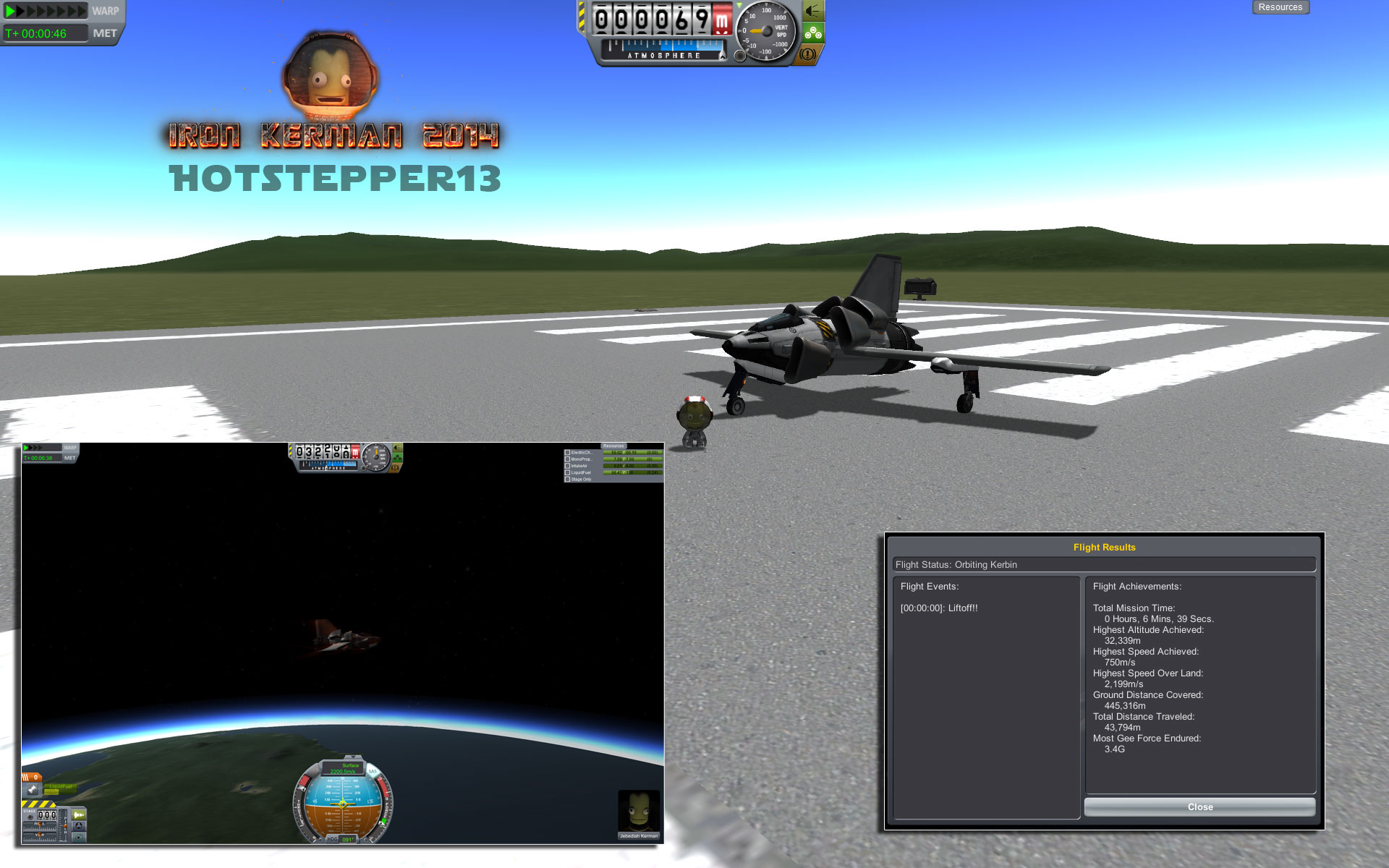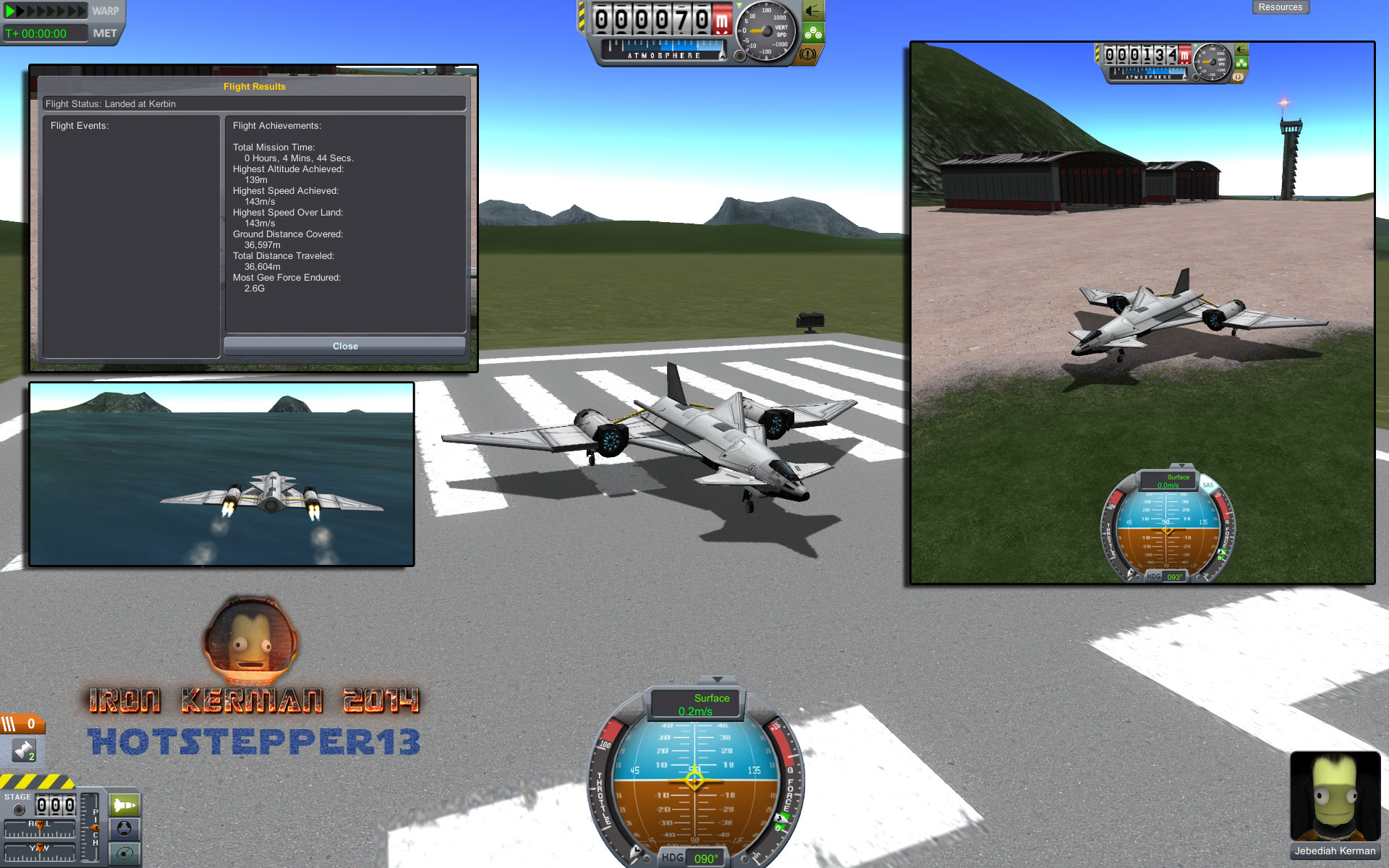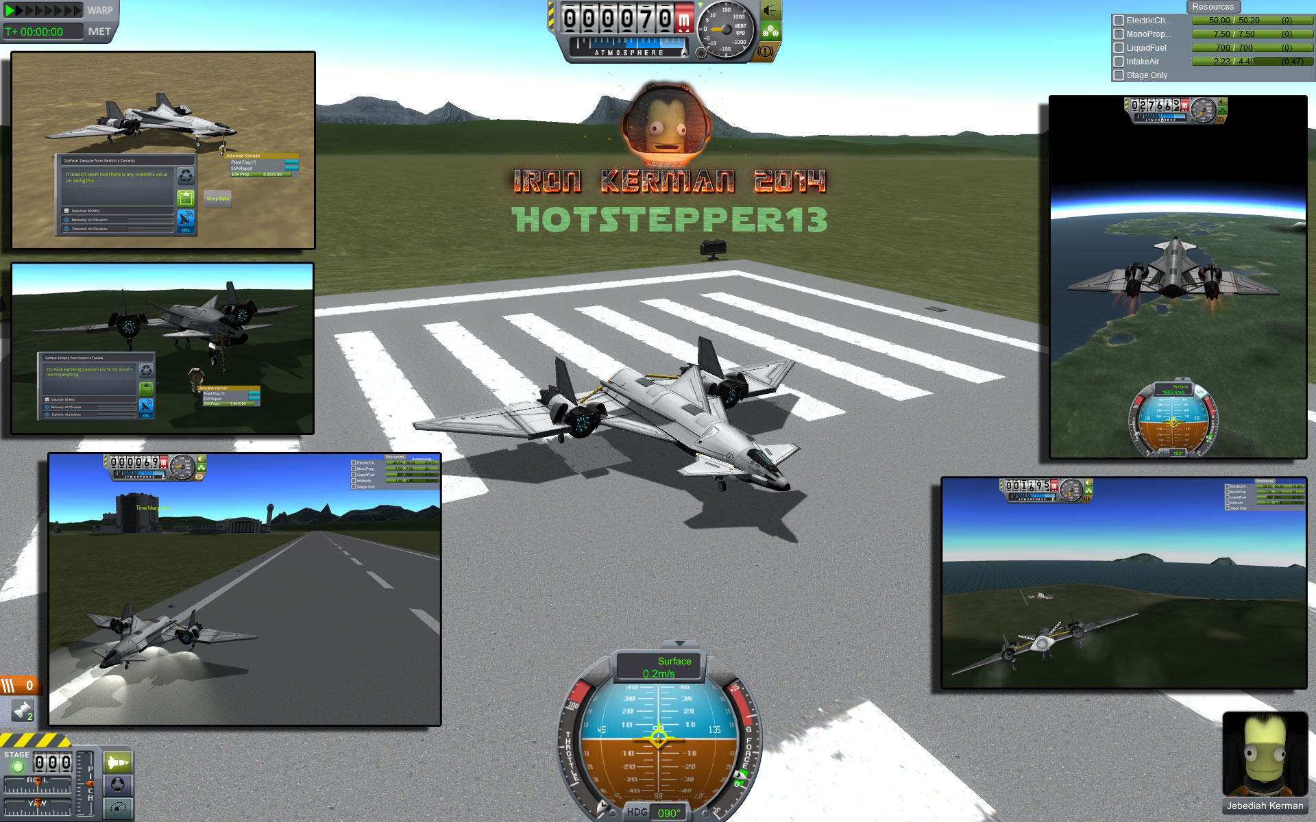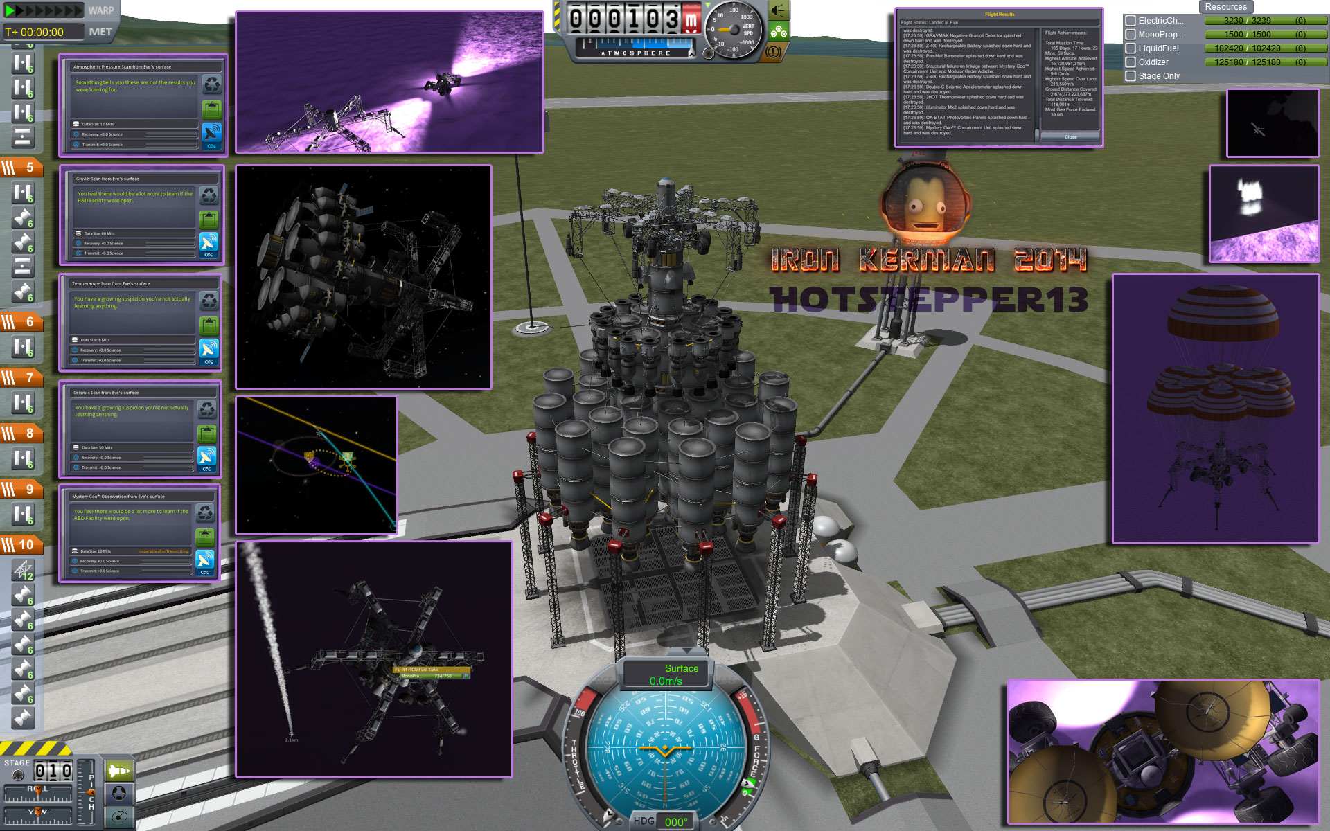 Diesmal vom Start erst zur Tundra, von da nach Süden in die Wüste und dann zurück zum KSC. Um Sprit zu sparen bin ich ziemlich hoch geflogen und habe dabei teilweise Geschwindigkeiten von 1.700 m/s erreicht. Beim Rückflug zum KSC bin ich erst zur falschen Stelle (zu weit südlich) geflogen und hätte fast noch mein Flugzeug verloren weil die Kiste ins Trudeln gekommen ist. Glücklicherweise konnte ich das Ding noch abfangen und meinen Weg zum KSC fortsetzen. Ein etwas schiefe landung später stand ich dann mitsamt der Bodenproben da wo ich hin sollte. Gesamte Missionsdauer waren 51 minuten (nur fürs fliegen und einsammeln). Dafür nur 10.000 Punkte? :)