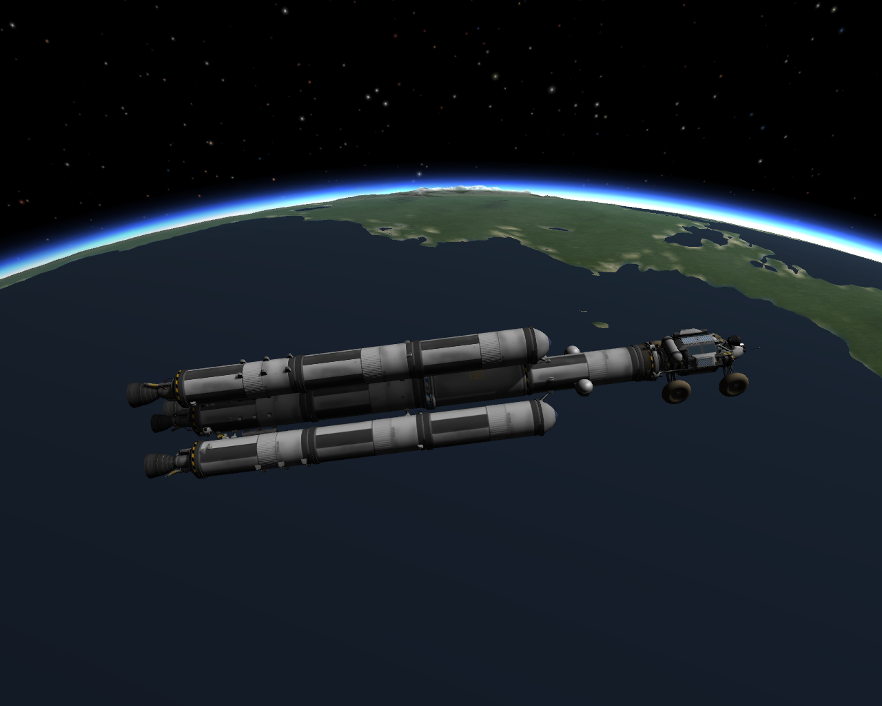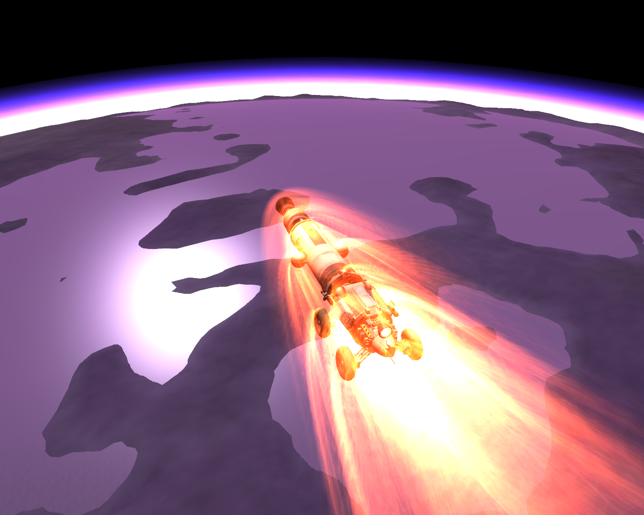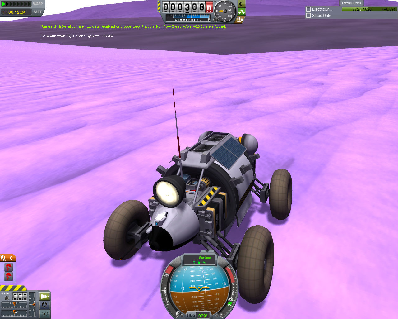 Bei dieser Mission habe ich mich für die 1,25 m Parts entschieden, welche absolut ausreichend sind, für einen rund 1 t leichten Forschungsrover. Dieser ist ausgestattet mit allen 7 Sensoren, mehreren Batterien, Solar, einer Antenne und RTG. Um sicher zu sein, auch genügend Sprit zu haben, habe ich 12 Booster bei der Rakete verbaut, von denen die Hälfte beim Start zündet und die anderen 6 beim absprengen der ersten. Im flachen Kerbin Orbit angekommen, waren noch 3 gut gefüllte Außentanks vorhanden, mit denen ich dann Kerbin ohne Swing By im Morgengrauen verlassen habe. Im Sonnenorbit wurde die Neigung zu Eve angepasst und danach der Transfer-Orbit geburnt, die Außentanks waren nun geleert. Bei Eve peilte ich dann einen 70 Km Aerobrake an, welcher etwas zu hoch eingeschätzt war, aber aufgrund des noch vorhandenen Treibstoffs, drückte ich nicht F9, sondern gab einfach Vollgas Rückwärts und verringerte die Apo noch ein wenig, bis auf ca. 1.300 Km. Weil das natürlich noch zu viel war, peilte ich einen zweiten Aerobrake bei 75 Km an, welcher wieder zu hoch war :rolleyes: und half dann nochmals mit dem Triebwerk nach (erst jetzt brauchte ich die Atomic).