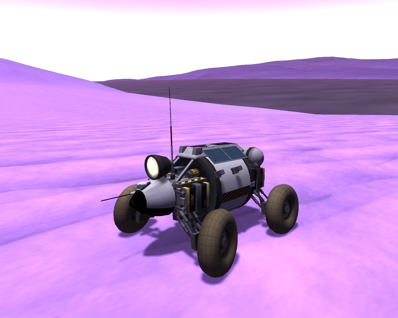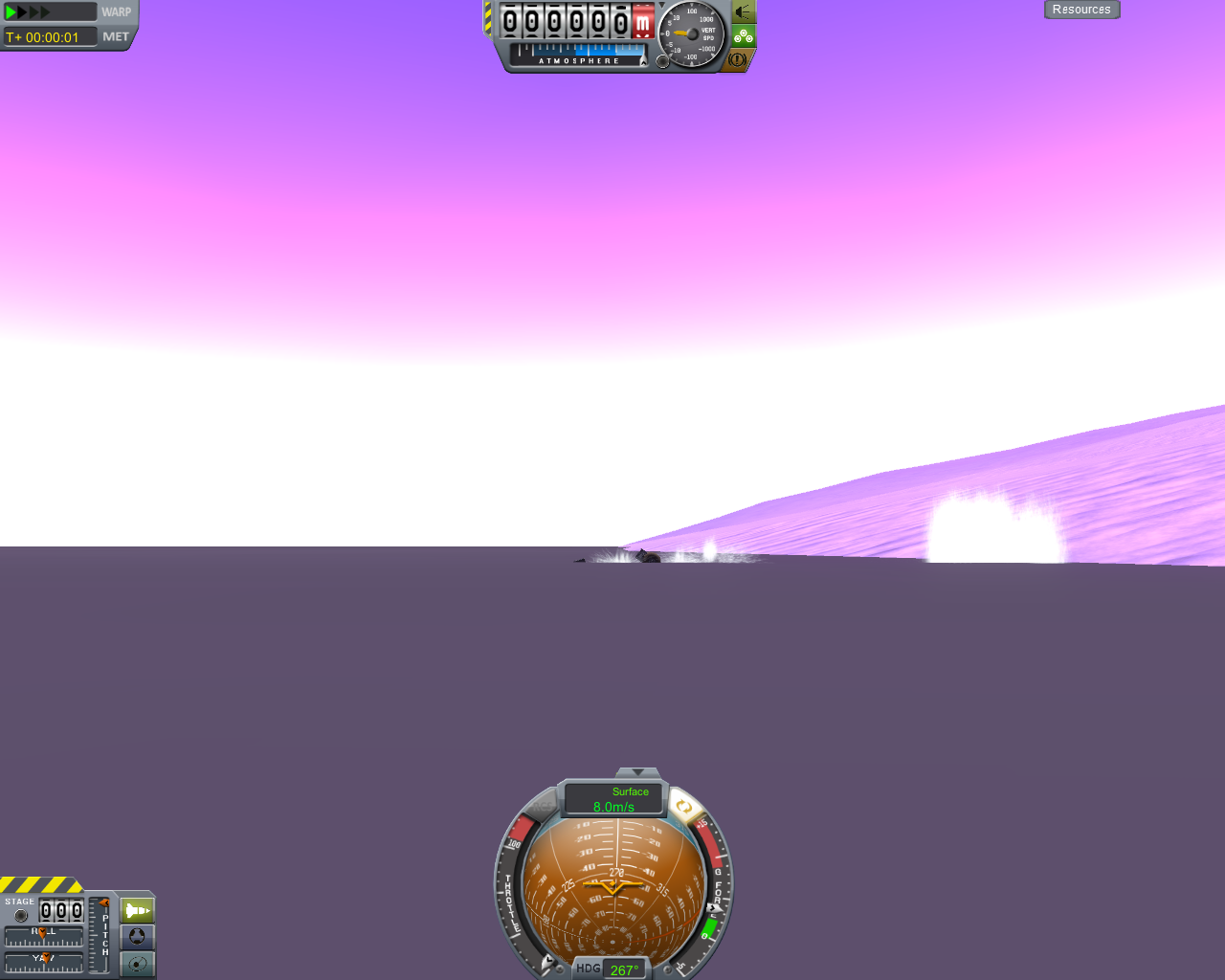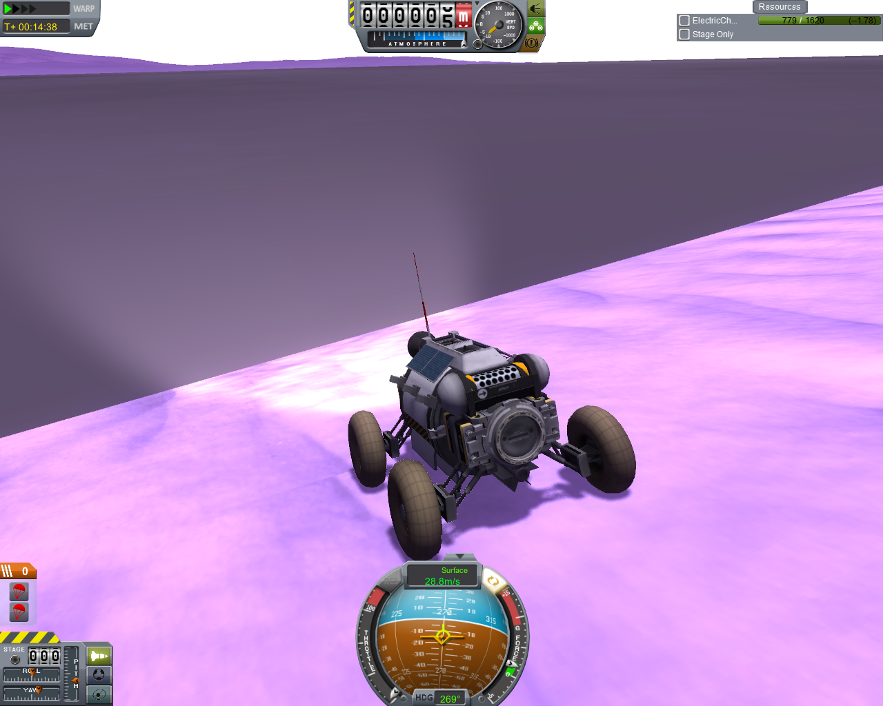 Nun wurden die Decoupler mit den Fallschirmen abgesprengt und ich fuhr erst mal ein Stück nach oben, "damit die Sensoren besser arbeiten" und ich mehr Schwung für die "Wasserung" habe. Auf einer Höhe von 308 m angekommen, drückte ich die 8 um alle Sensoren zu aktivieren. Sämtliche Daten wurden direkt danach versendet, mit enormen Abzug... Jetzt hieß es den Rover zu wenden und ihn mit Vollgas zu versenken. Mit rund 30 m/s rauschte das Gefährt den Hang hinunter und klatschte kurze Zeit später in dieser violetten Brühe auf - es haben nur die beiden Achsen des Rovers überlebt, der Rest ist sofort vernichtet wurden.