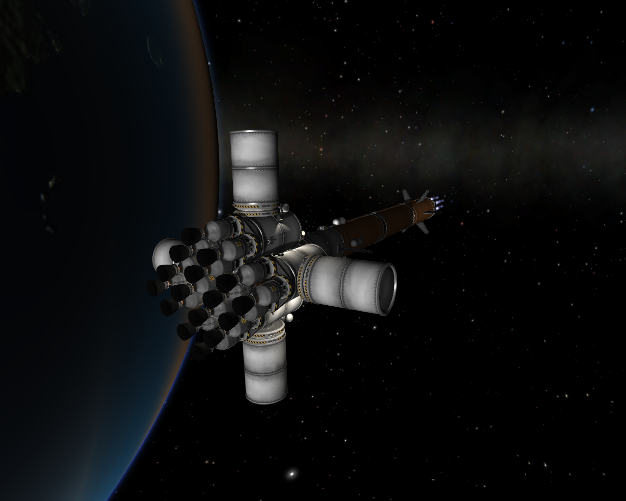 Ich versuche mich derzeit an einem neuem interplanteren Mutterschiff, mit dem ich ca. 40 t nach Jool befördern kann und noch Treibstoff für einen Rückflug habe (ohne Nutzlast). Meine "Grundformel" geht von 4 Nukes auf einen Jumbo aus - bei 4 Jumbos am Schiff, macht das dann also 16 Nukes als Antrieb. Das Teil ist schon fast bereit für den ersten Test, es soll nurnoch irgendwas an die Front gedockt werden, vllt ein Lander oder ein Flugzeug für Laythe, mal sehen... Mit der "Brücke" bin ich auch ganz zufrieden - sie sollte etwas assymmetrisch aussehen, was mir glaube ganz gut gelungen ist. Das besondere daran ist, das man sich das Schiff aus verschiedenen IVA Ansichten angucken kann, was die Spielatmo deutlich anhebt