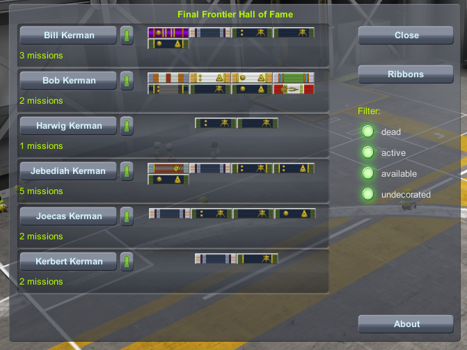 Final Frontier. Endlich ein Kerbal Missionslogbuch mit Ribbons. Es gibt Hunderte Ribbons die automatisch verliehen werden, andere kann man manuell verleihen.
