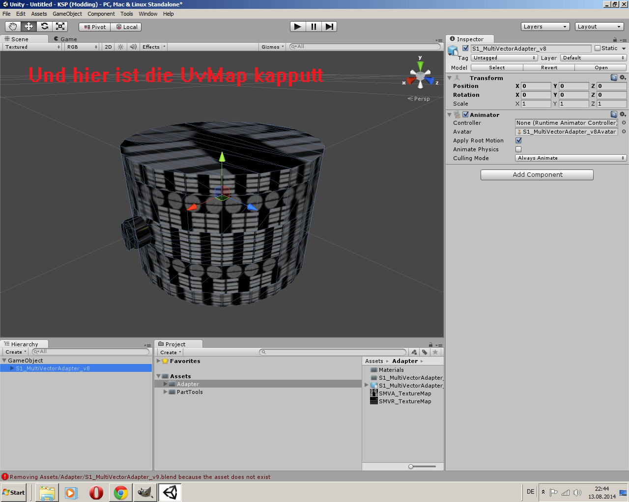 • Also ich habe Unity 4.3.4 und alles läuft tadellos. Das ist ein Bug in der aktuellen Unity-Version. Ich würde dir raten, einfach 4.3.4 oder eine andere Version wieder aufzuspielen, sofen du die Installer noch hast. Sonst kann man da anscheinend nicht viel machen, weil der .fbx-Importer von Unity momentan für die Tonne ist.