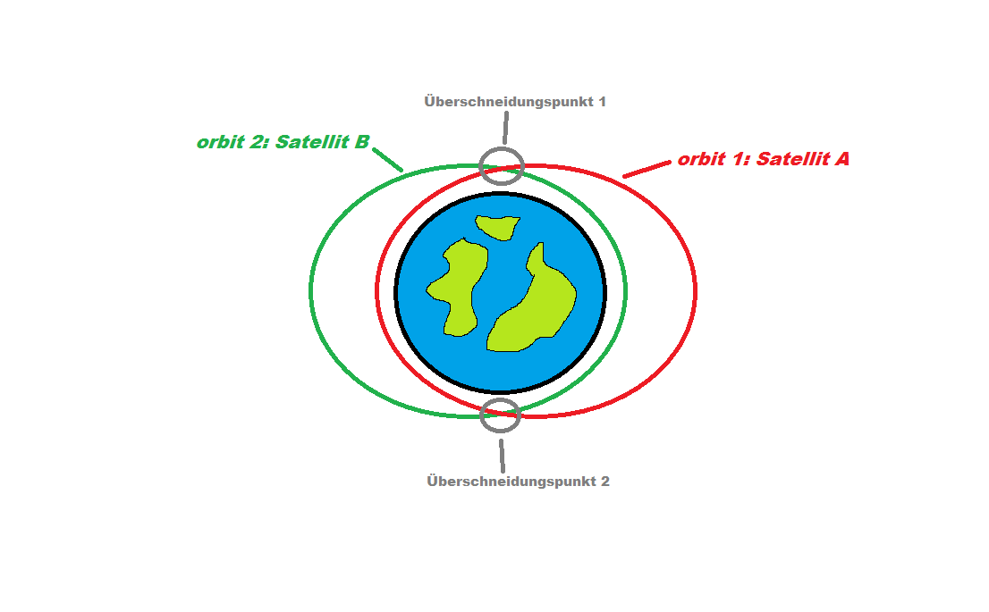 Ja, so in etwa meine ich dass. beide Satelliten müssten entgegen dem Urzeigersinn fliegen, und so getimet sein, dass genau an einem der beiden möglichen Schnittpunkte die beiden Dockingports aneinander docken.