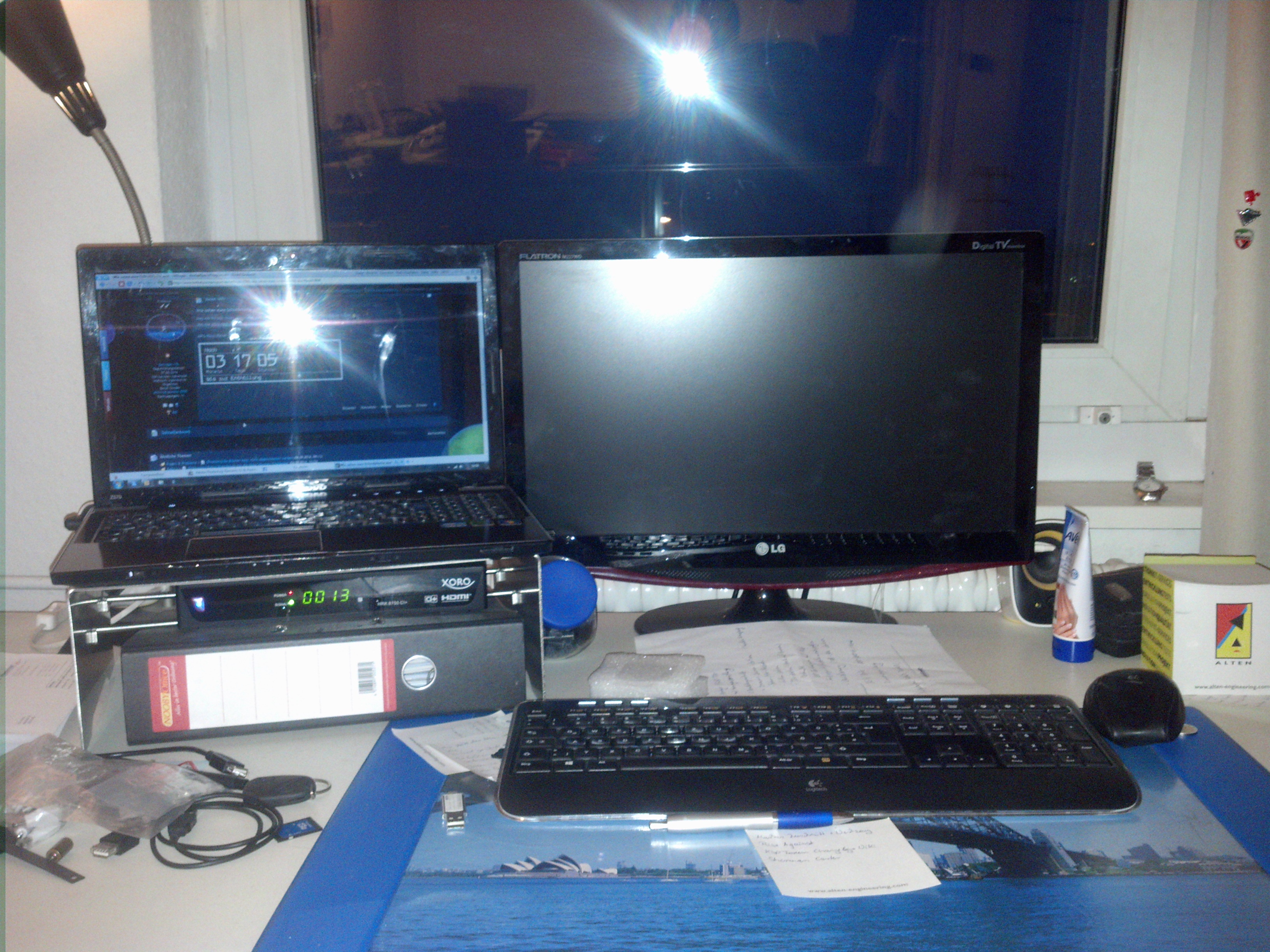 Das Panorama ist aber bisschen sehr schlecht zusammen gestückelt und der Kontrast Zwischen hellem Bildschirm und dunkler Umgebung war etwas zu groß. Darum hab ich ein Screenshot von meinem Desktop gemacht und hab den nochmal ins Bild geklatscht.