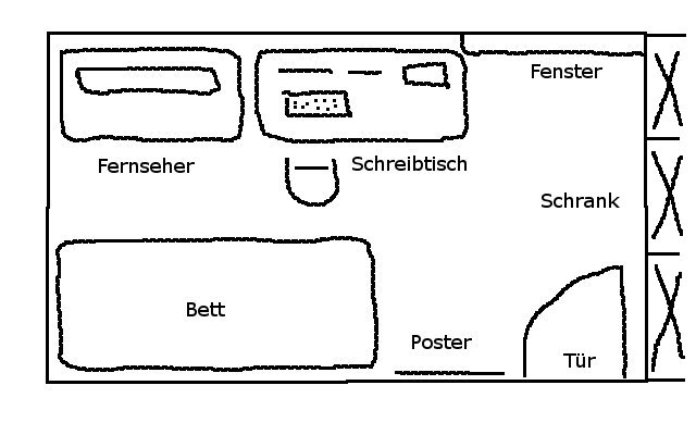 Durch das Schreibtisch Foto konnte ich auch eine komplette Analyse deines Zimmers machen, das in etwa so aussieht: