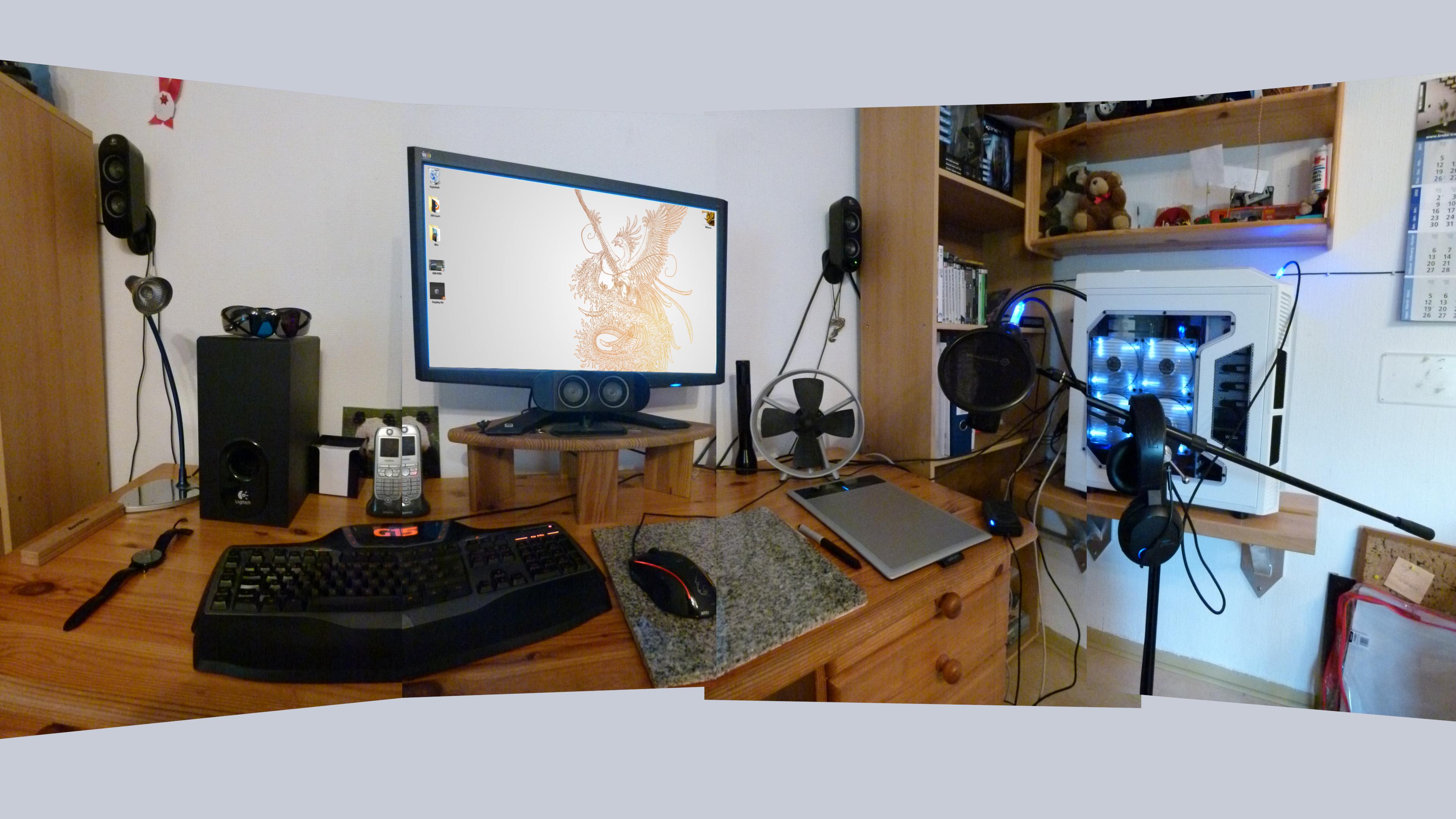 Ich hab ein Panorama erstellt ... ganz einfach weil mein Schreibtisch mit meinem Rechner sowiso nicht auf ein Bild passt und der Schreibtisch so aufgeräumter aussieht ![]()