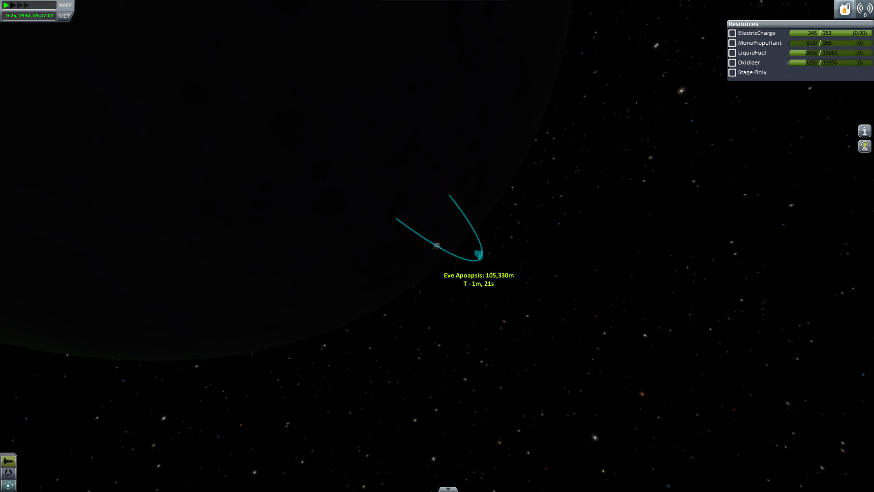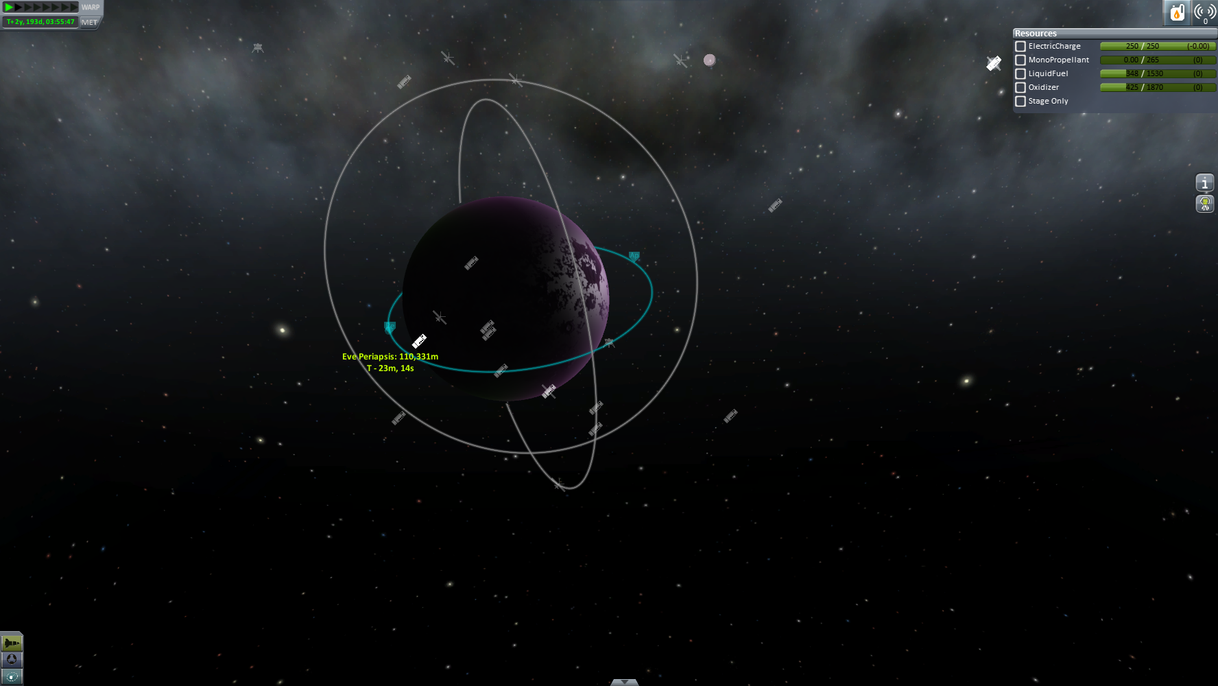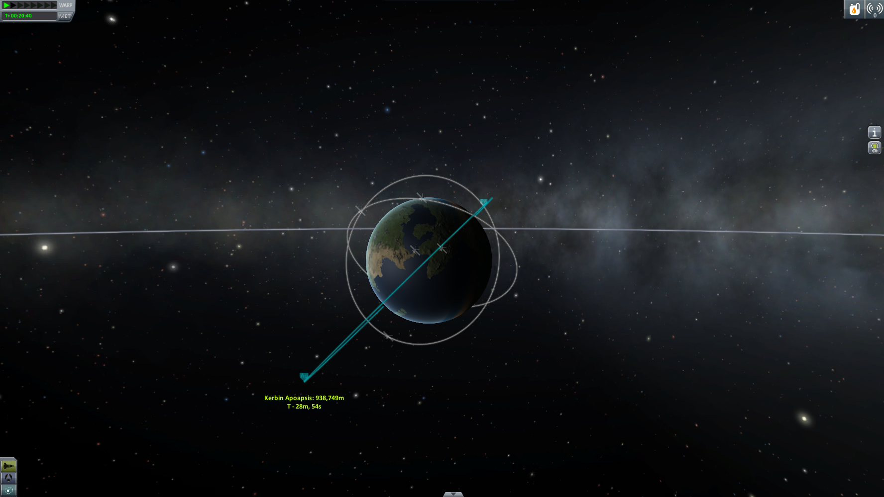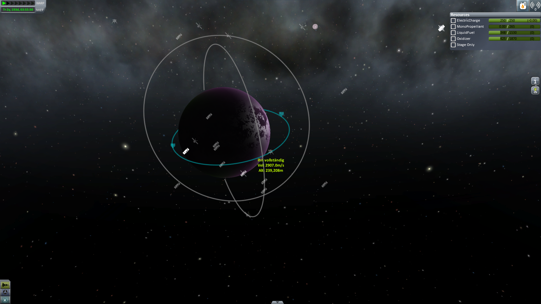 Da ich wusste, dass das EE am Äquator war, wollte ich in einen entsprechenden Orbit einschwenken. Kurz bevor ich die Apoapsis erreicht habe, um einen stabilen Orbit zu erreichen war das EE in Sicht.