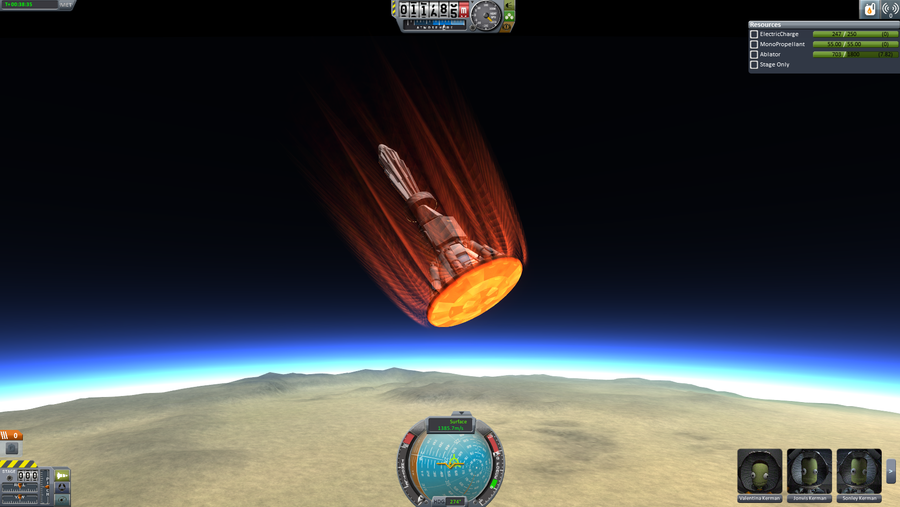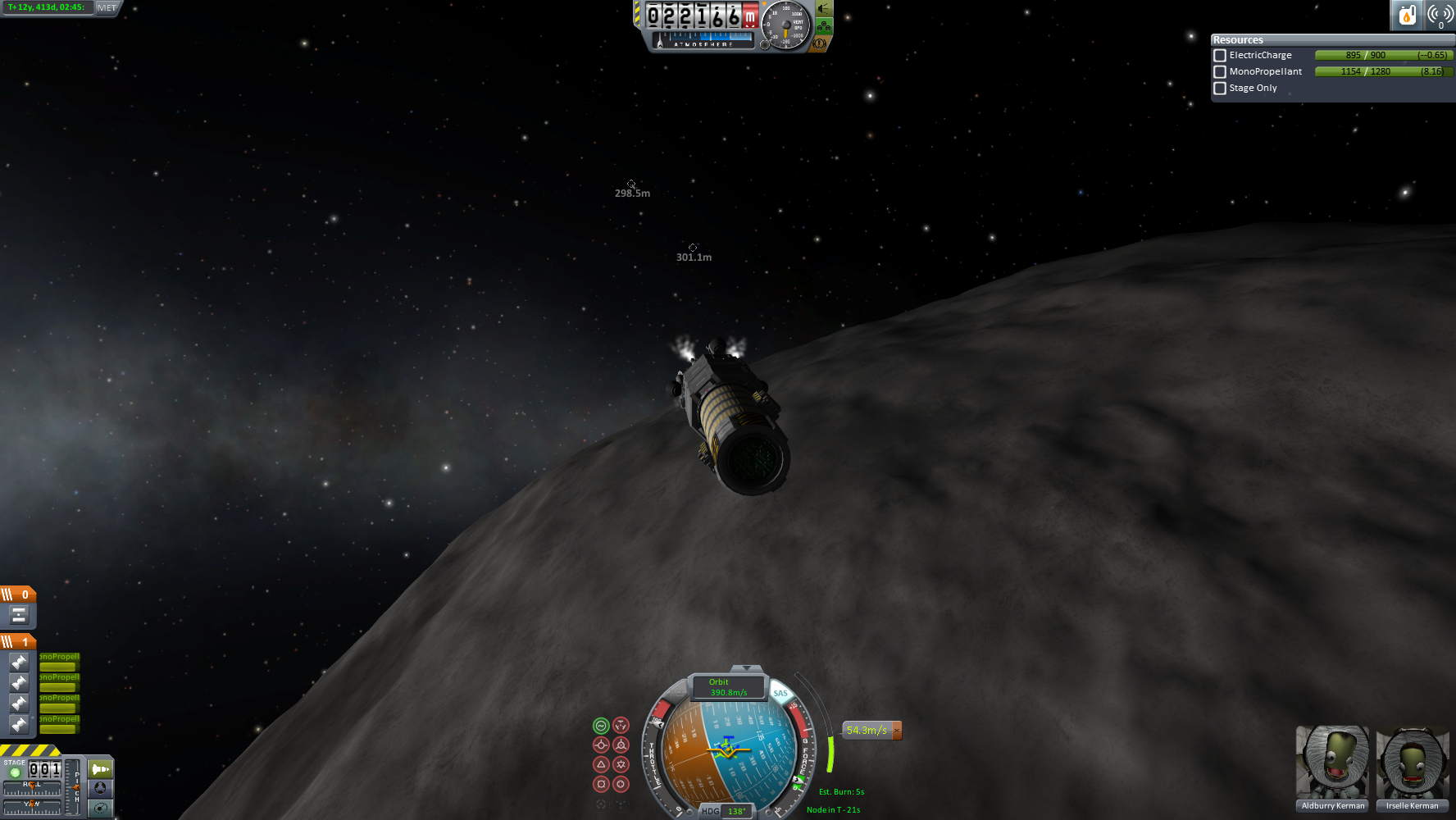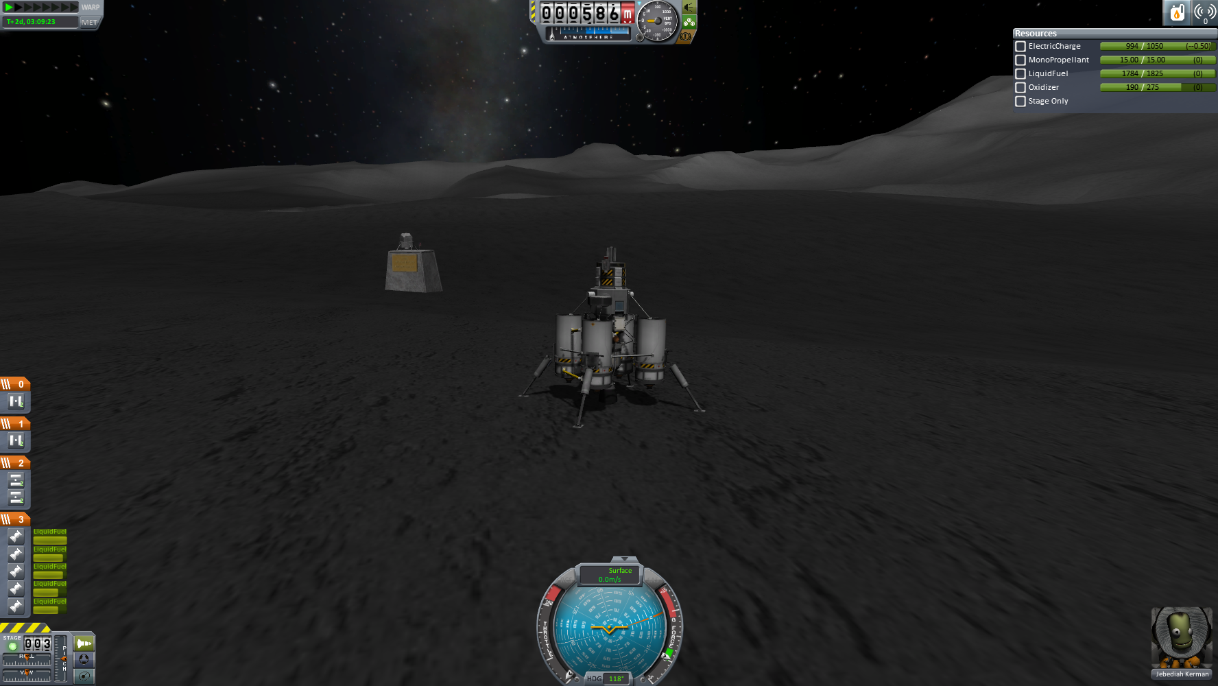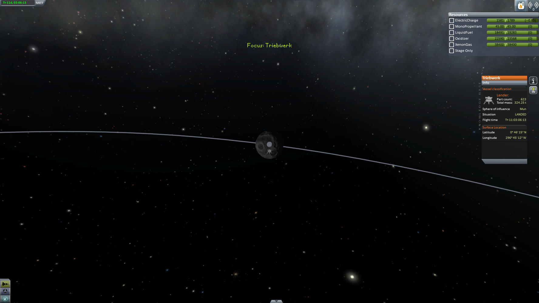 Die Landung verlief problemlos und der Lander hat noch genug Sprit um wieder in den Orbit zu kommen.Betrachtet den übrigen Treibstoff im Mohoorbit sieht man, dass ein Rückflug wahrscheinlich möglich gewesen wäre, wenn das Schiff besser gestaltet wäre. Hierzu hätten die Xenontanks direkt auf dem Ionentriebwerk angebracht und mit Sitzgelegenheiten versehen werden müssen.. Der Lander müsste an der Spitze positioniert werden.