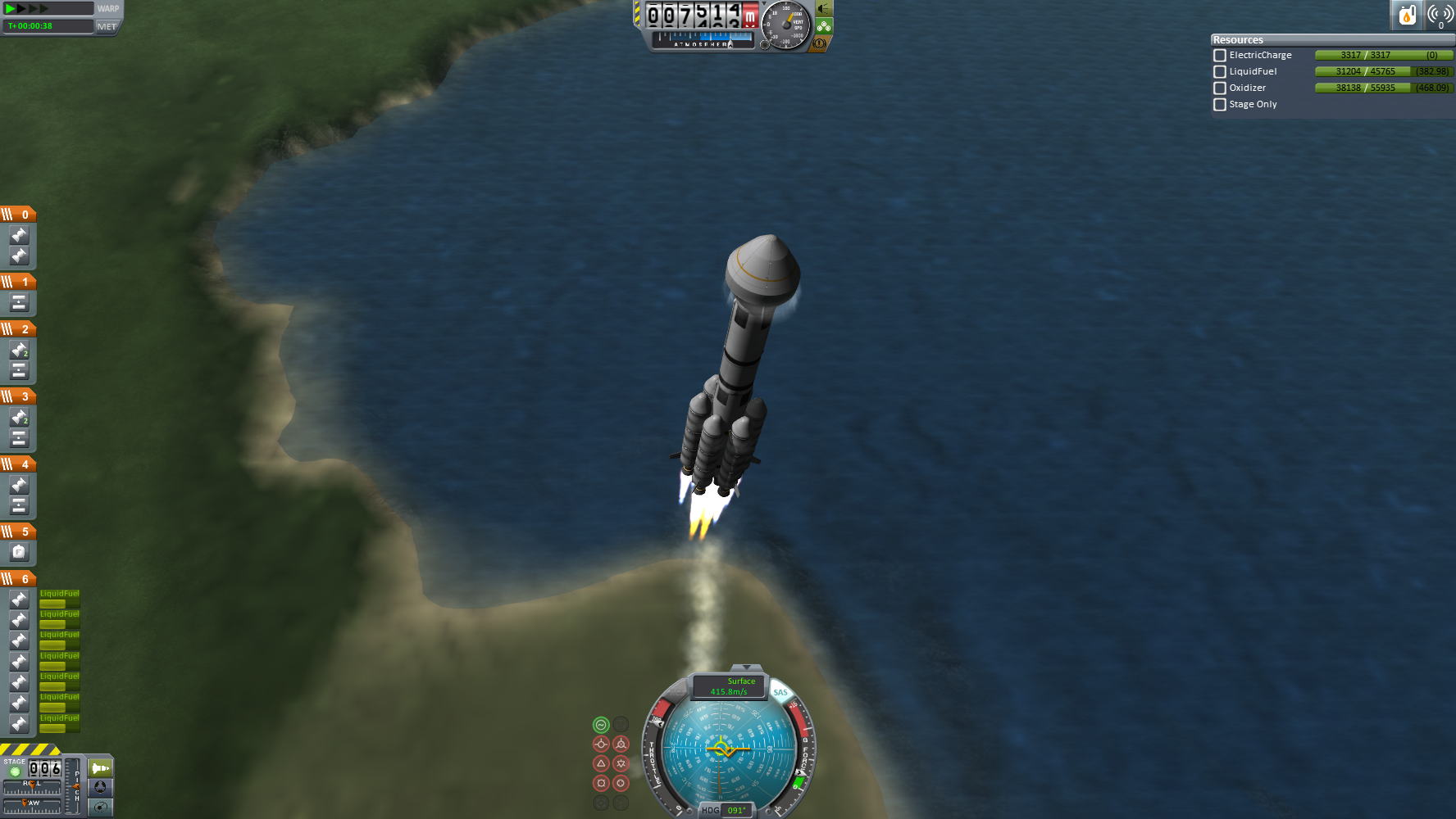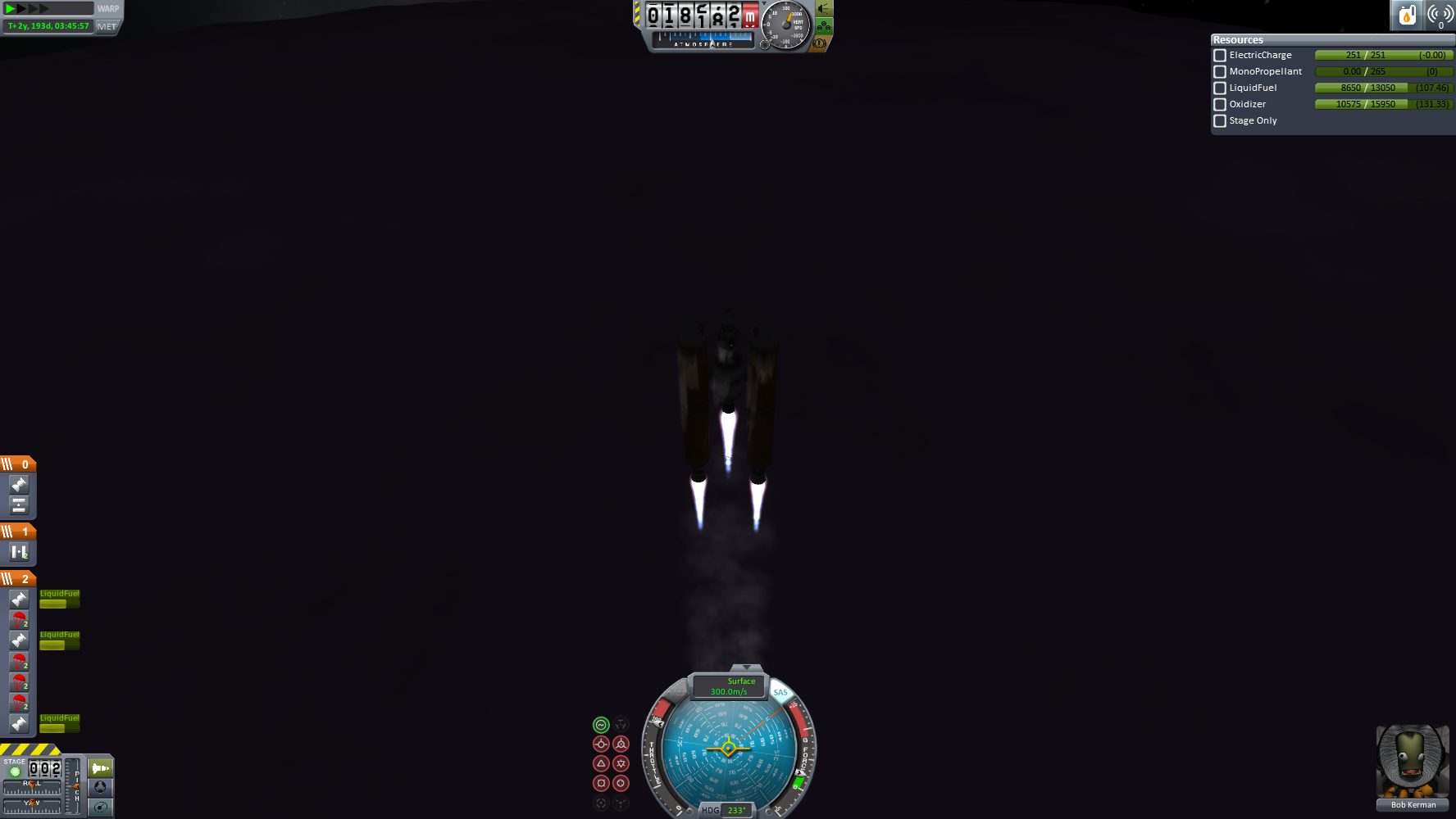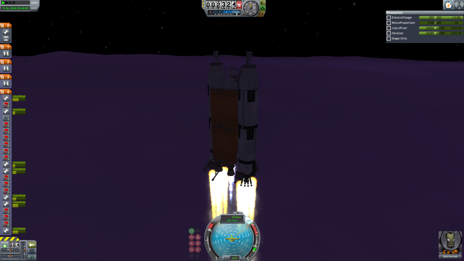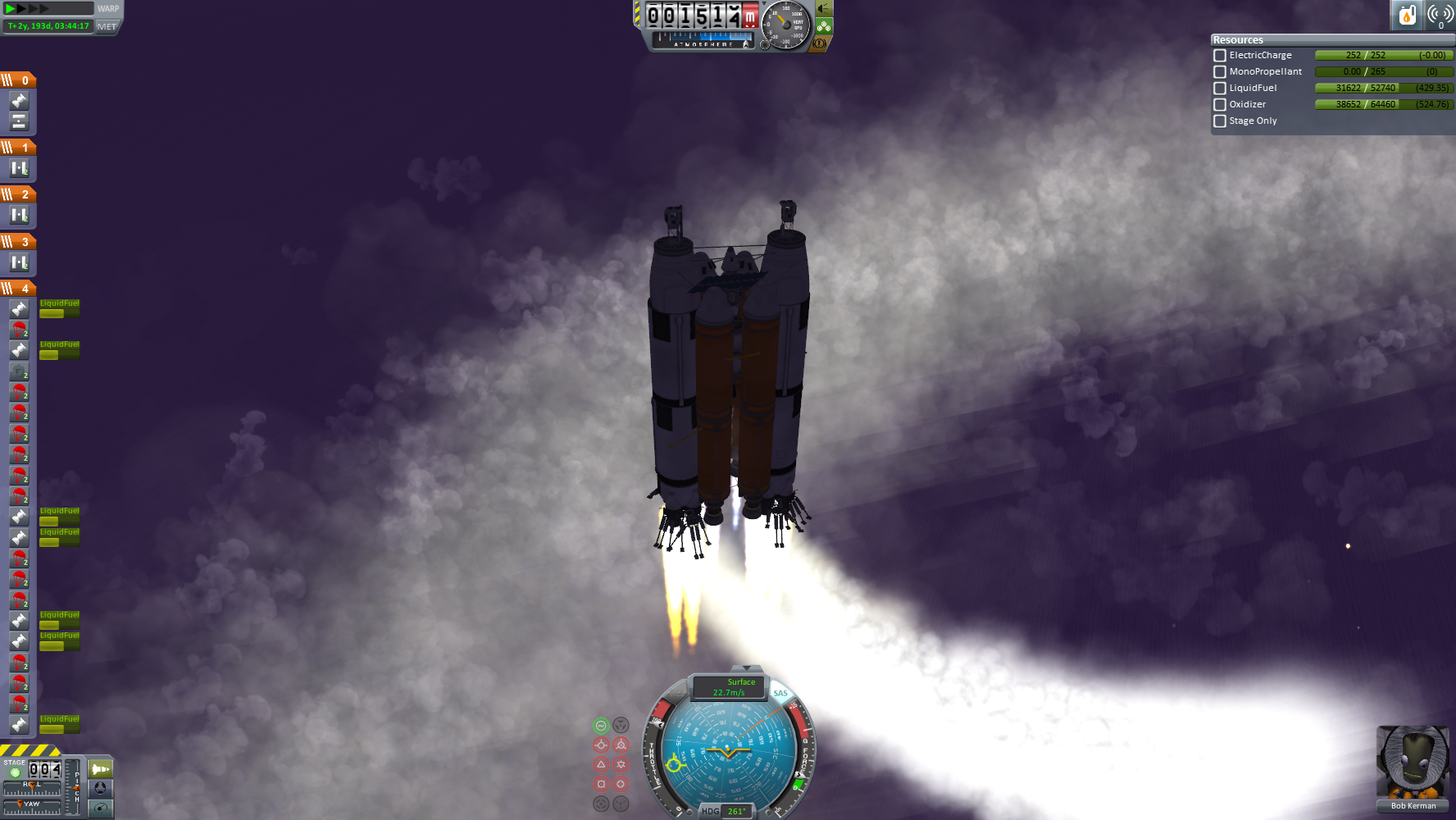 Beim Schub-Gewichtsverhältnis habe ich mich verkaltkuliert. Durch die höhere Anziehungskraft von Eve kann das Schiff vollgetankt nicht abheben. Die ersten beiden Boosterpaare sind aus diesem Grund nur zur Hälfte befüllt.