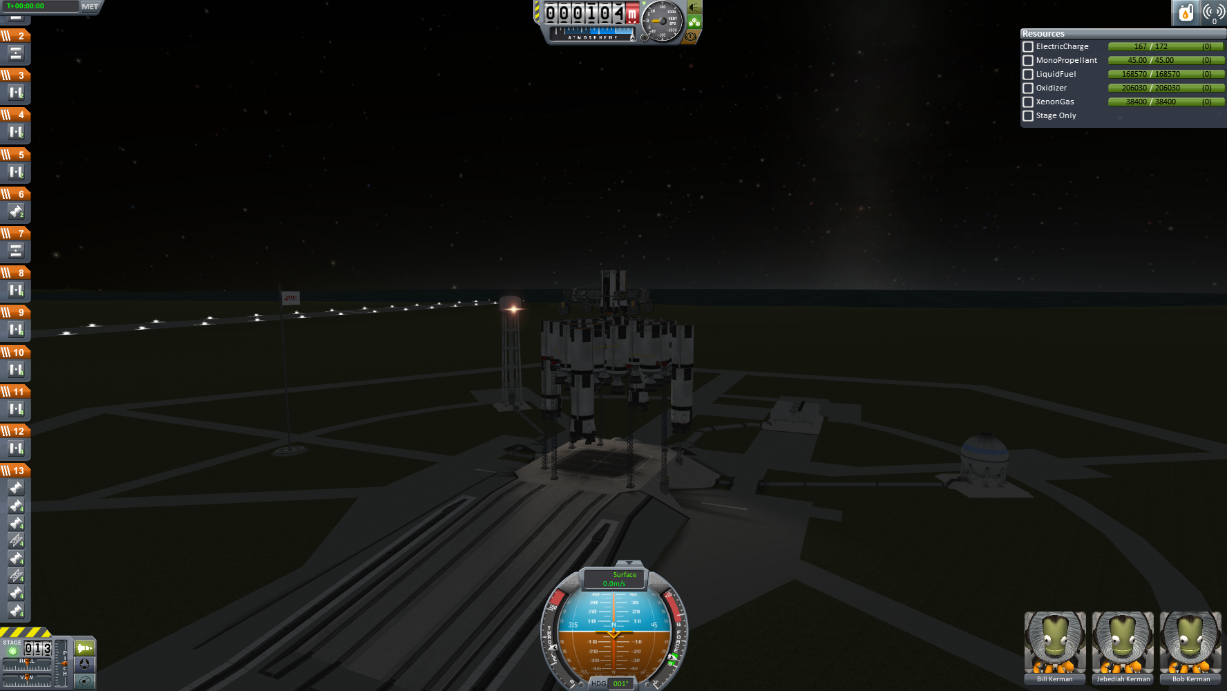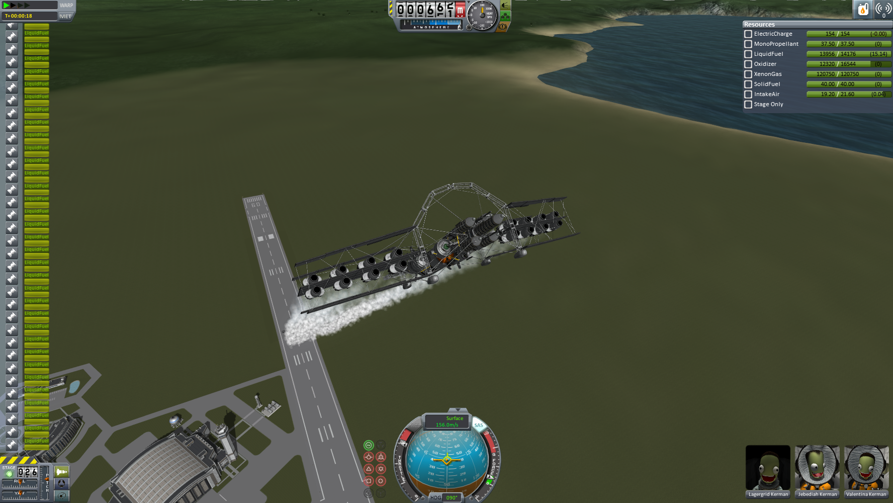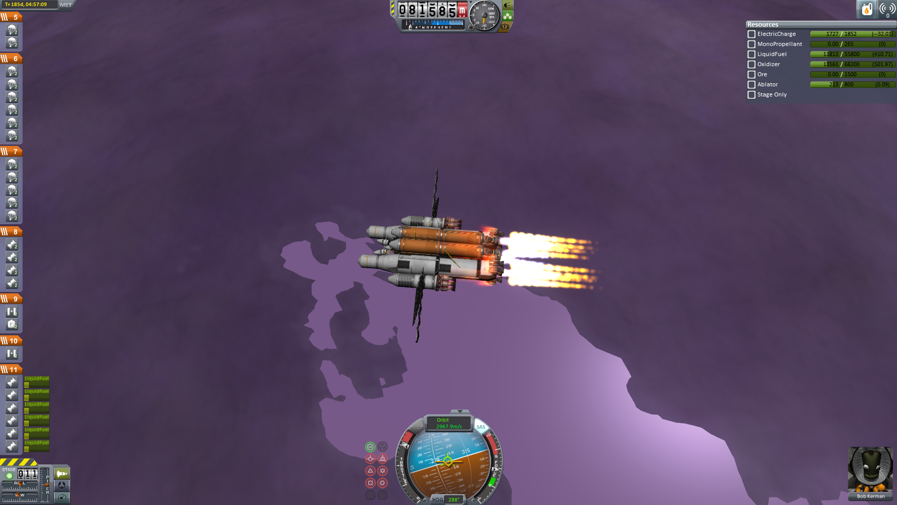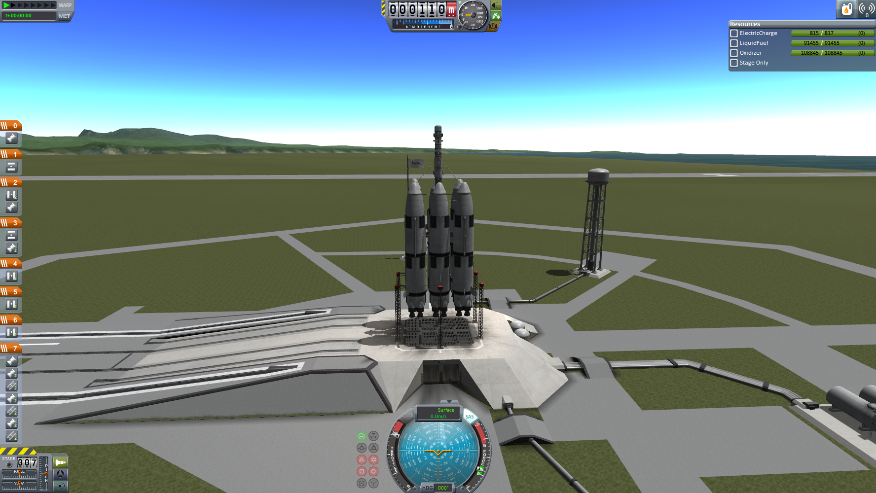 Beim Schub-Gewichtsverhältnis habe ich mich verkaltkuliert. Durch die höhere Anziehungskraft von Eve kann das Schiff vollgetankt nicht abheben. Die ersten beiden Boosterpaare sind aus diesem Grund nur zur Hälfte befüllt.