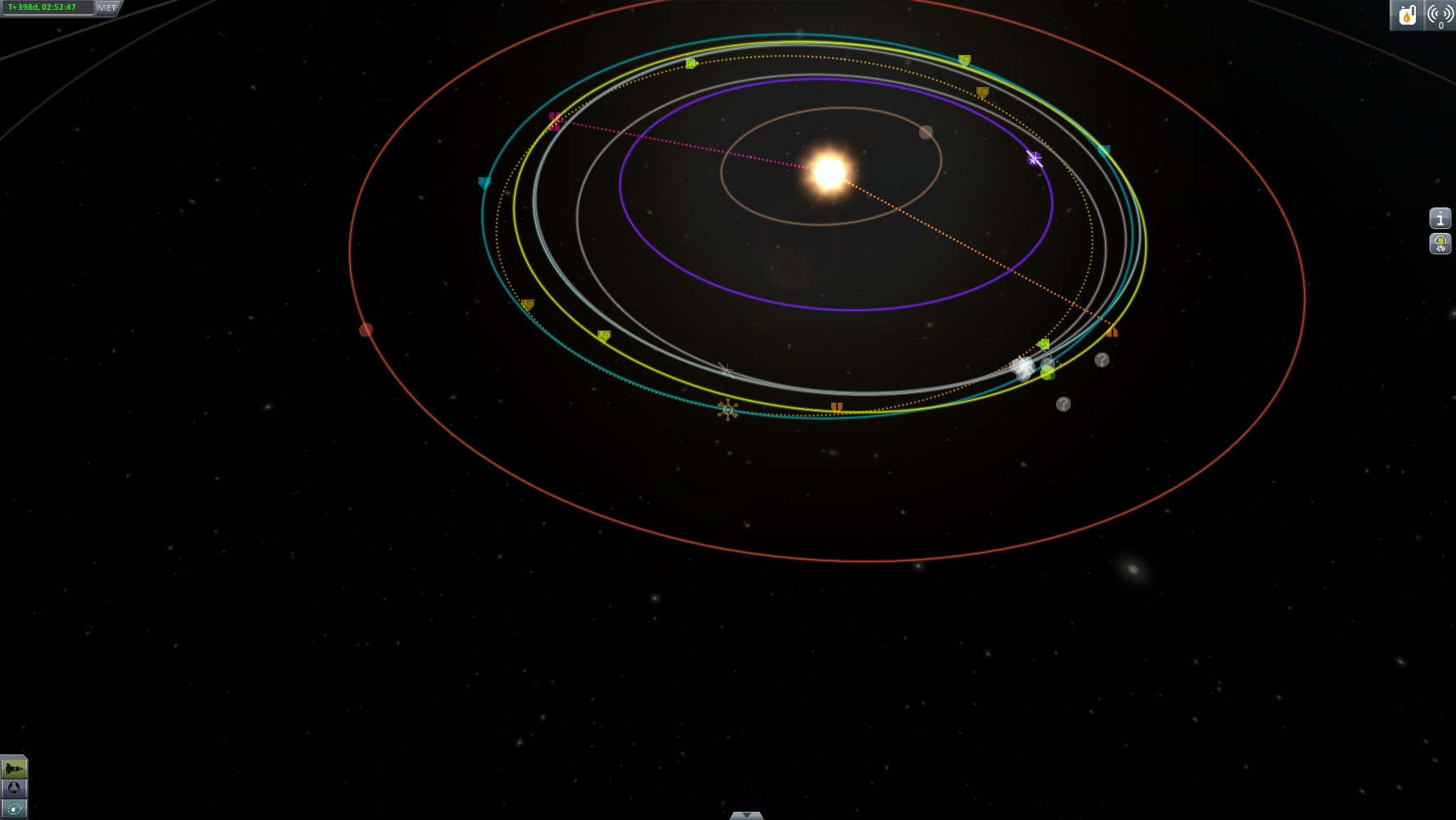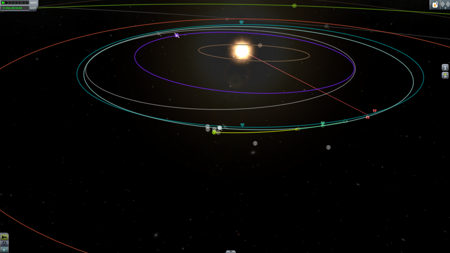 Beim Einschwenken in den Transferorbit hatte ich riesiges Glück, dass die Position der Planeten günstig war. So konnte ich bereits nach einem viertel Jahr mit dem Manöver beginnen. -