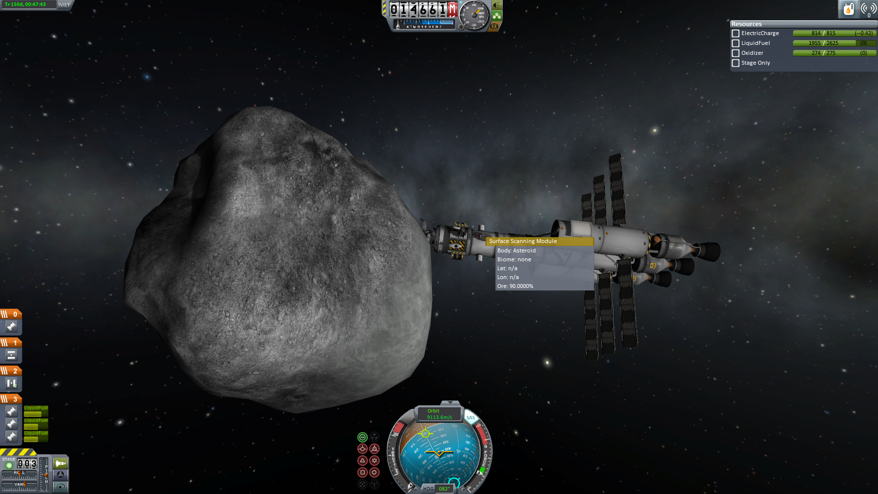 Hier stoße ich fast alle übrig gebliebenen Xenontanks ab, um für die bevorstehende Landung möglichst leicht zu werden. Damit es nicht wieder zum Zusammenstoß kommt, habe ich vorher die Ausrichtung des Raumschiffen geändert. Im Endanflug wird das Ionentriebwerk und alle verbliebenen Xenontanks abgeworfen. Der restliche Landeanflug wird mit konventionellen Triebwerken durchgeführt.