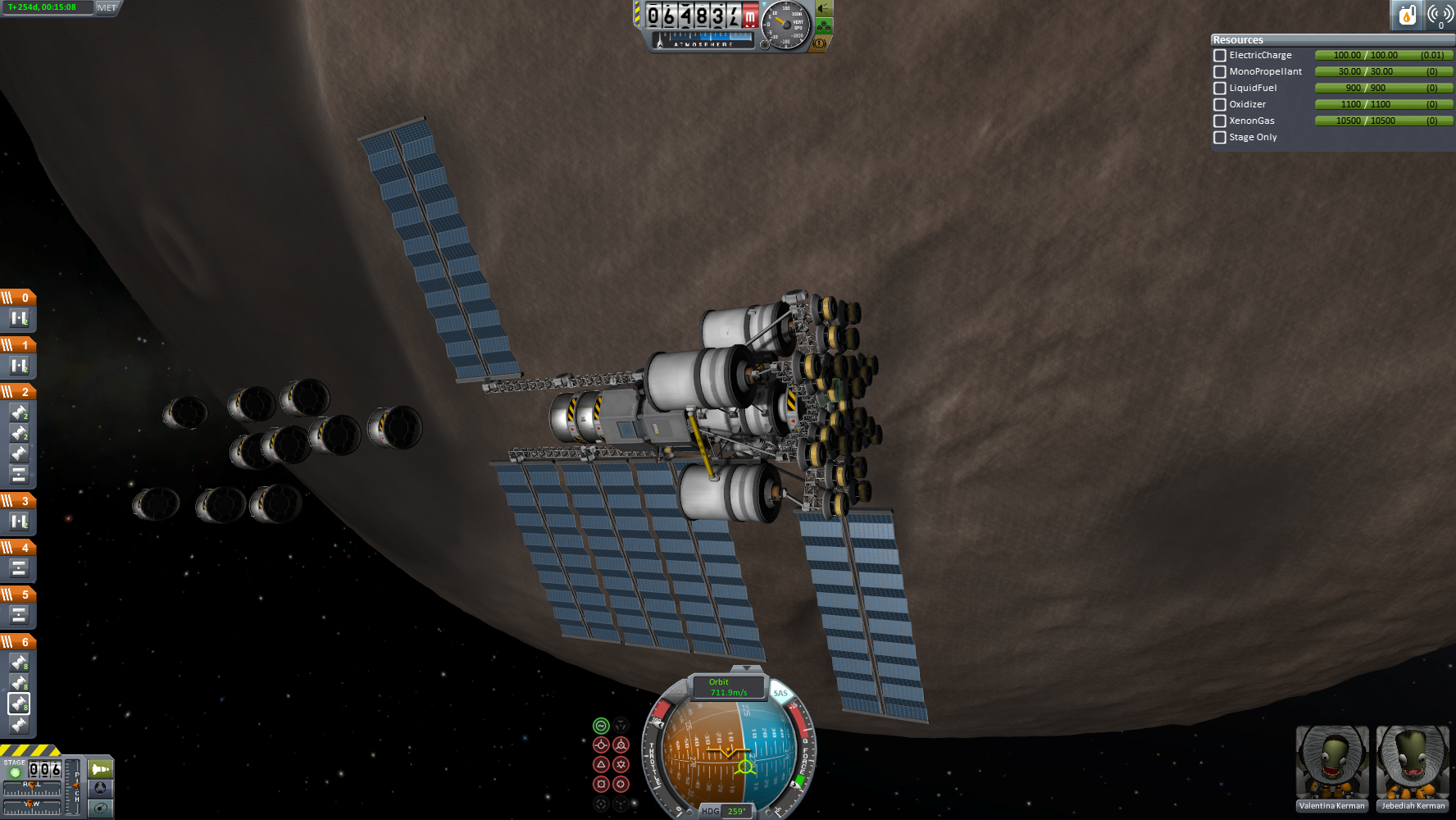 Hier stoße ich fast alle übrig gebliebenen Xenontanks ab, um für die bevorstehende Landung möglichst leicht zu werden. Damit es nicht wieder zum Zusammenstoß kommt, habe ich vorher die Ausrichtung des Raumschiffen geändert. Im Endanflug wird das Ionentriebwerk und alle verbliebenen Xenontanks abgeworfen. Der restliche Landeanflug wird mit konventionellen Triebwerken durchgeführt.