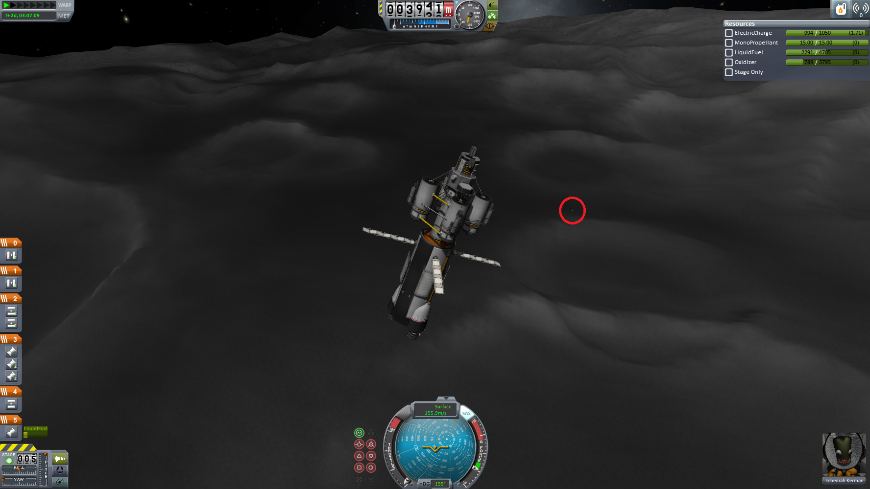 Die Landung verlief problemlos und der Lander hat noch genug Sprit um wieder in den Orbit zu kommen.Betrachtet den übrigen Treibstoff im Mohoorbit sieht man, dass ein Rückflug wahrscheinlich möglich gewesen wäre, wenn das Schiff besser gestaltet wäre. Hierzu hätten die Xenontanks direkt auf dem Ionentriebwerk angebracht und mit Sitzgelegenheiten versehen werden müssen.. Der Lander müsste an der Spitze positioniert werden.