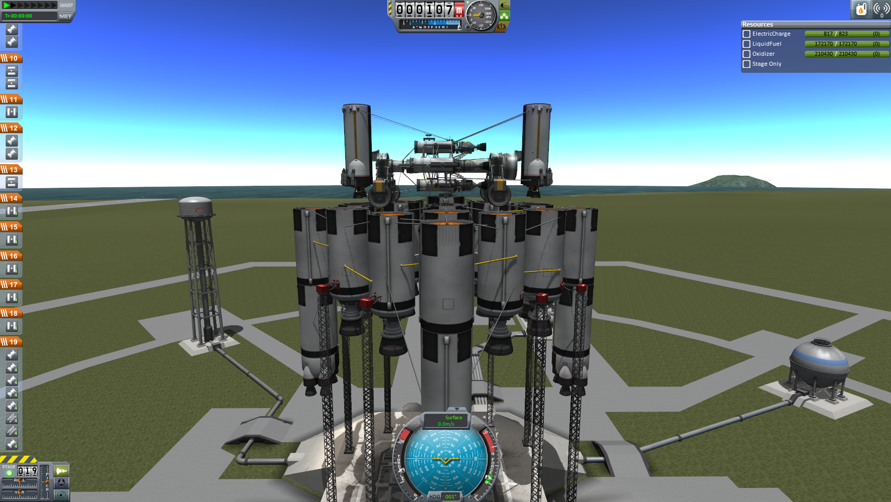 Beim Schub-Gewichtsverhältnis habe ich mich verkaltkuliert. Durch die höhere Anziehungskraft von Eve kann das Schiff vollgetankt nicht abheben. Die ersten beiden Boosterpaare sind aus diesem Grund nur zur Hälfte befüllt.