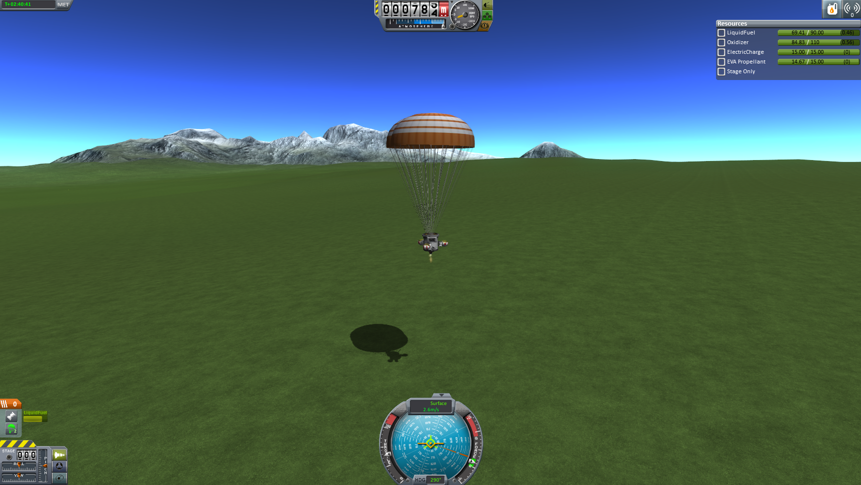 Die Landung verlief problemlos und der Lander hat noch genug Sprit um wieder in den Orbit zu kommen.Betrachtet den übrigen Treibstoff im Mohoorbit sieht man, dass ein Rückflug wahrscheinlich möglich gewesen wäre, wenn das Schiff besser gestaltet wäre. Hierzu hätten die Xenontanks direkt auf dem Ionentriebwerk angebracht und mit Sitzgelegenheiten versehen werden müssen.. Der Lander müsste an der Spitze positioniert werden.
