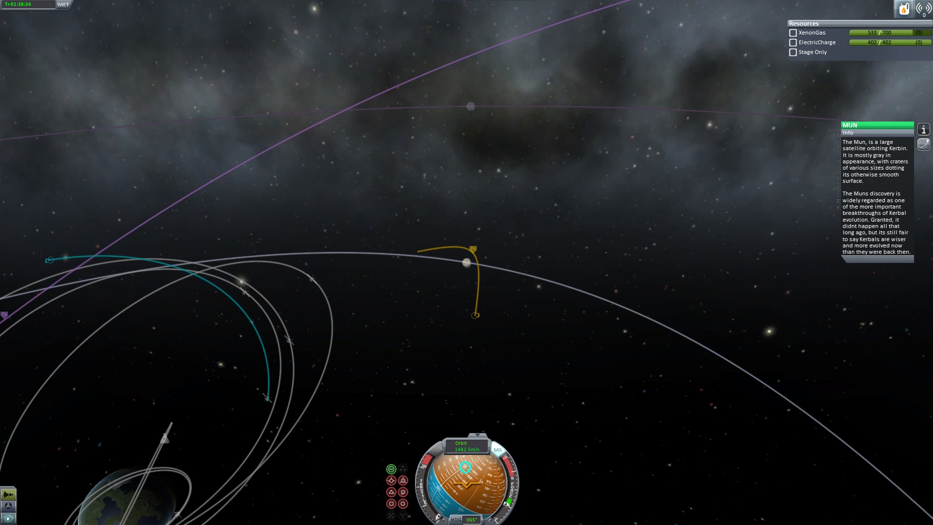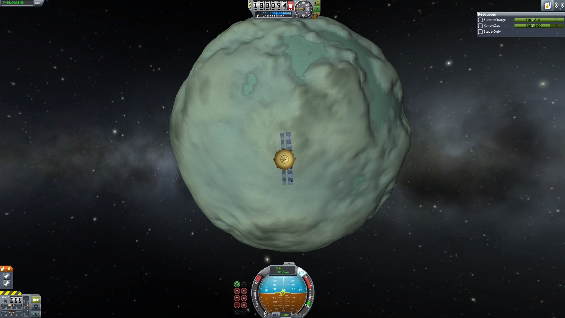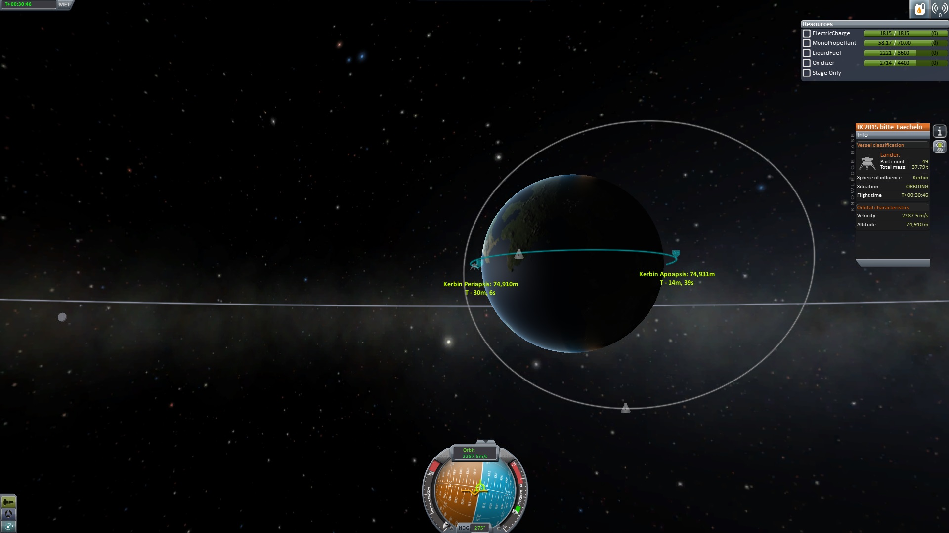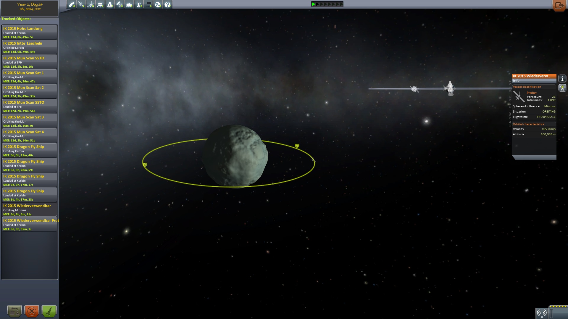Für die Sonde hieß es dann ab nach Minmus, was aber schon fast Routine ist. Nach dem Bremsmanöver und ein zwei Korrekturen nahm sie einen stabilen Orvit von 100km um Minmus ein.