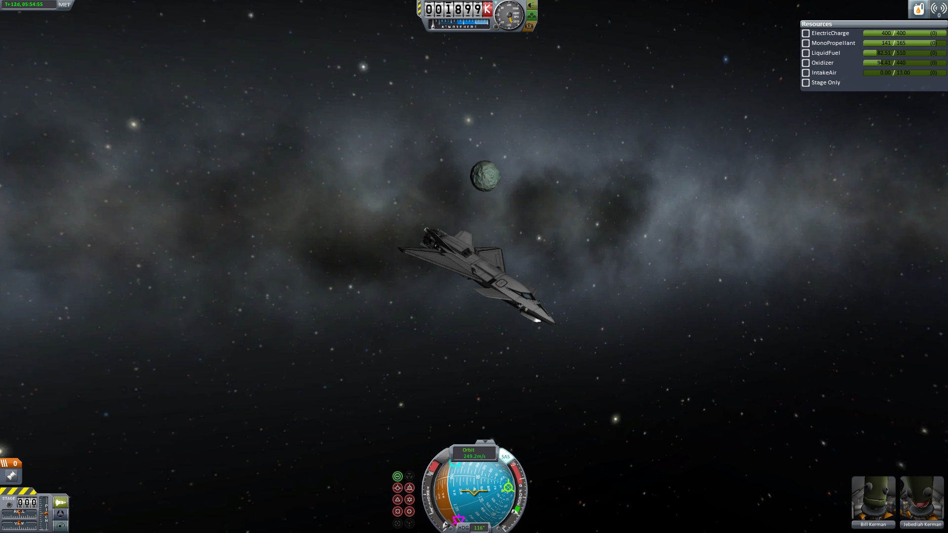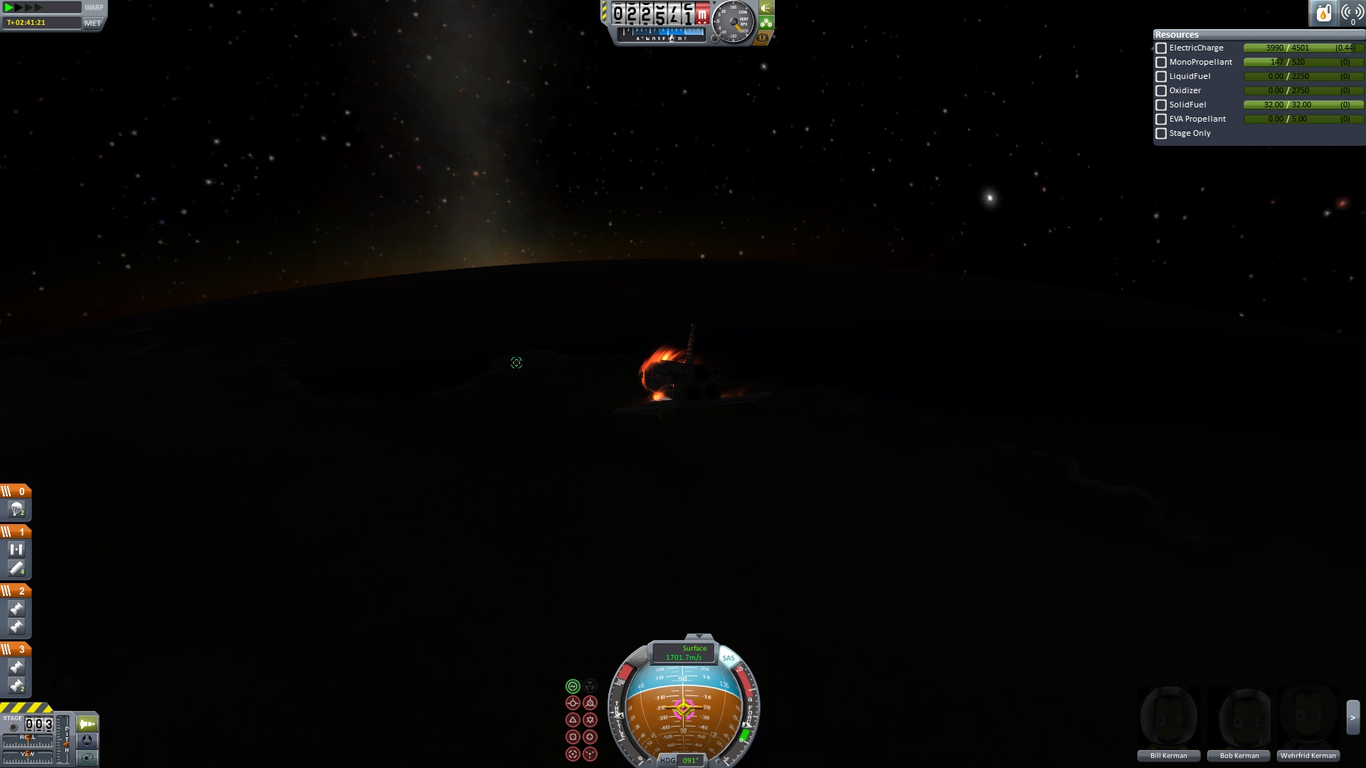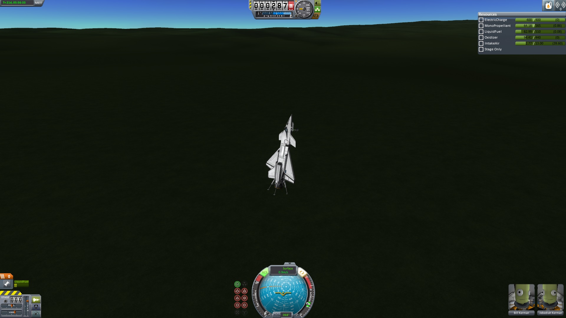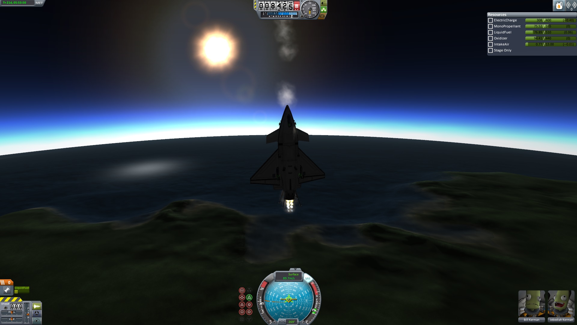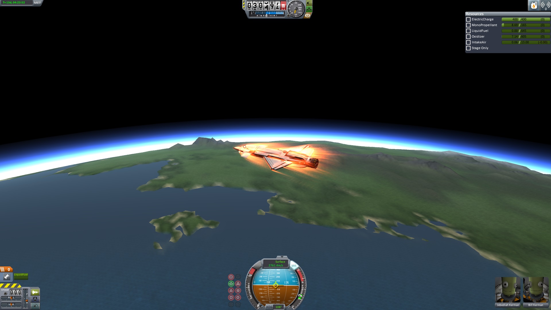 Nach dem Bill und Jebediah sich Minmus beim Vorbeiflug angeschaut hatten ging es zurück nach Kerbin wo die Landung auf Raketen/SSTO Art geplant war. Bill fand das nicht wirklich Witzig , Jeb schon.