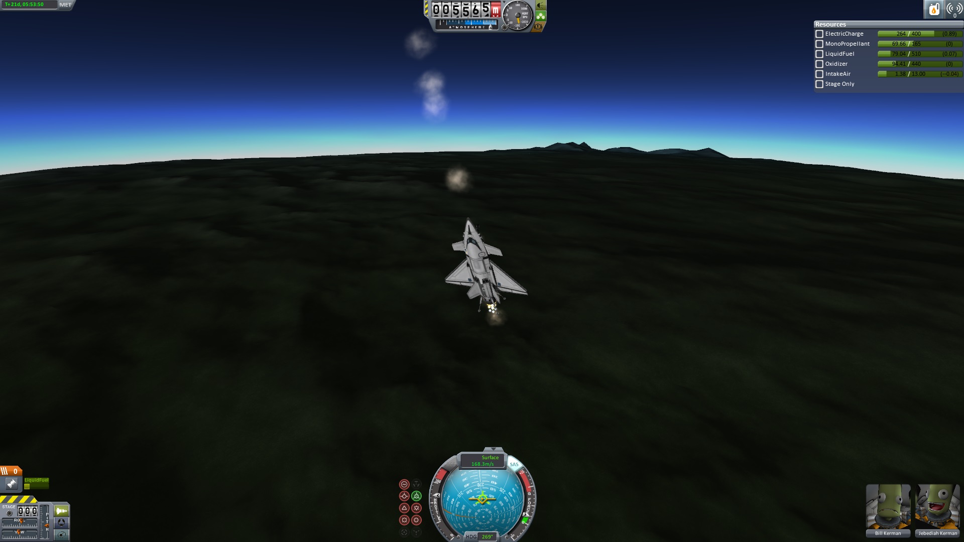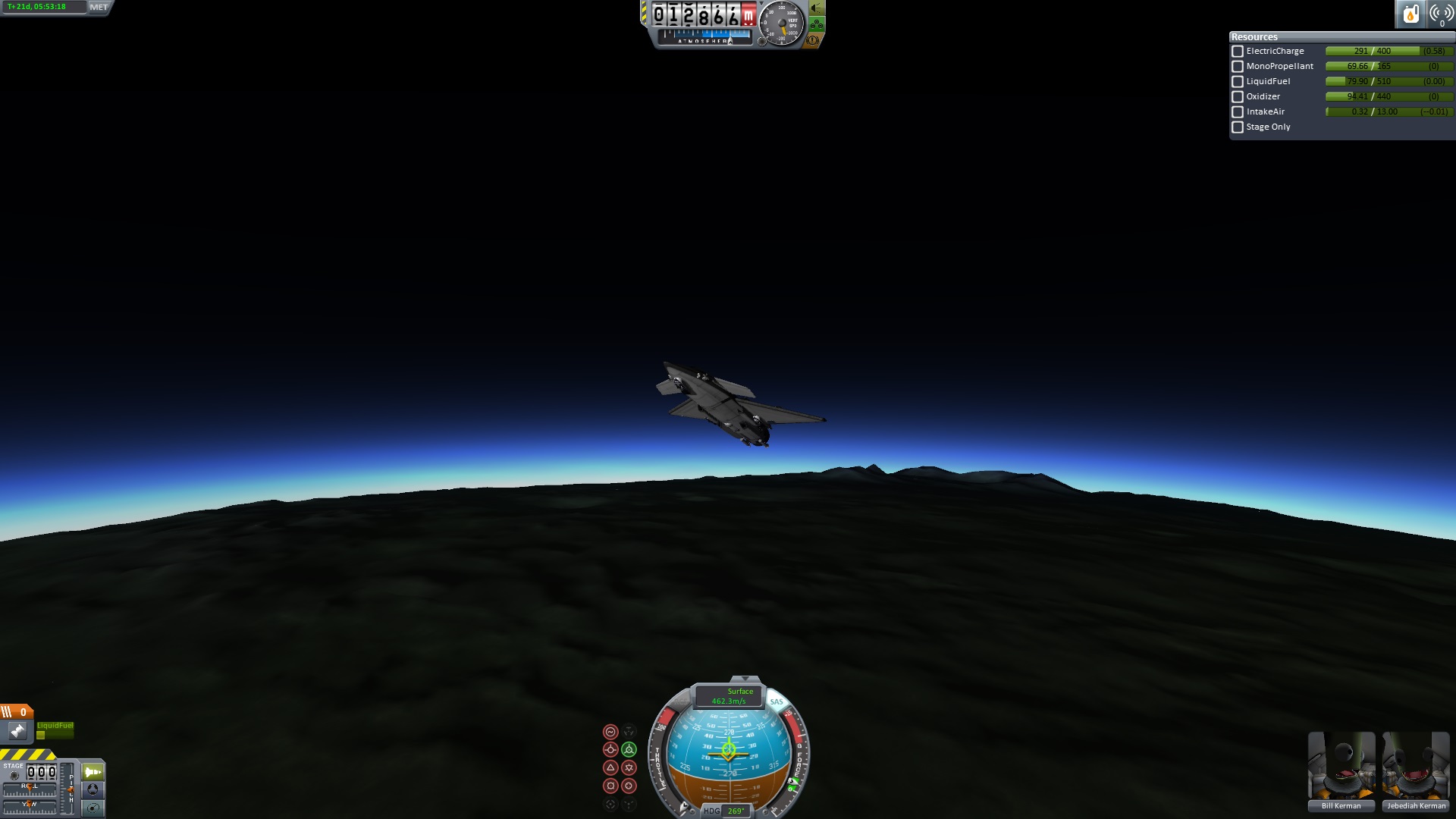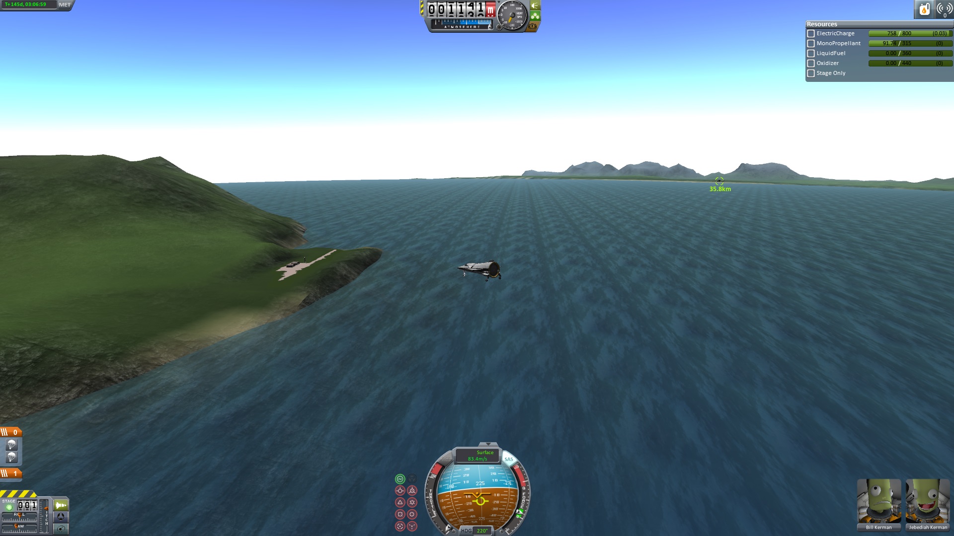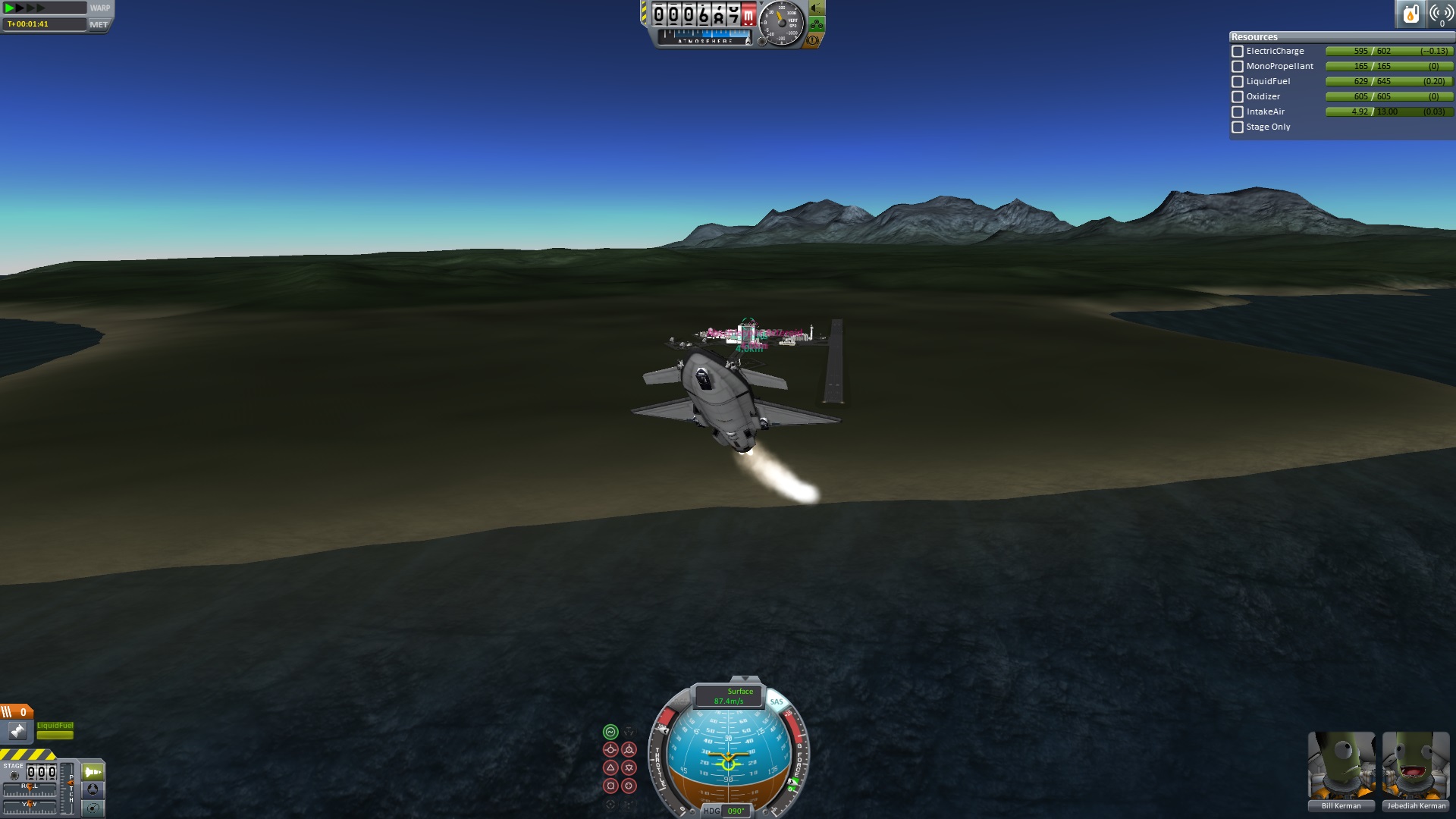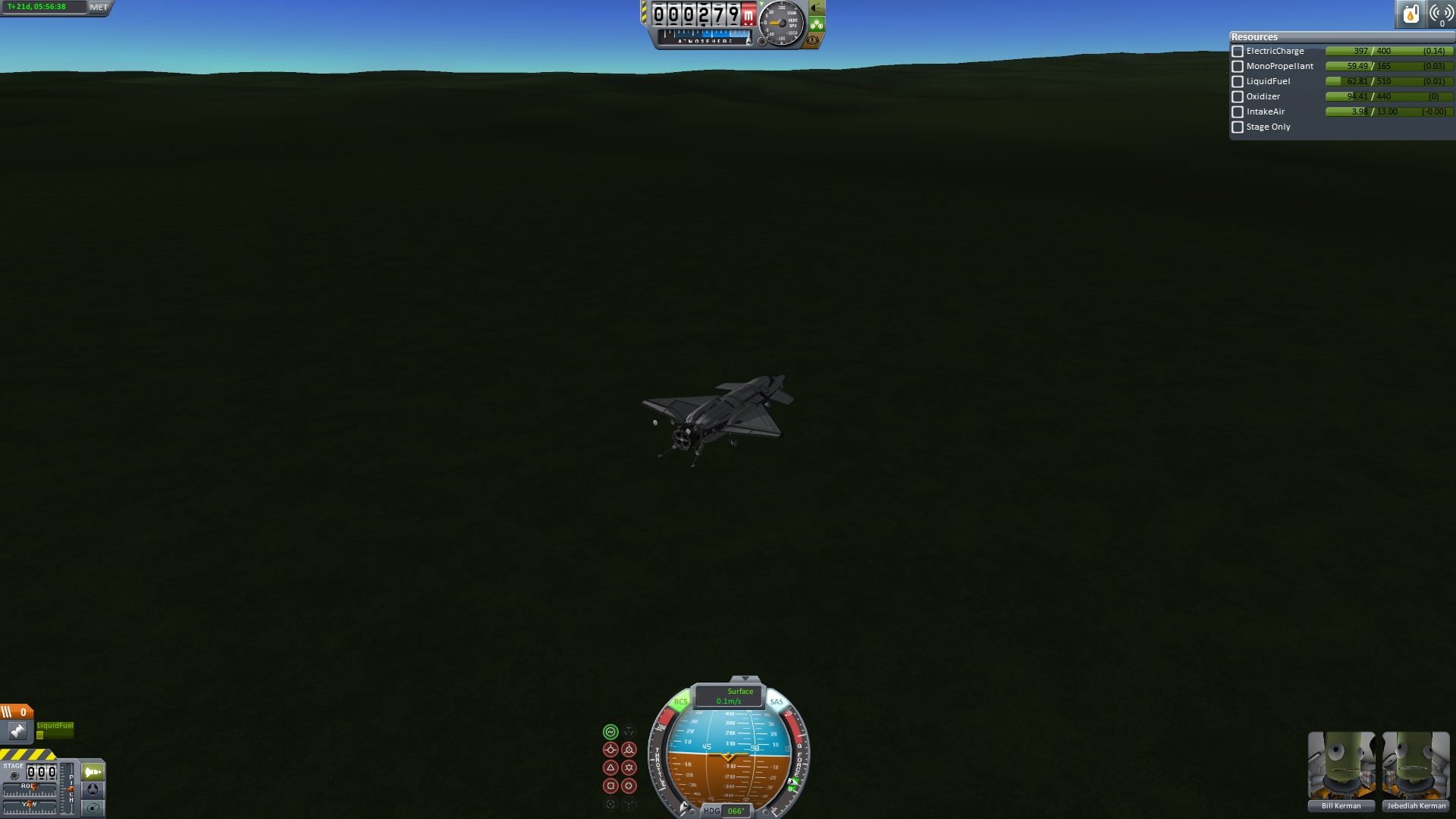Nach dem Bill und Jebediah sich Minmus beim Vorbeiflug angeschaut hatten ging es zurück nach Kerbin wo die Landung auf Raketen/SSTO Art geplant war. Bill fand das nicht wirklich Witzig , Jeb schon.
