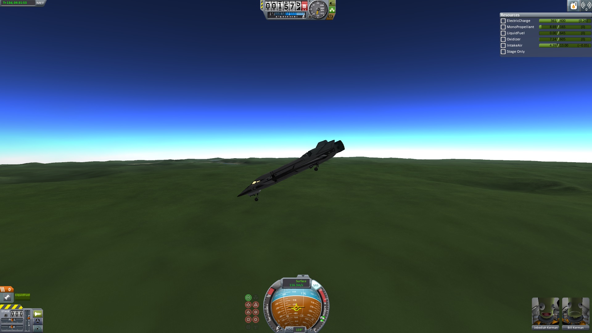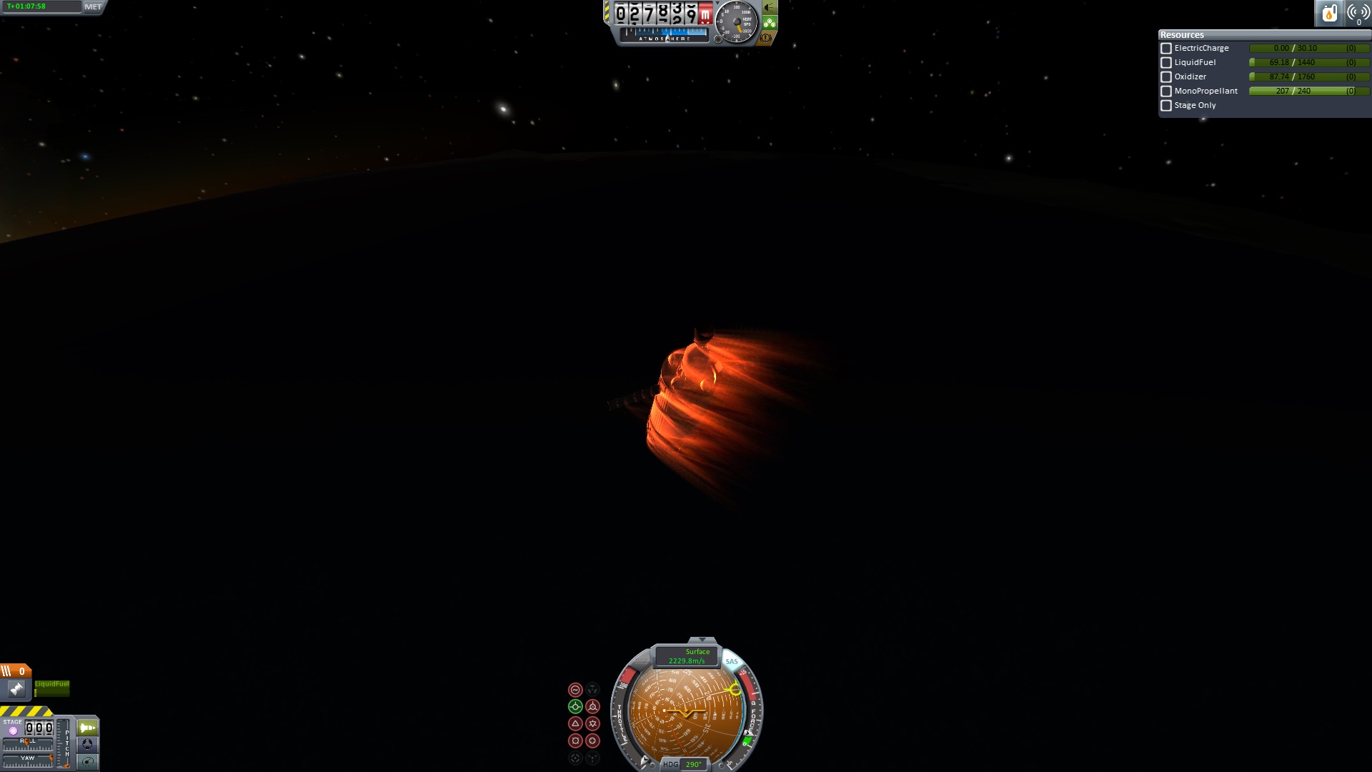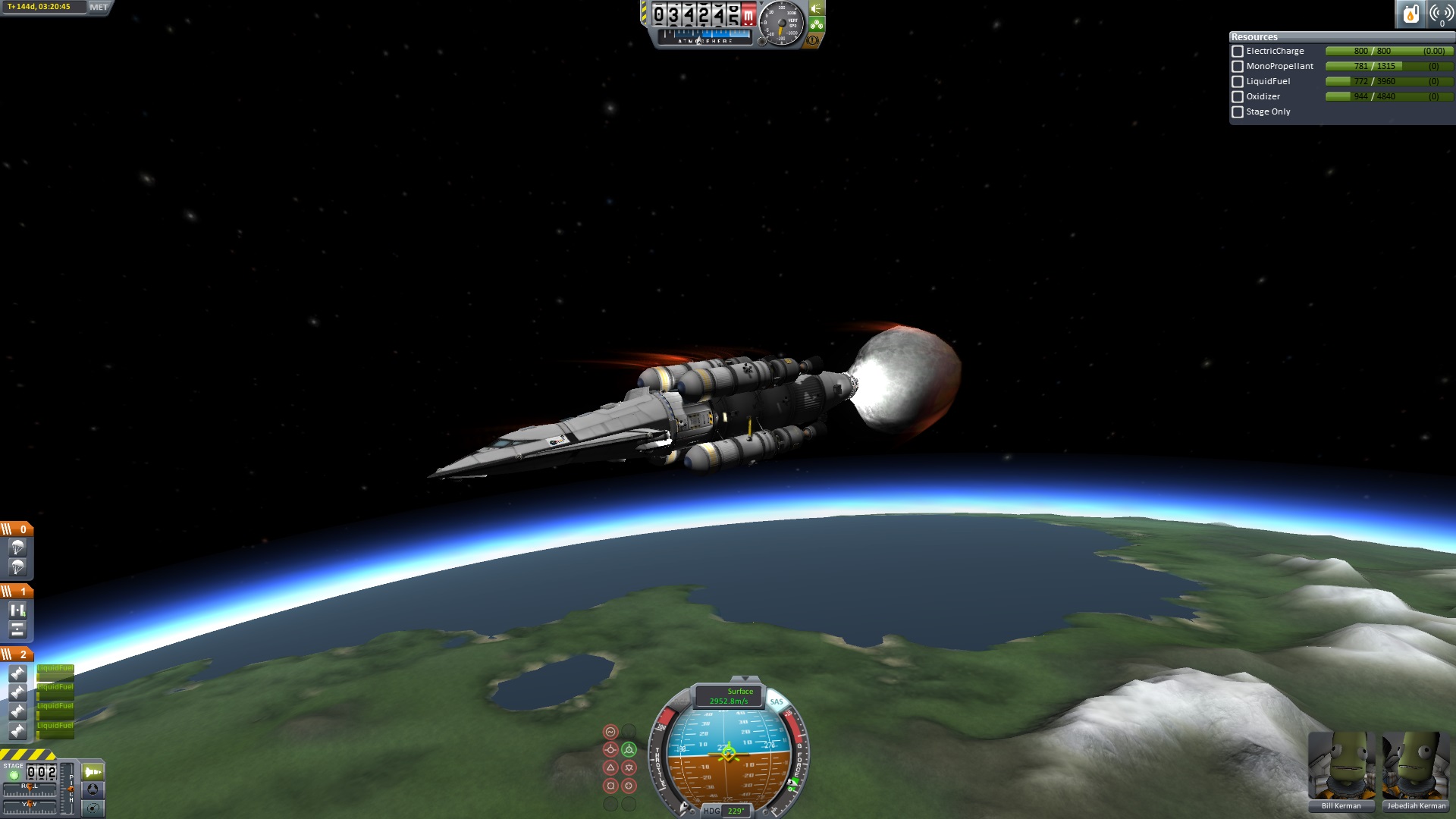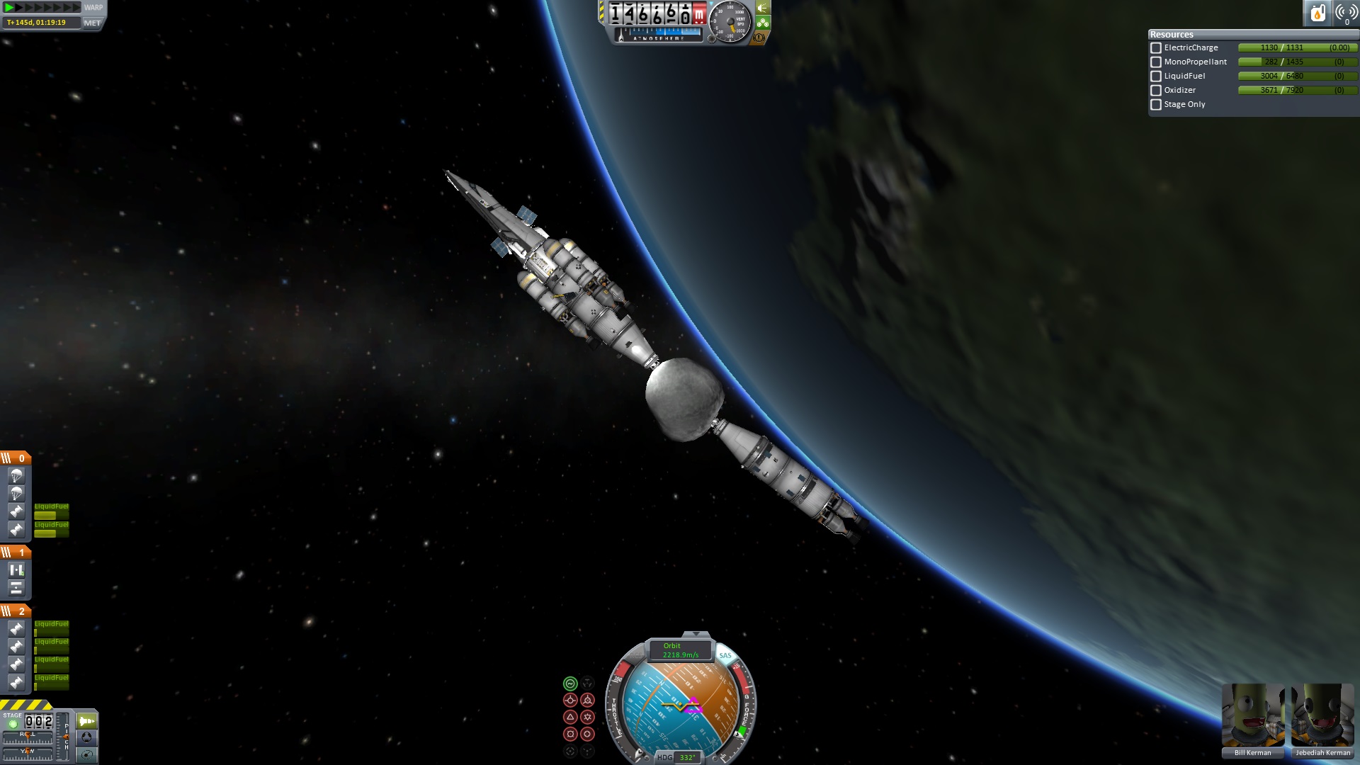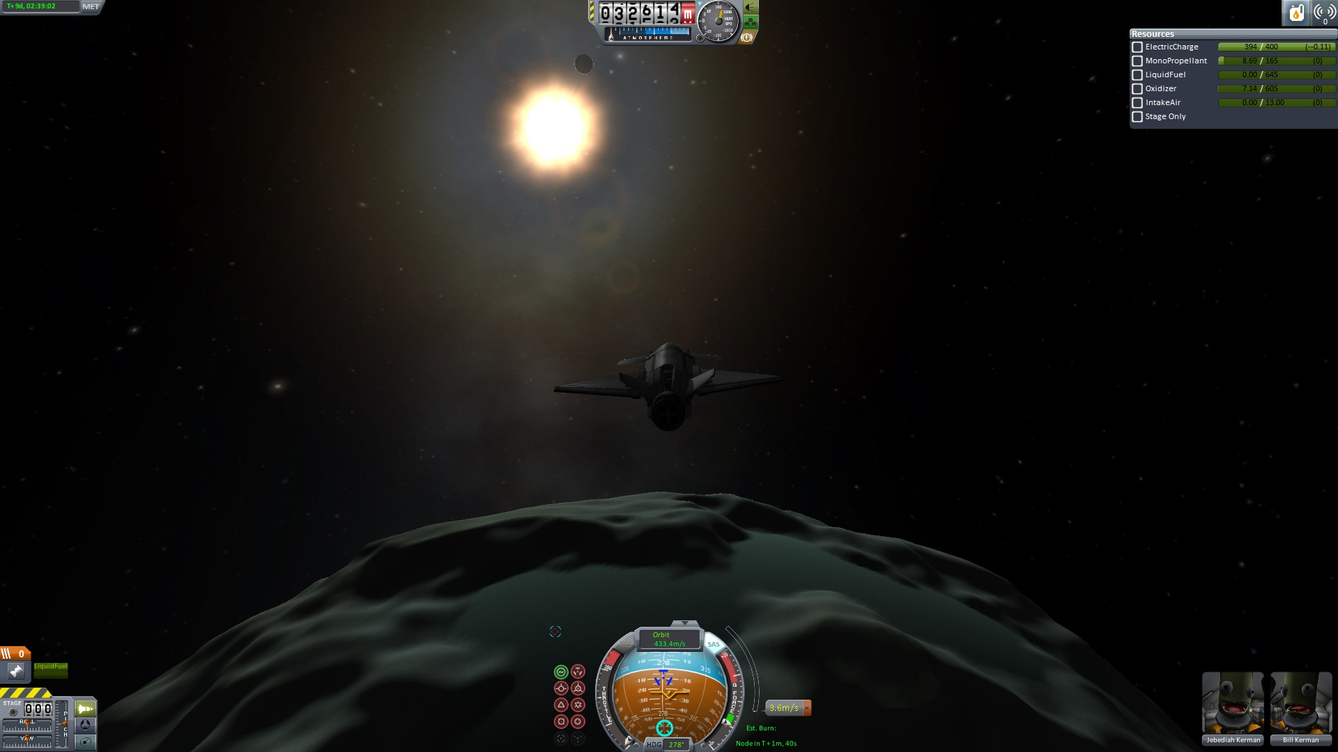 Nach dem Bill und Jebediah sich Minmus beim Vorbeiflug angeschaut hatten ging es zurück nach Kerbin wo die Landung auf Raketen/SSTO Art geplant war. Bill fand das nicht wirklich Witzig , Jeb schon.