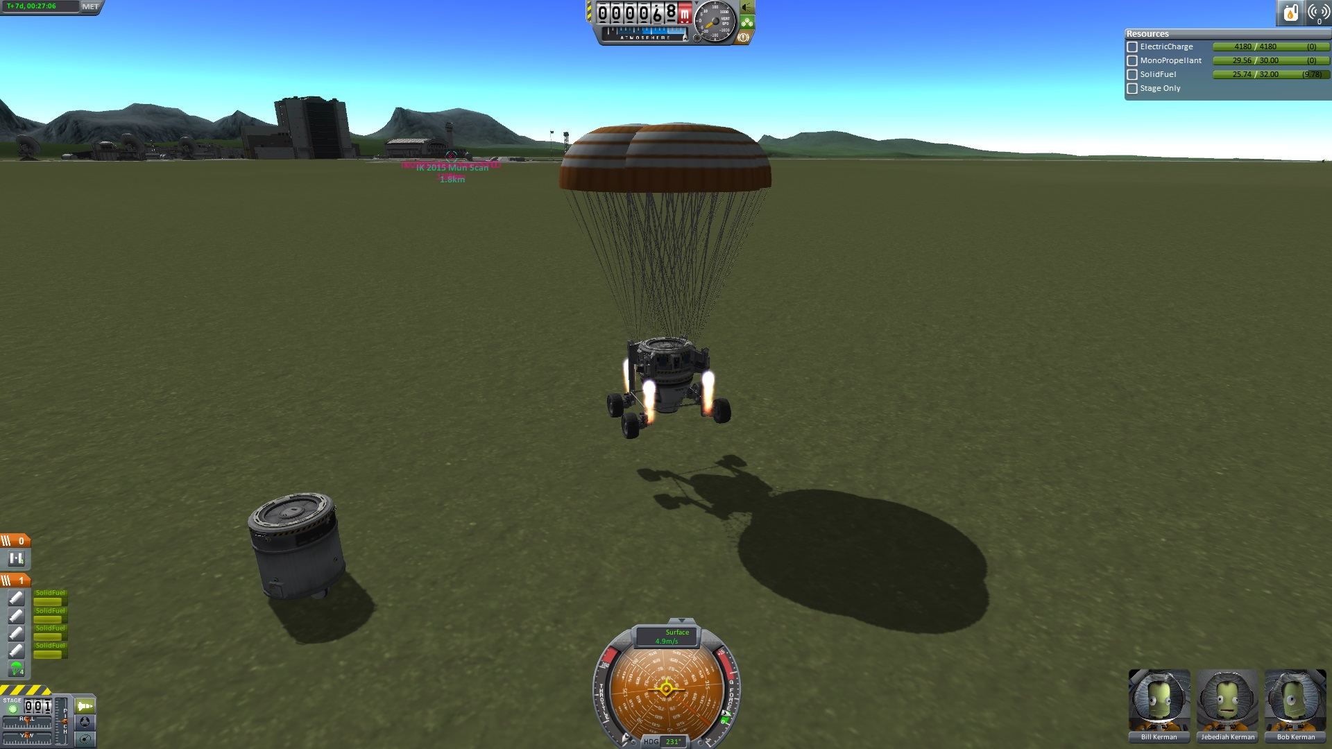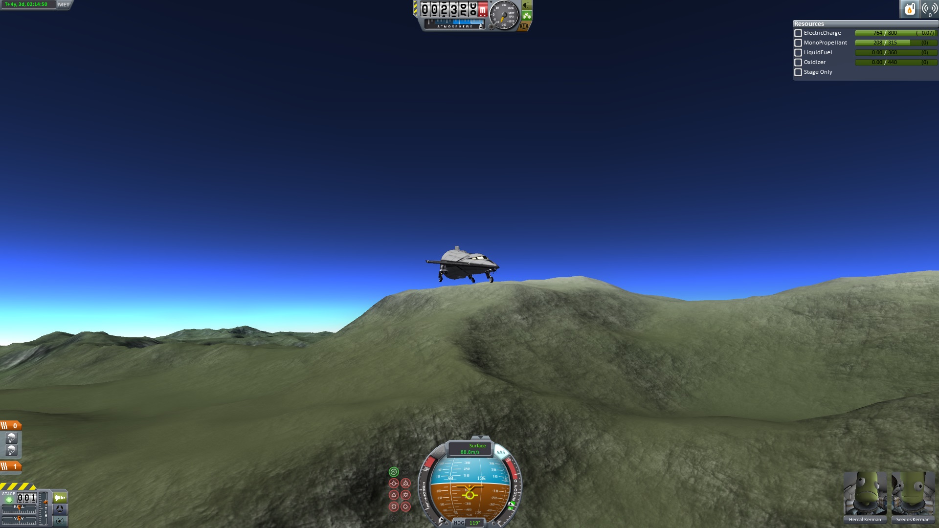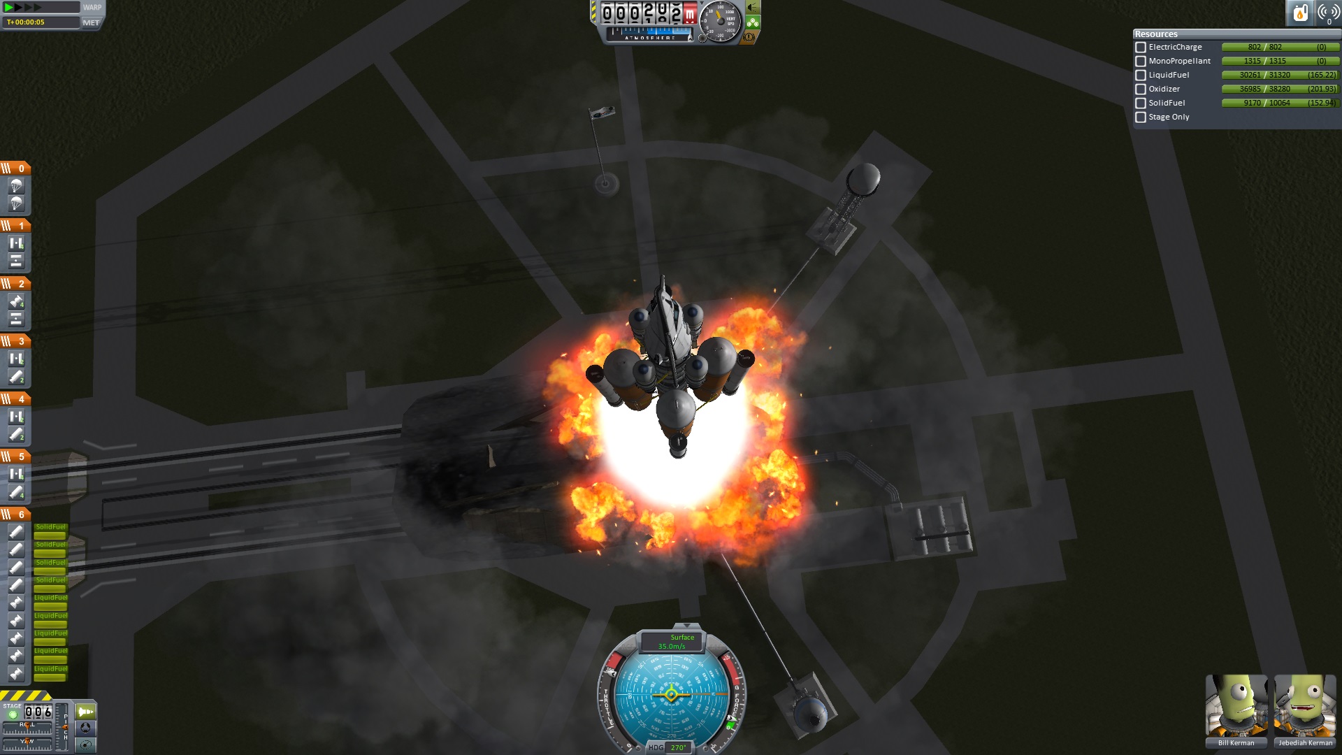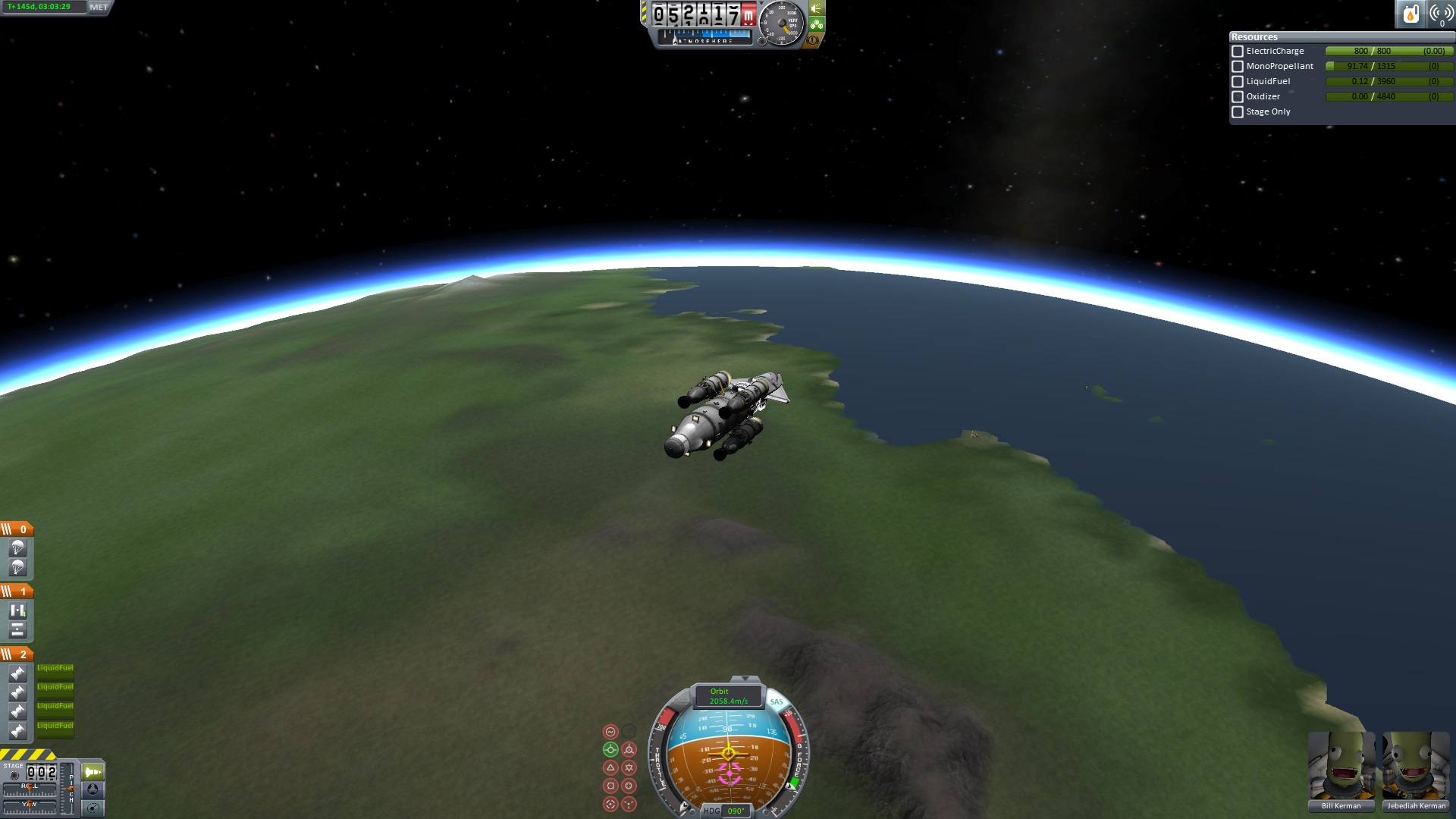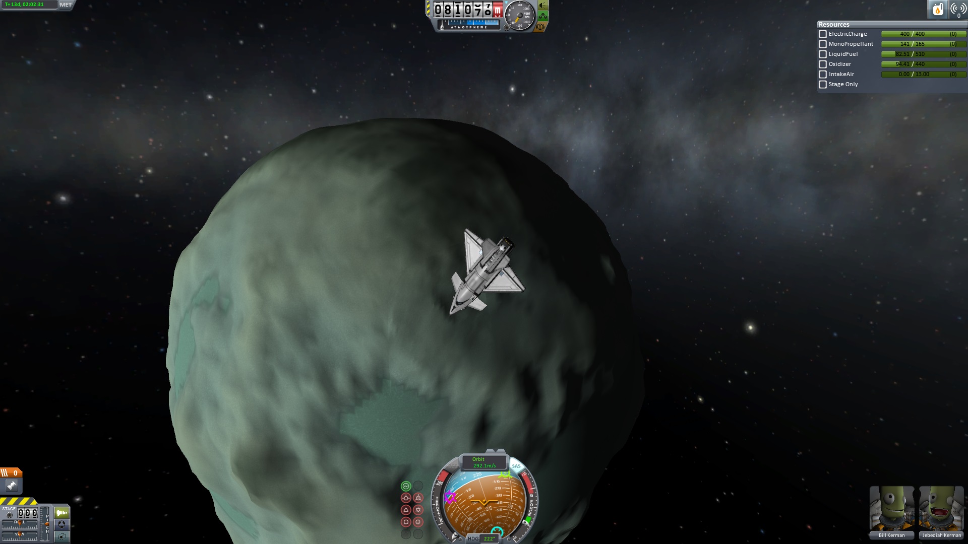 Nach dem Bill und Jebediah sich Minmus beim Vorbeiflug angeschaut hatten ging es zurück nach Kerbin wo die Landung auf Raketen/SSTO Art geplant war. Bill fand das nicht wirklich Witzig , Jeb schon.