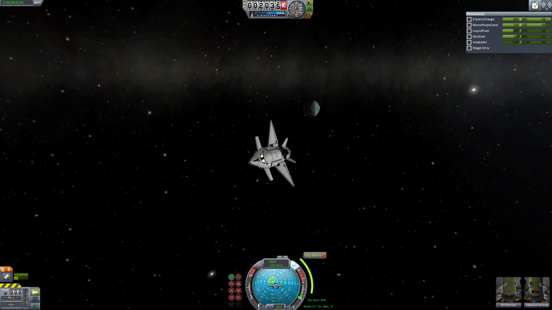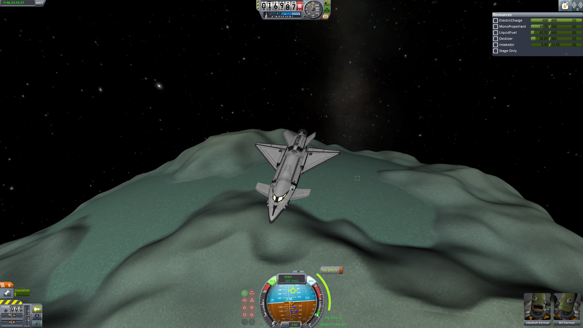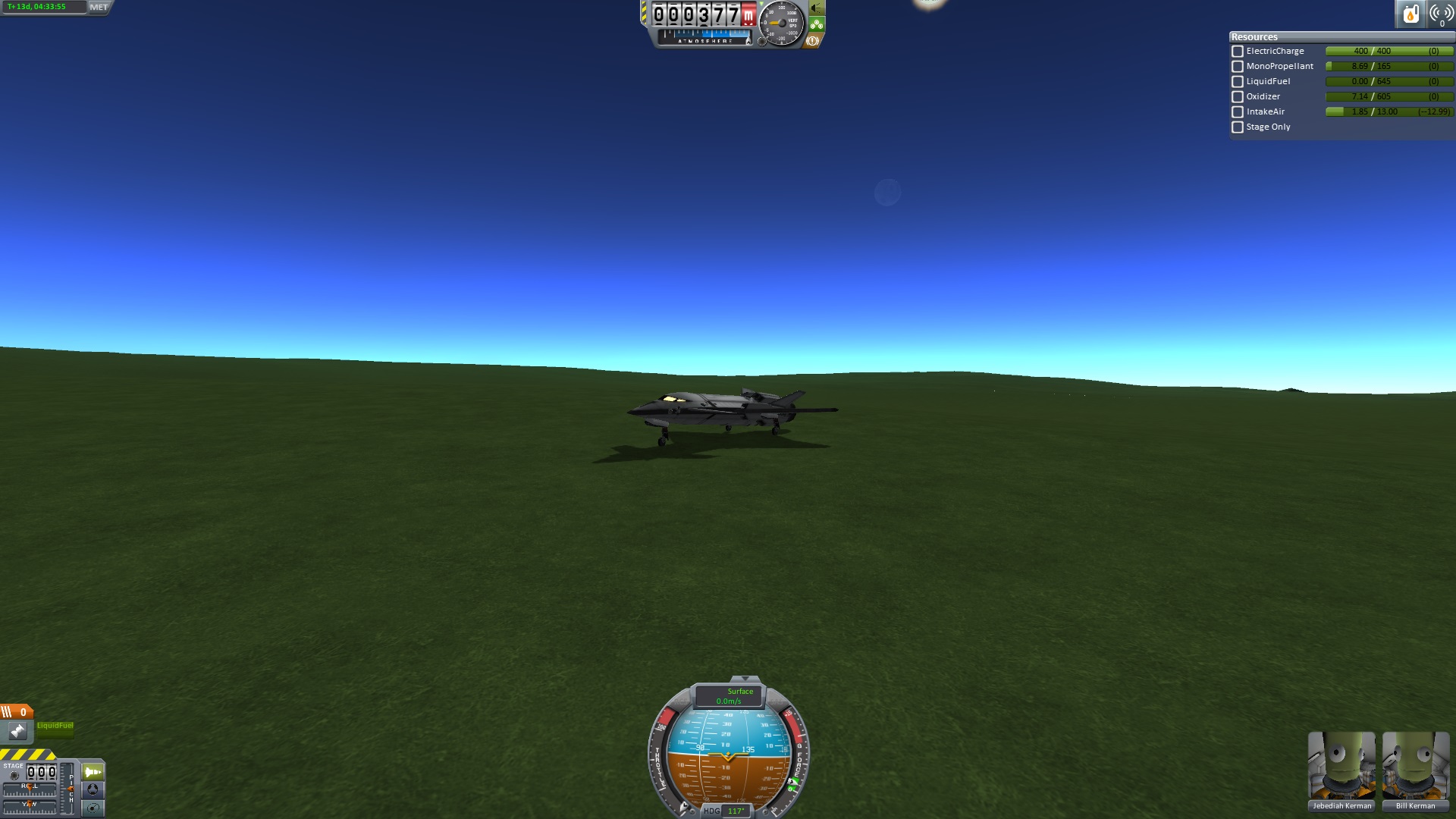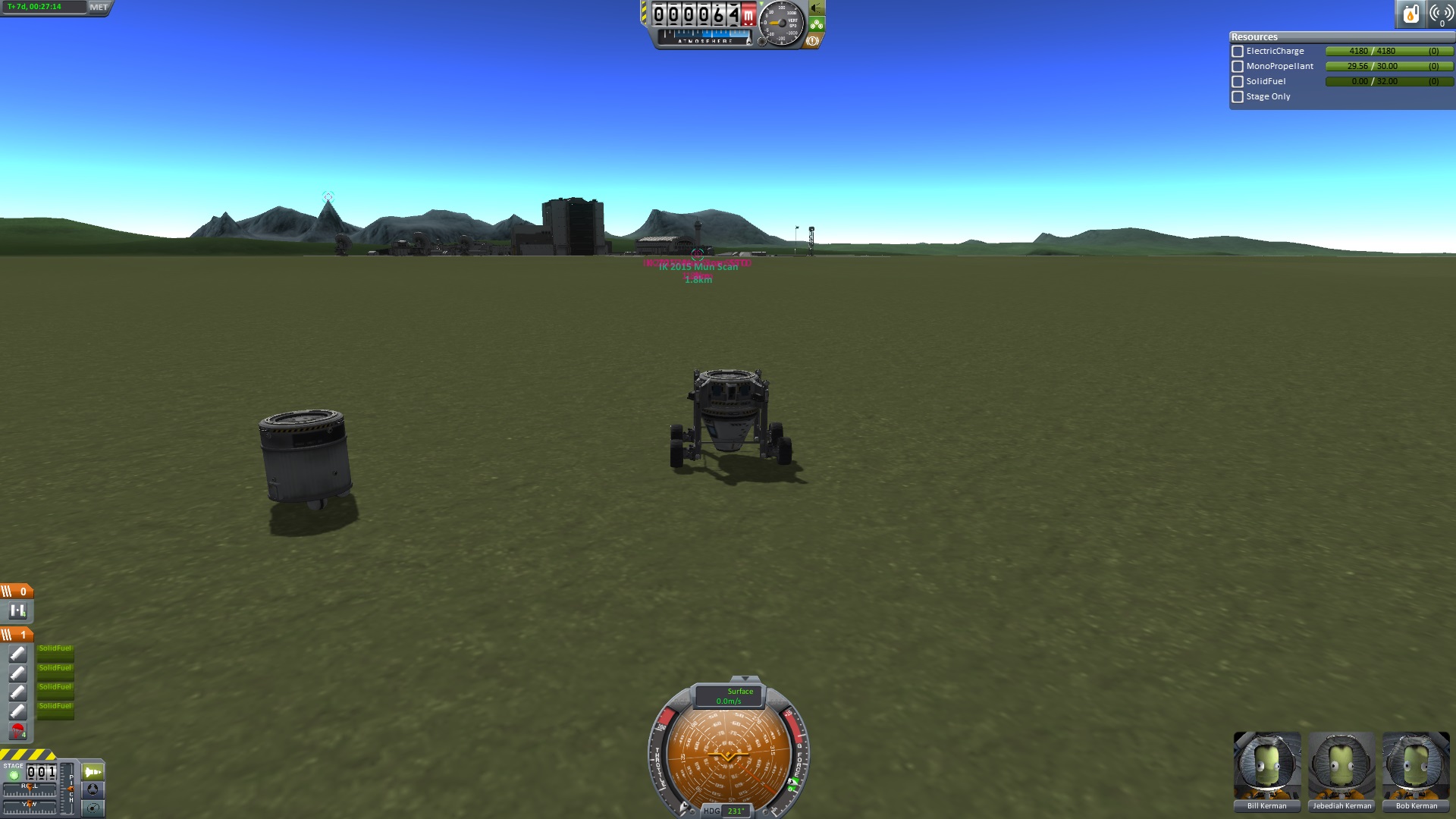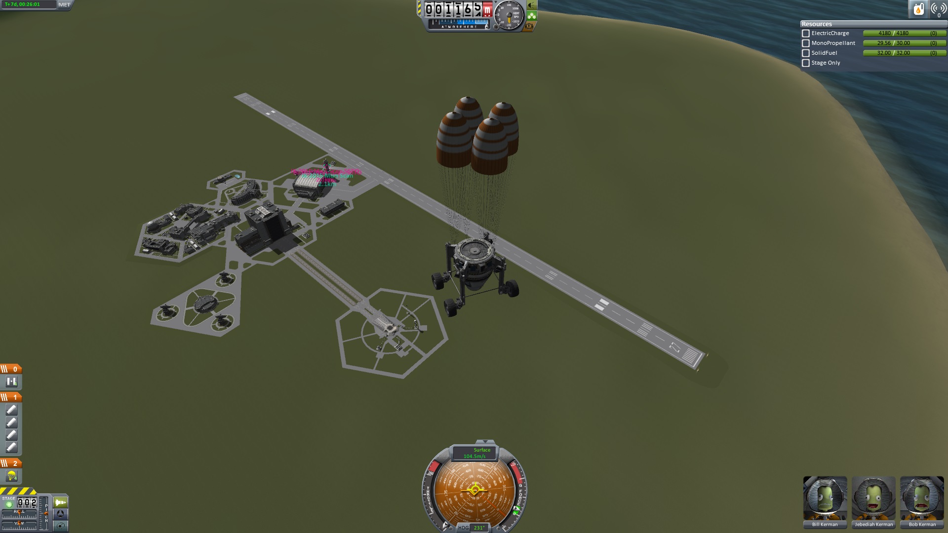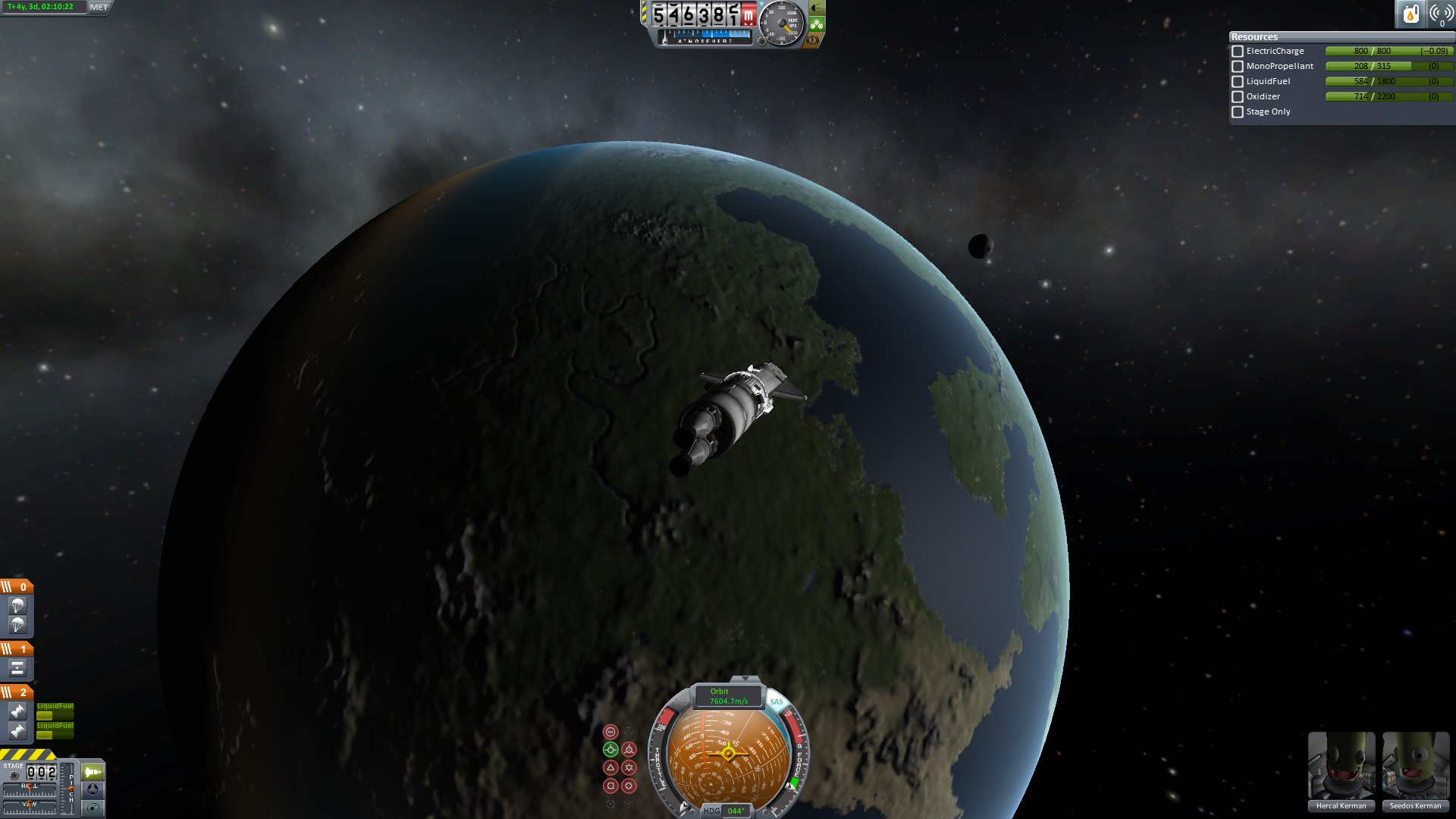 Nach dem Bill und Jebediah sich Minmus beim Vorbeiflug angeschaut hatten ging es zurück nach Kerbin wo die Landung auf Raketen/SSTO Art geplant war. Bill fand das nicht wirklich Witzig , Jeb schon.