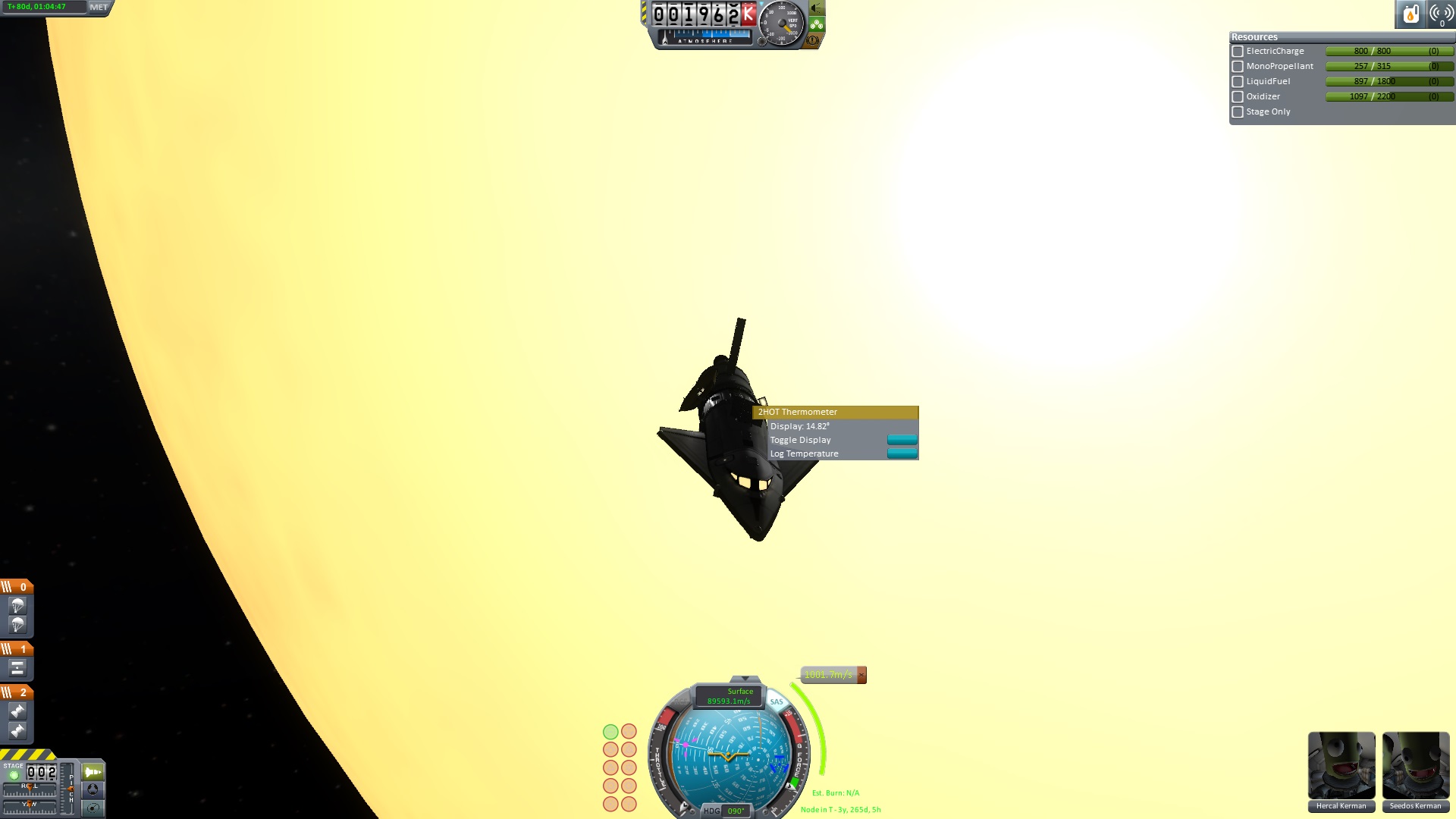 Nach dem Bremsmanöver waren die beiden unterwegs nach Kerbol. Beim schaun auf das Thermometer kurz vor der Periapsis, waren sie überrascht. Sie hätten gedacht es ist hier deutlich wärmer.