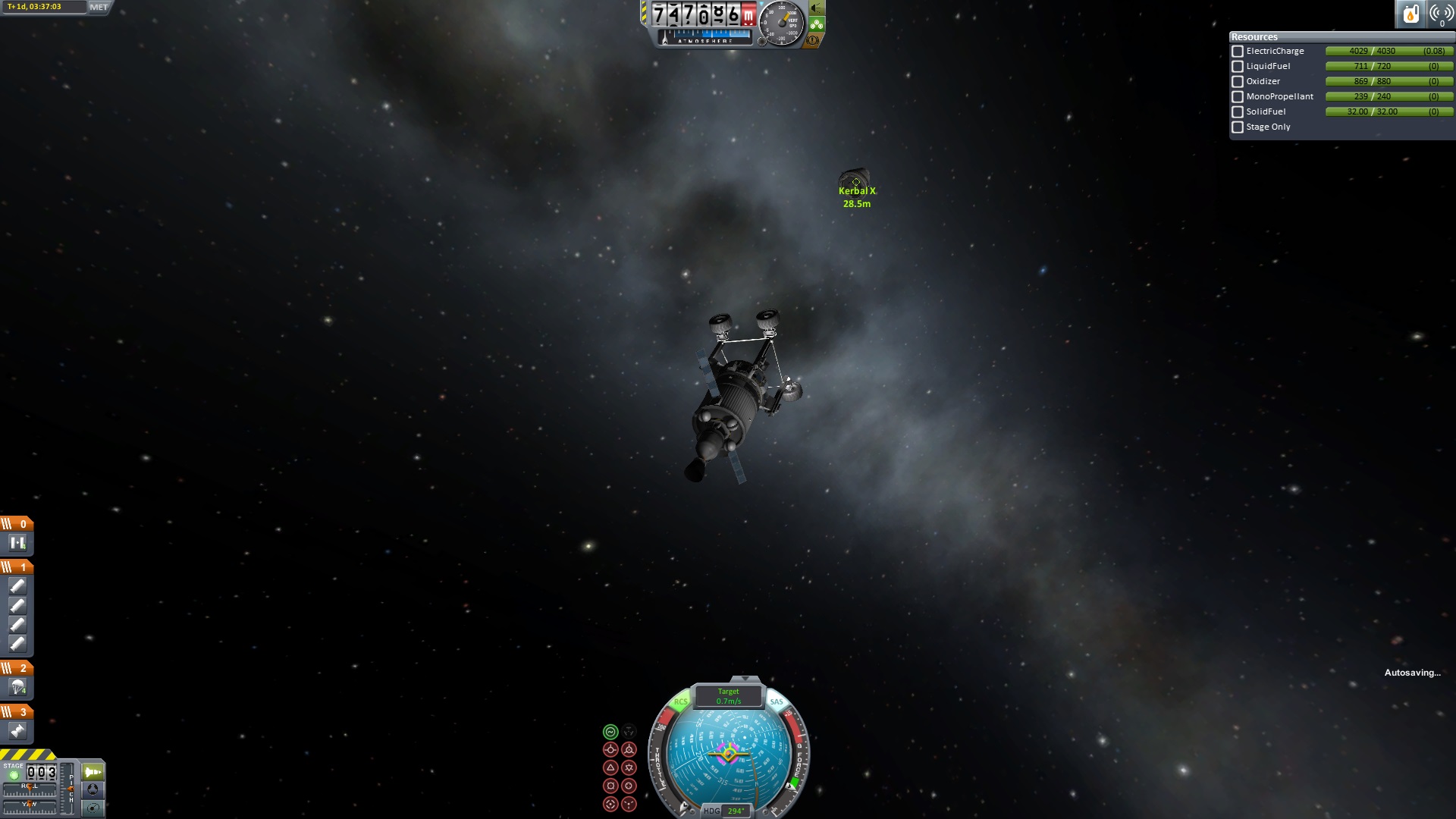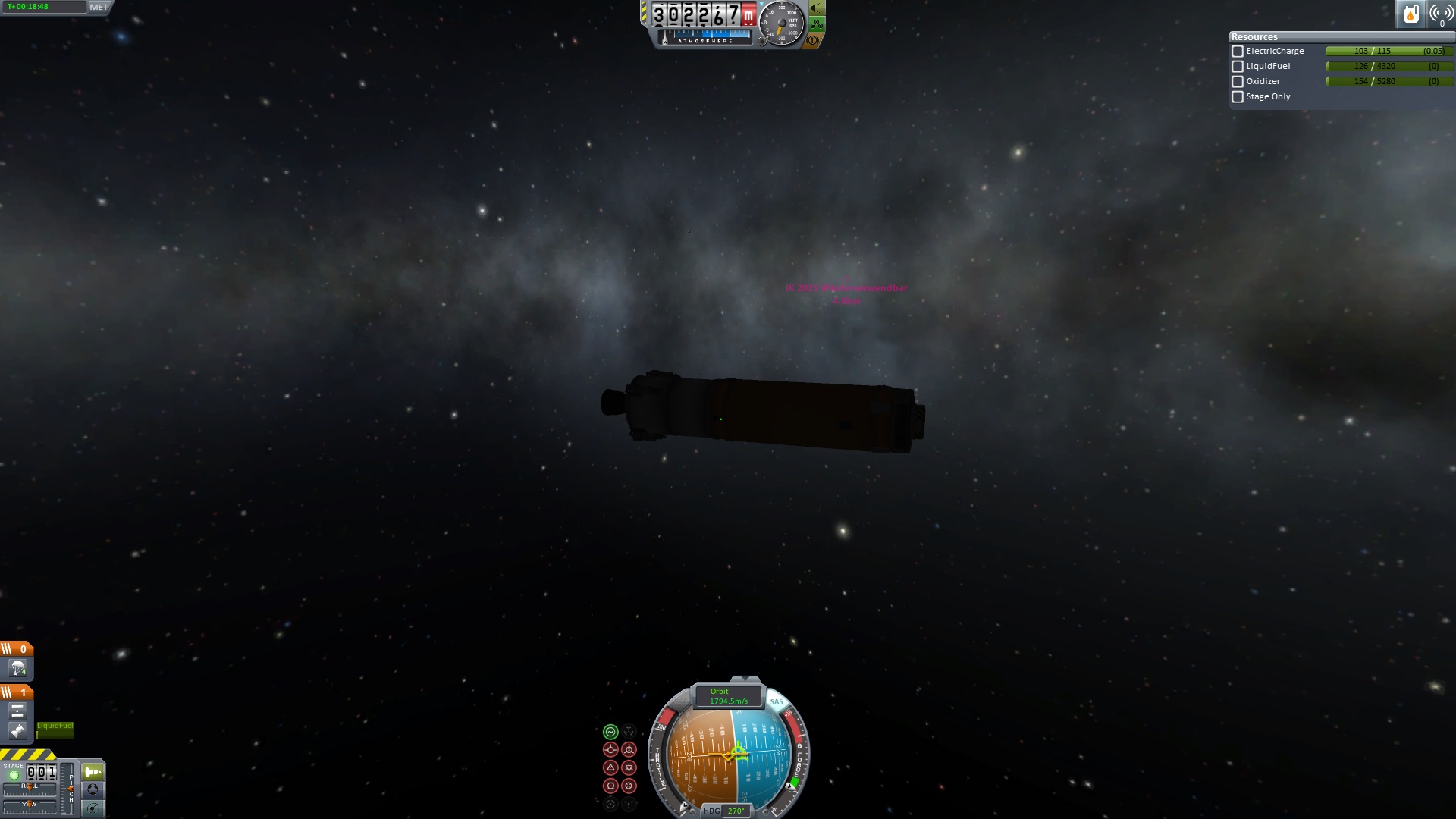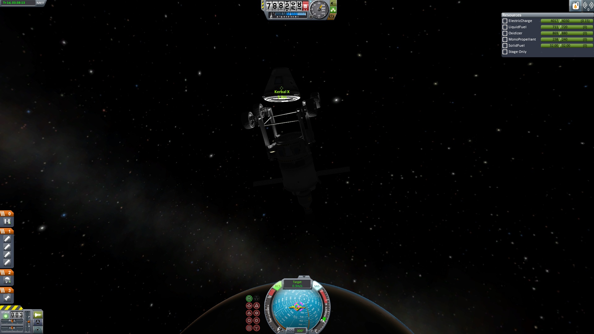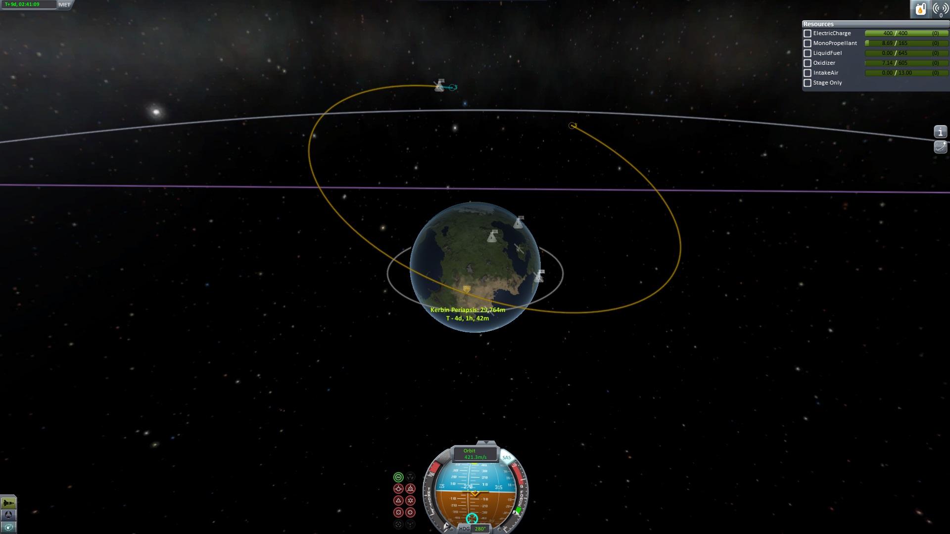 Nach dem die Kapsel angedockt war ging es zurück zum KSC. Das Bremsmanöver beanspruchte einiges an Zeit da der Orbit der Kapsel doch recht hoch war. Laut Gerüchteküche muß wohl bei dem Versuch zum Mun zu kommen einiges schief gegangen sein. Genaueres war nicht zu erfahren. :seriously: