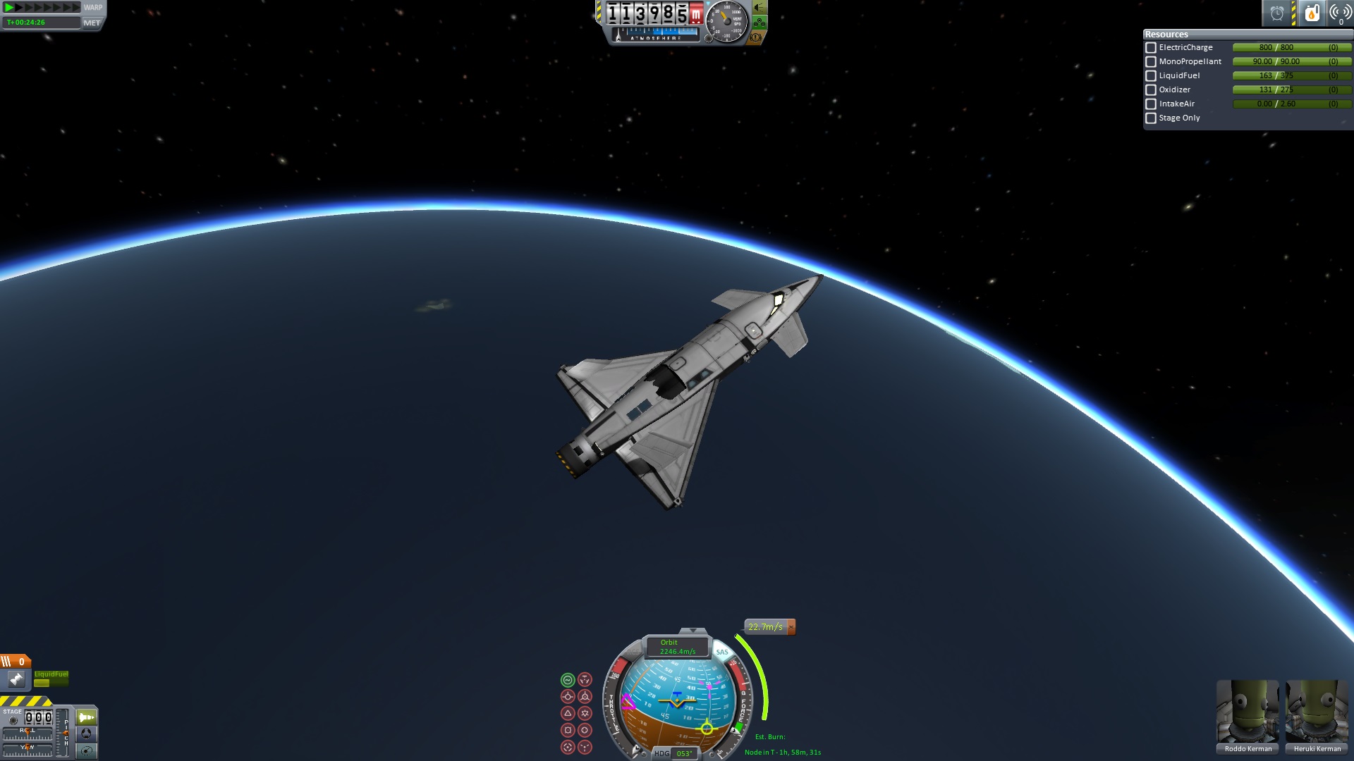 Starten und fliegen ist recht einfach. SAS sollte immer an sein, beim Start bis auf min 90m/s beschleunigen und dann leicht Höhe ziehen, bis auf rund 20.000m kann man recht steil steigen dann sollte man die Nase runter nehmen und Geschwindigkeit aufbauen. Wenn alles sauber läuft hat man in 32.000m Höhe dann die 2000m/s Surface überschritten. Und von nun an geht es im Raketenmodus weiter, Orbit brennen und Rendezvous. Wiedereinritt muß man nach noch vorhanden Treibstoff planen. ;)