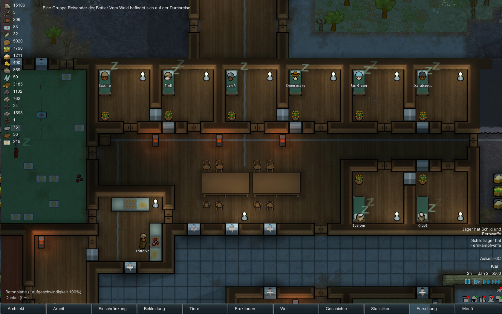 Jetzt ist der zweite Sommer vergangen und meine Lager sind zum bersten gefüllt (ein Teil der Nahrung liegt aus Platzmangel noch draußen, zum Glück kein Problem bei -20°C). Ich bekomme aber dooferweise zu wenig neue Einwohner und werde inzwischen von Mechs angegriffen. Verhungern wird niemand, aber ich denke meine Siedlung wird bald überrannt. Da alle nahen Metallvorkommen inzsichen erschöpft sind, wird es immer schwieriger Verteidigungseinrichtungen wieder aufzubauen.