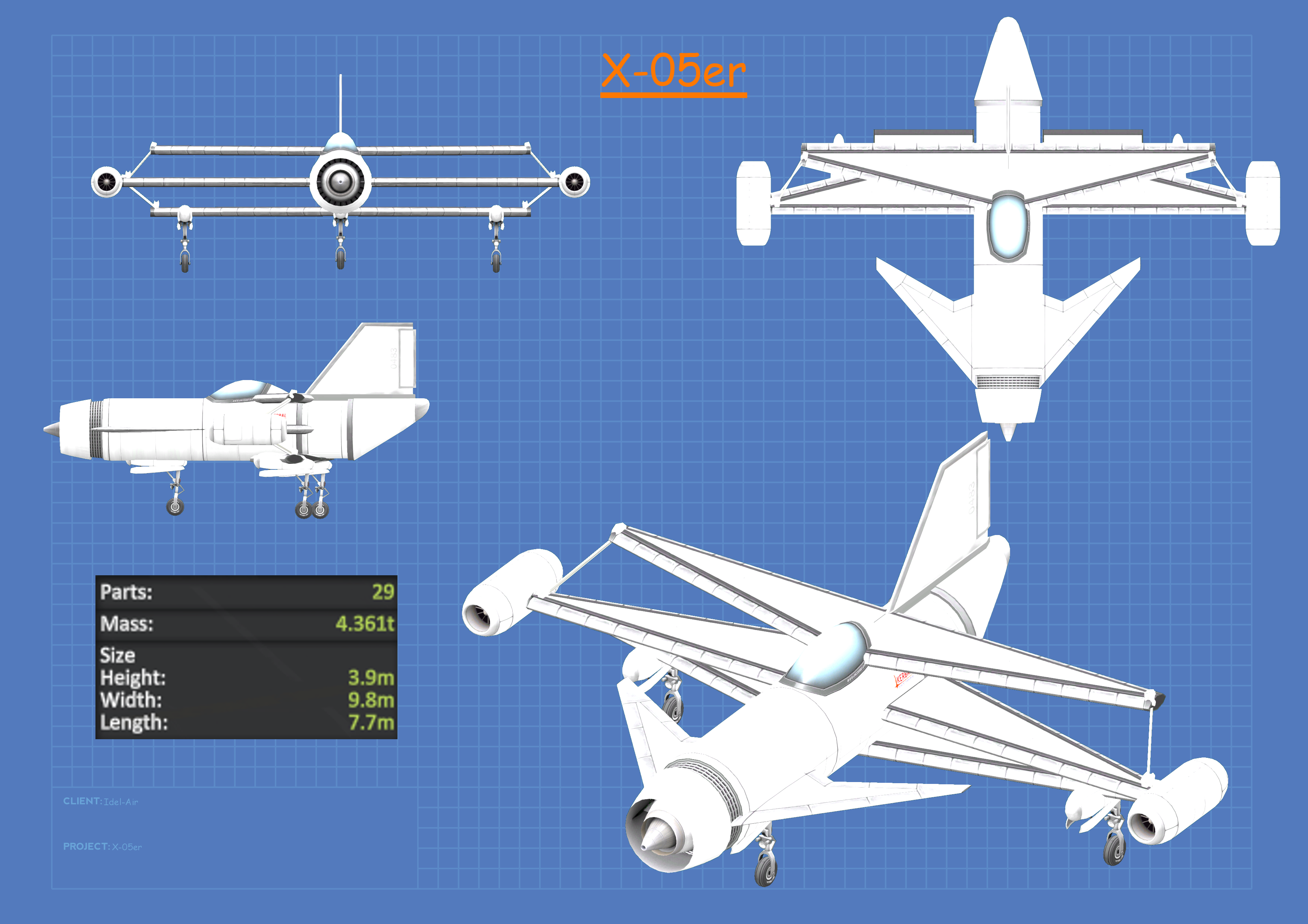 Die X-05er, auch angetrieben durch einen J-33 Turbofan Antrieb, der allerdings nicht gedrosselt ist (sollte er aber, das Ding fliegt mindestens 550 m/s), ist sie ein Flugzeug für Fortgeschrittene, lässt sich aber genauso leicht starten und landen wie die Kessna 172,5 fliegt aber wesentlich schneller.