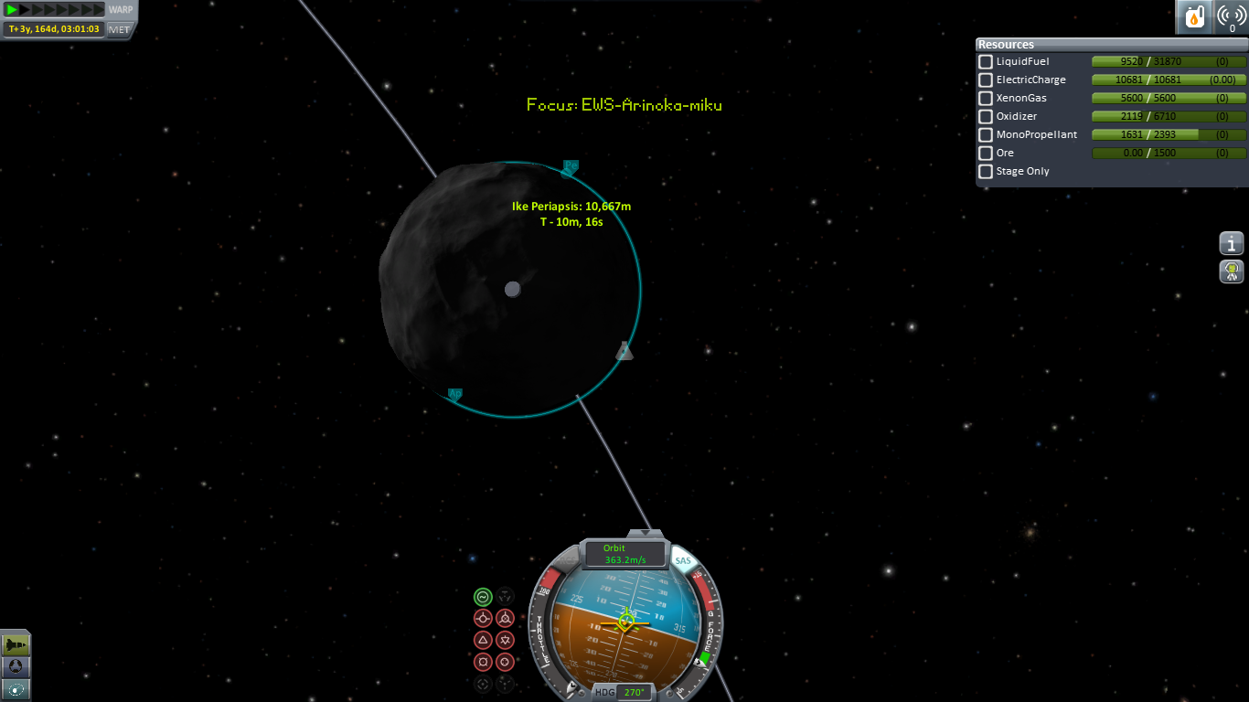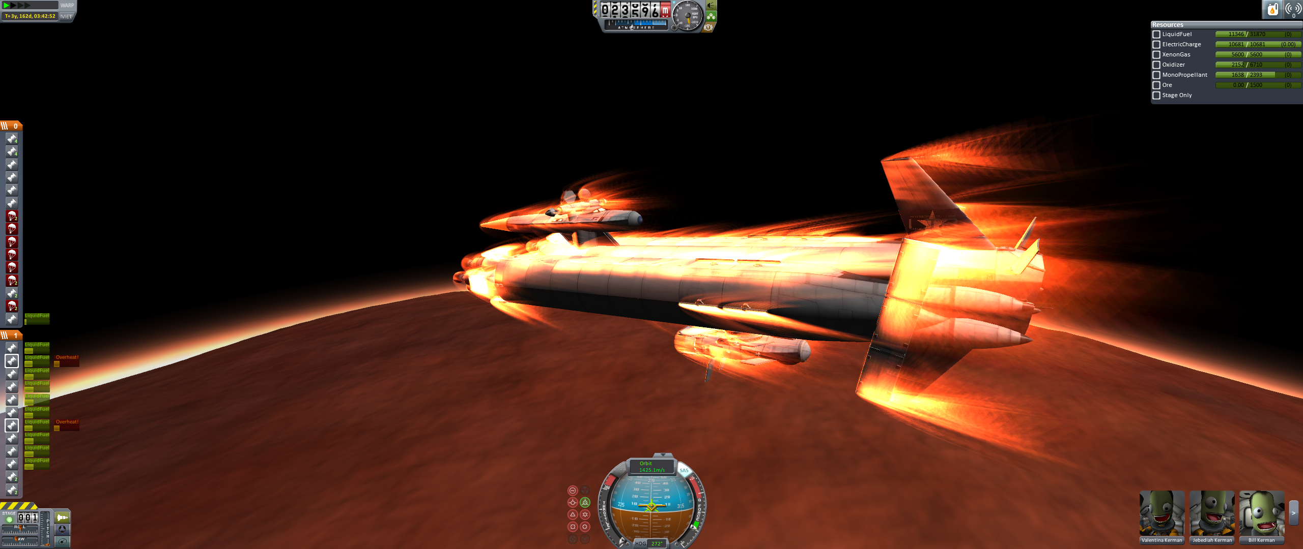 In den ersten Tests erreichte die Harikashiima durch ihre zwei Kerboss-SpanceRanger-Antriebseinheiten mit je 420kN Schub erstaunliche Werte von unter 15 min. bei einem 850m/s Progradeburn. Das ergibt ein TWR von 0.27!!! Natürlich ist sie frei von Schummelsoftware und erhält in den nächsten Wochen die grüne Feinstaubplakette.