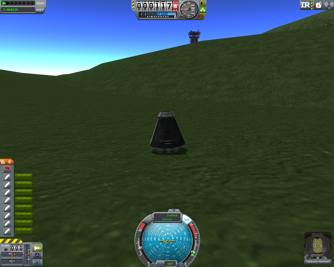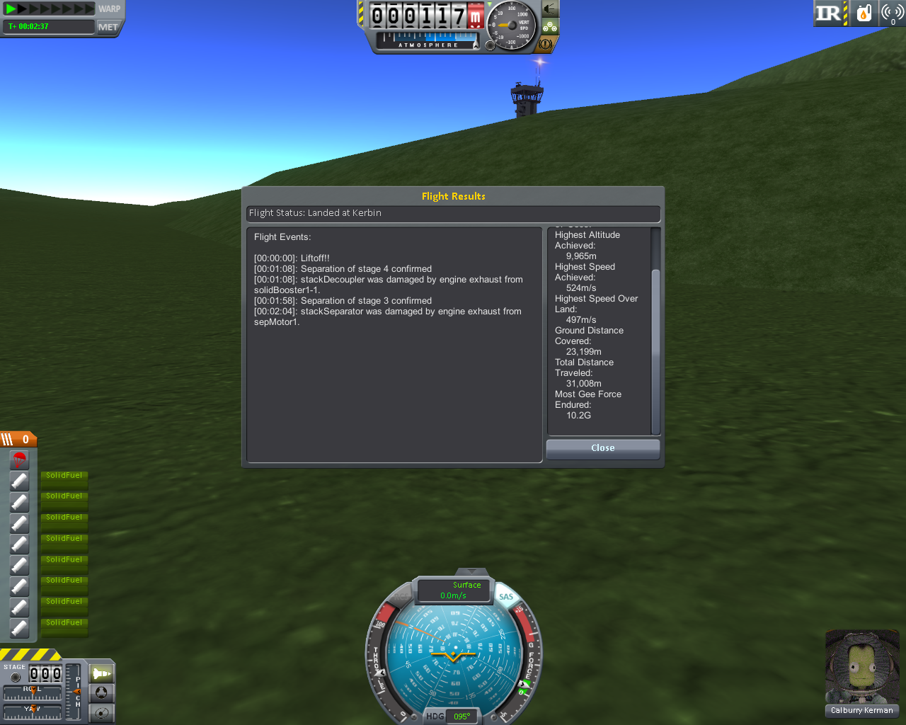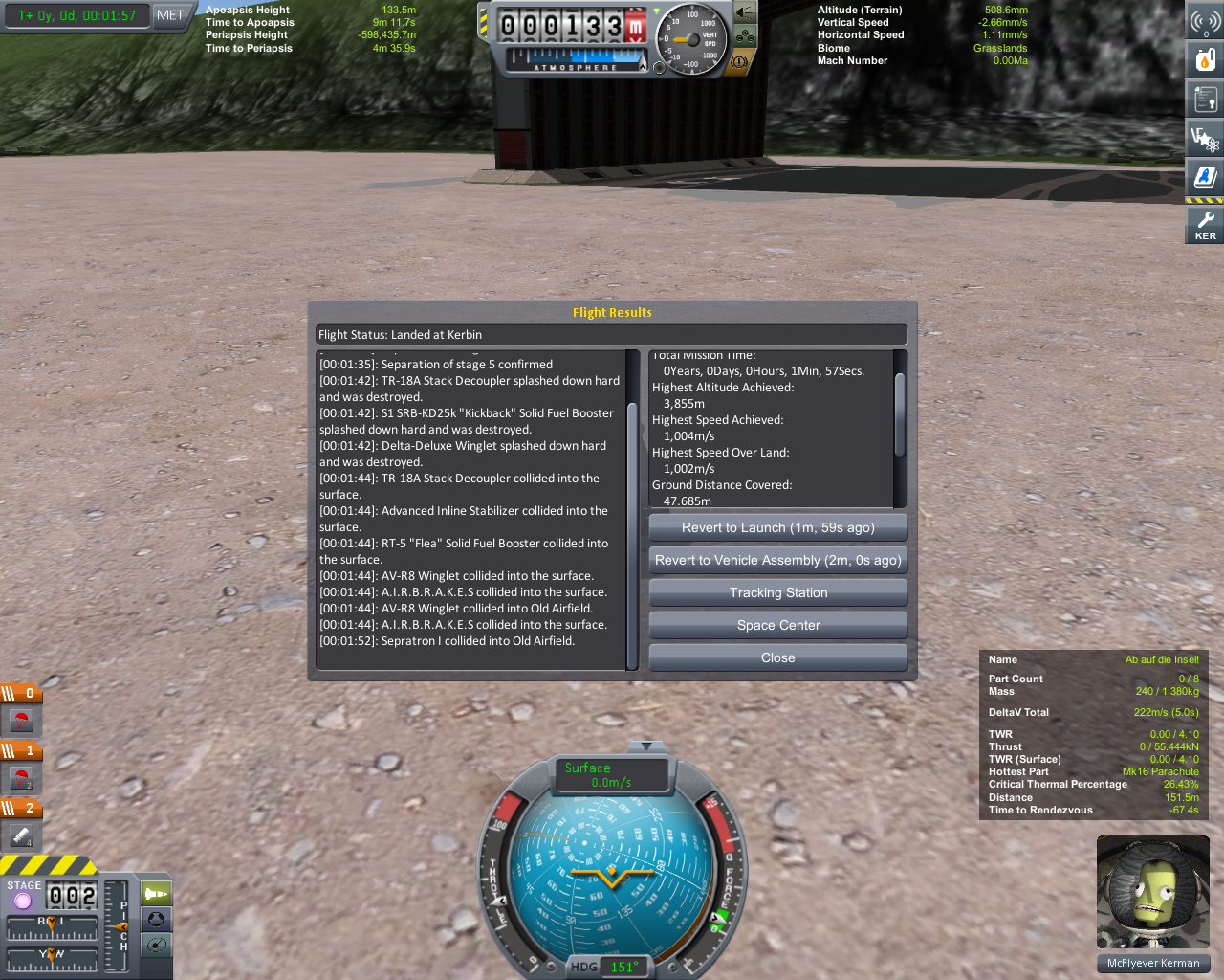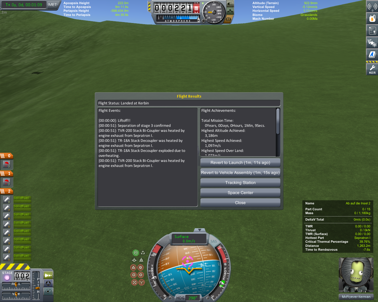 Zitat von Mc?l?everVersuche so schnell wie möglich einen Kerman, zu der ca. 30 Km entfernten Insel mit dem Flugplatz, zu befördern. Mit einem Flugzeug ist das kein Problem, aber wenn man nur zwei Booster verwenden darf, sieht die Sache schon anders aus.