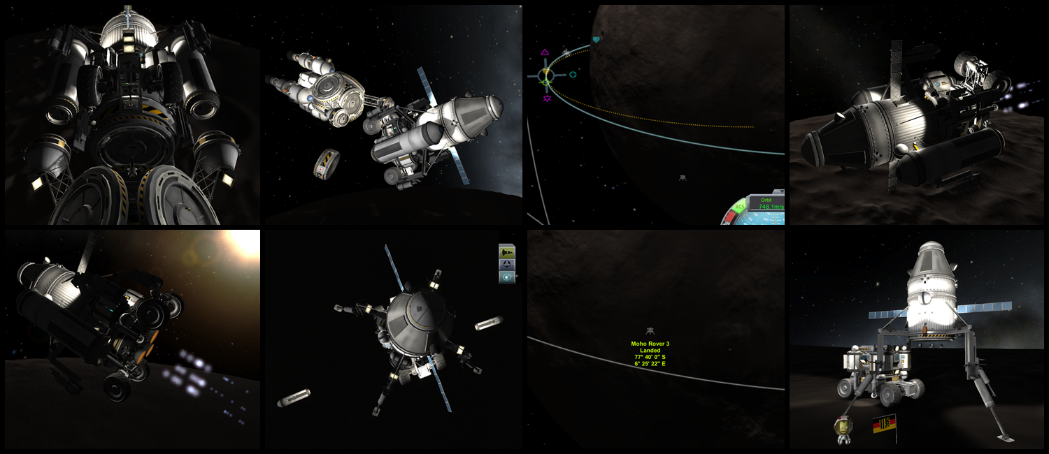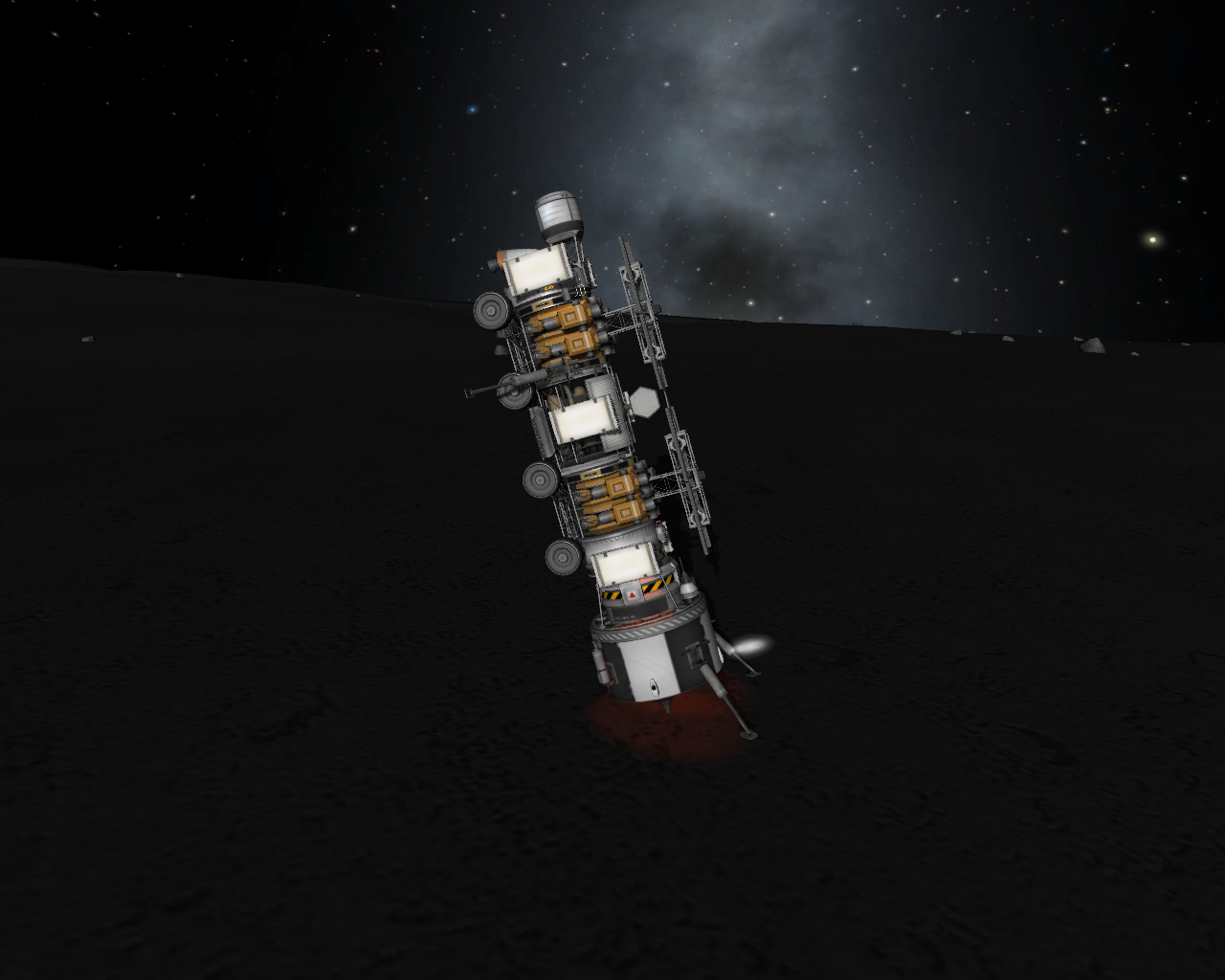 Für den Anfang finde ich persönlich dieses System besser, auch wenn es vielleicht mehr Gefahren birgt (Teile könnten kaput gehen, Masse/Schubpunkt müssen übereinstimmen) allerdings verzeiht Mun mit seiner geringen Anziehungskraft viele Fehler, was auch das landen von noch größeren Rovern mit diesem System möglich und sicher macht (siehe letztes Bild). Mir ist mit dieser Art Rover zu landen, noch nie einer kaput gegangen.