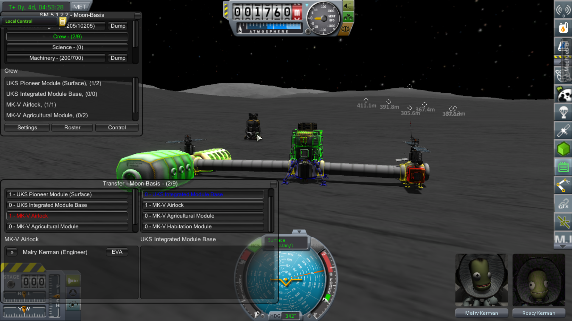 Ich habe eine Moon-Basis, aufgebaut mit USI Kolonization. Ein Pioneer Modul, zwei Anchor hubs, ein Habitation Modul und ein Agricuktural Modul.