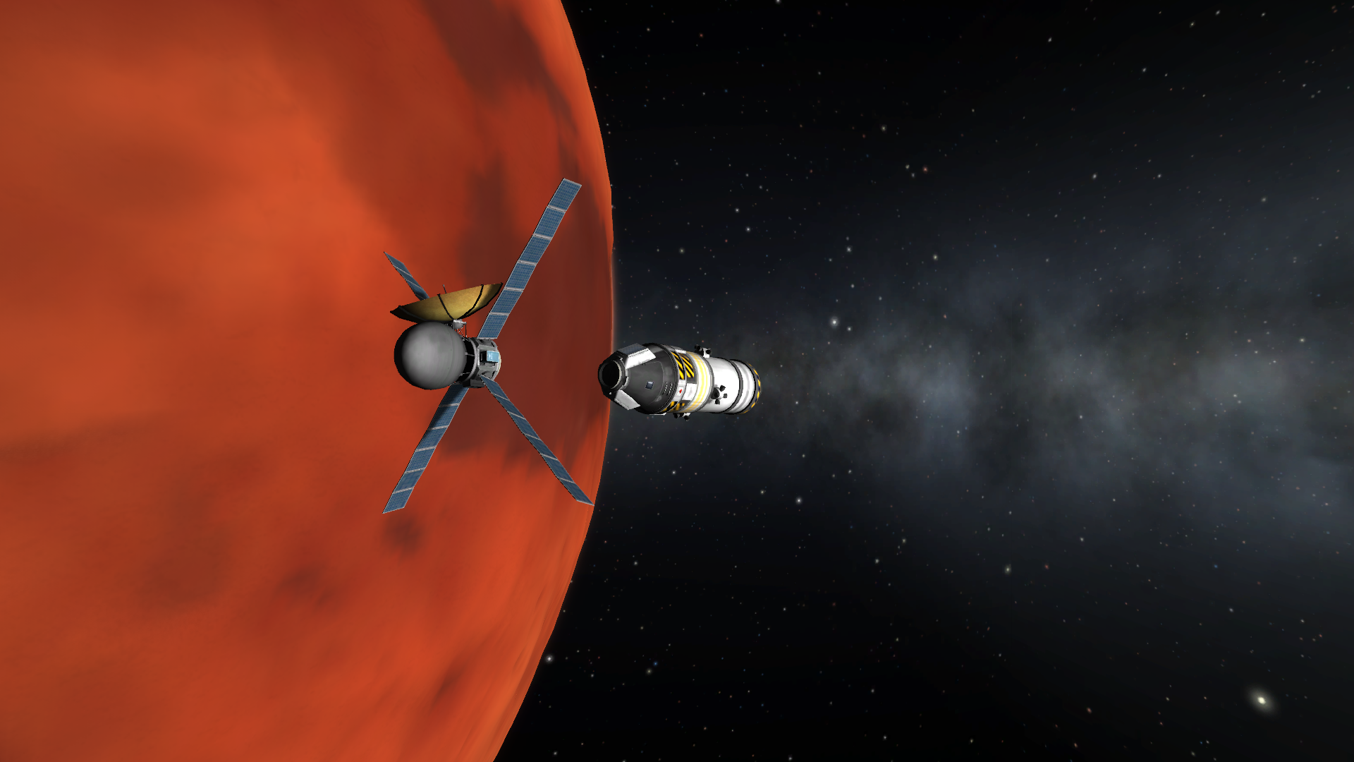 Beschreibung: Die vor vielen Jahren nach Duna gesandte Mariner 9 Sonde befindet sich auf einem letzten Orbit, bevor sie an der Oberfläche zerschellen wird. Bill hat es sich zur Aufgabe gemacht die Sonde zu retten. Fange die Mariner 9 Sonde ab, docke mit ihr und befördere sie in einen stabilen Orbit. Doch Treibstoff und Zeit sind knapp.