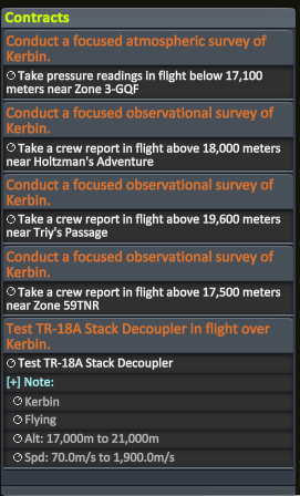 Derzeit geht es mir wie gesagt nur darum, mit dem Flugzeug die oben genannten Aufgaben zu erledigen, um mehr Sience + Kerbin-Dollar zu bekommen. Ich dachte, dass das relativ wichtig ist, denn als ich mir das Tutorial von wintermancer angeschaut habe, hat der das nach dem ersten Orbit Flug gemacht. Dadurch dachte ich, dass ich das auch erst erledige, bevor ich zum Mun aufbreche.
