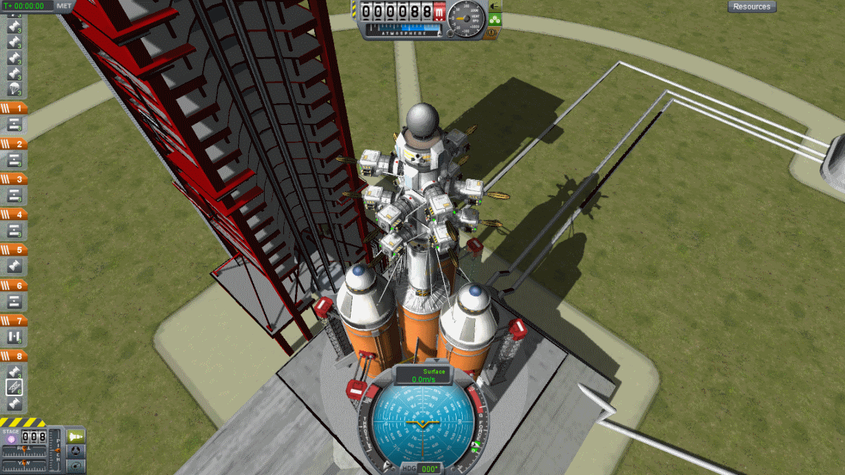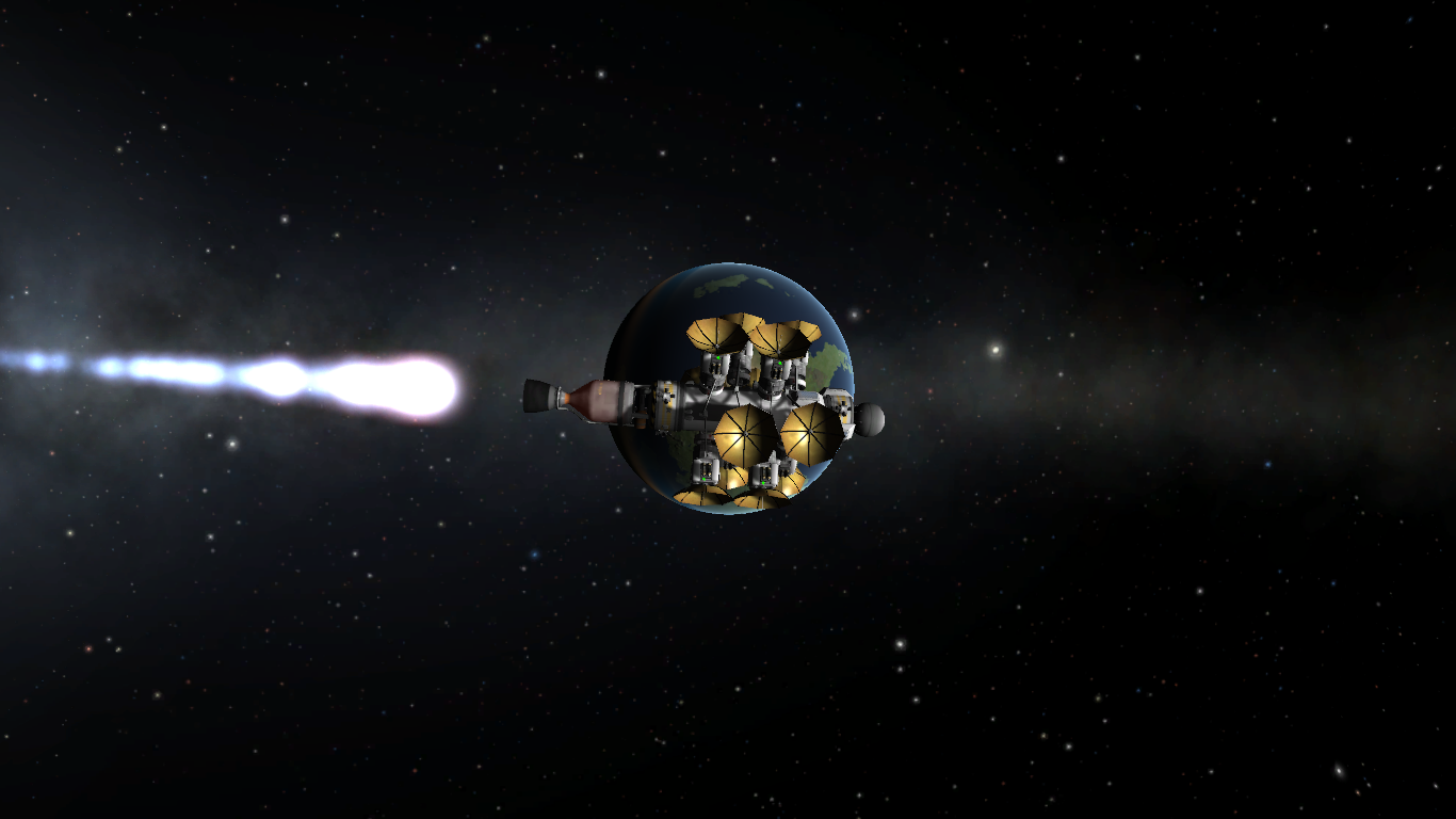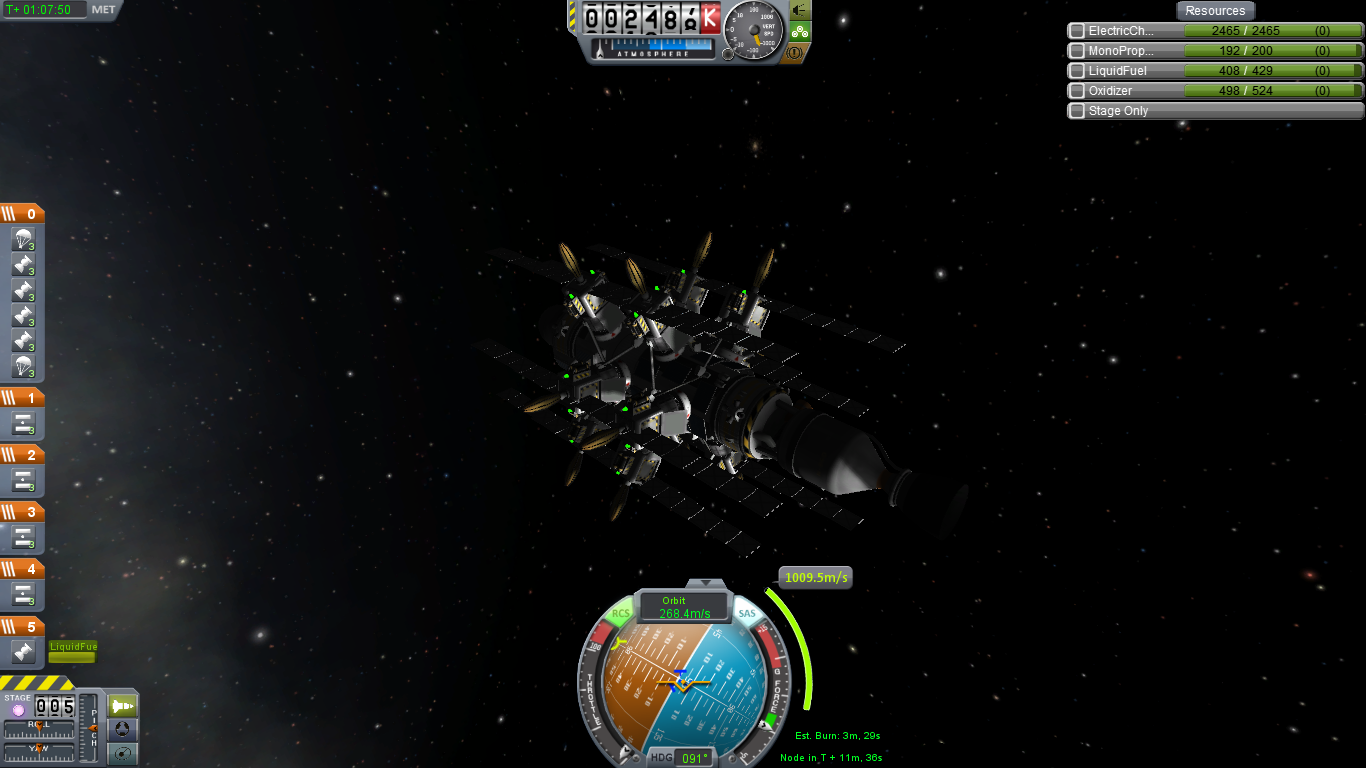 Ich habe ein Rakete mit 12 Satelliten gebaut diese werden bei einer Höhe von 2550 km ausgesetzt. Insgesamt habe ich 3 Flügel in unterschiedlichen Bahnneigungswinkel geflogen, um eine 100 %-ige Abdeckung mit KPS (Kerbal Position System) zu haben.
