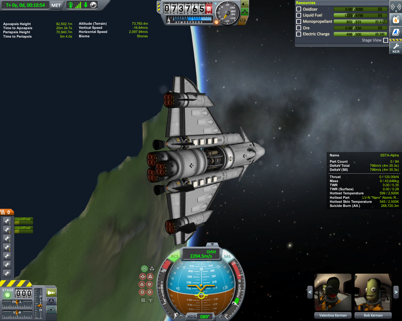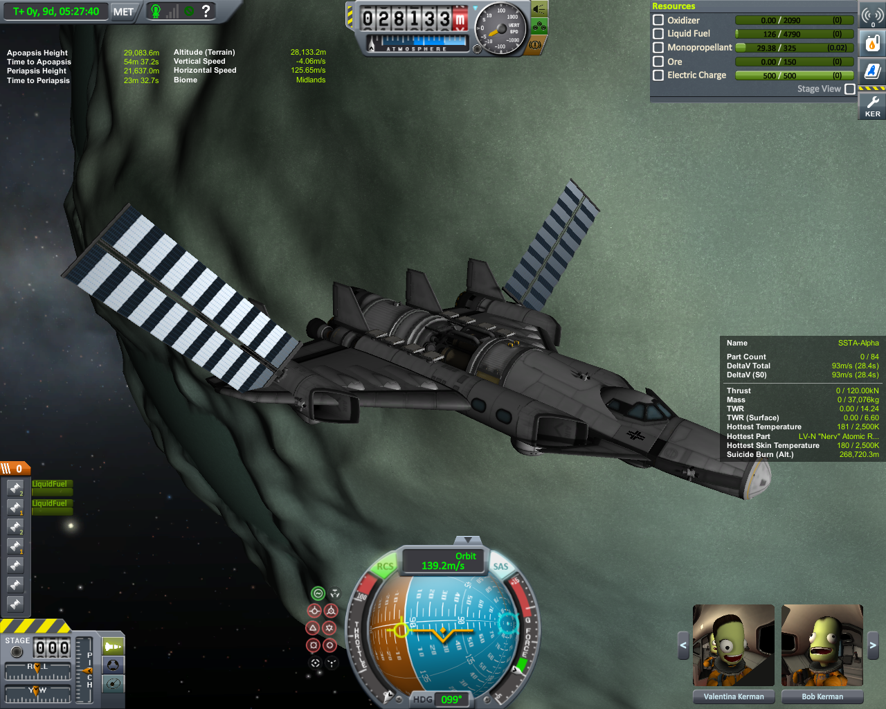 Wiedereintritt war beim ersten Flug recht anstrengend, mit lehren Tanks ist es etwas Instabil und neigt zum trudeln. Beim zweiten Flug habe ich ein den Treibstofffluß umgestellt, so das der vordere Tank der letzte ist der gelehrt wird. Dann war es unproblematisch beim Wiedereintritt und auch Landeanflug.