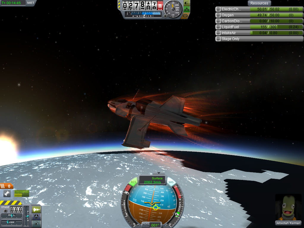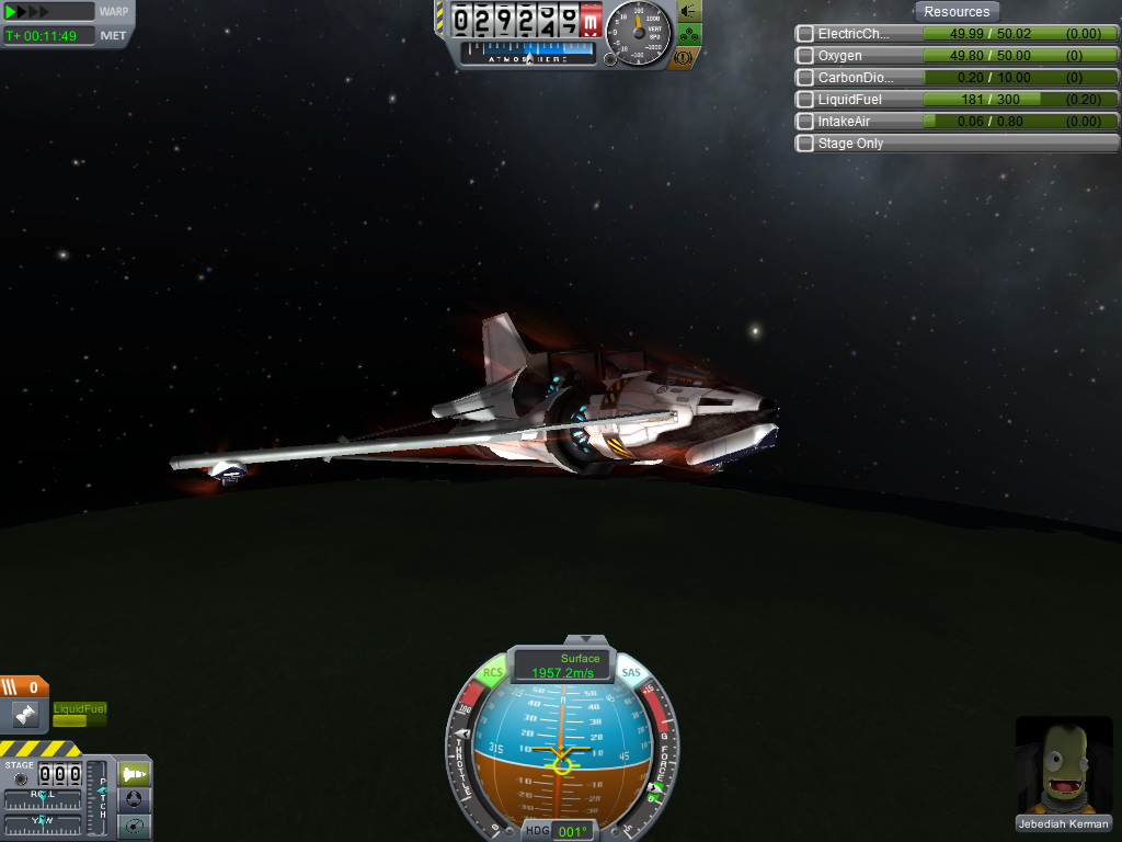 Bei meinem erfolgreichen Versuch hat es vollkommen ausgereicht Swept Wing´s als Haupttragfläche zu verwenden. Natürlich muss man die allgemeinen Regel wie Gewichts- und Auftriebverteilung beachten damit das Ding überhaupt steuerbar bleibt. Auch sollte man sich darauf einstellen das ca. 200 m/s zum abheben notwendig sein werden. Alles in allem empfehle ich, vor allem für ungeübte Fliege (wie mich z.B.) ein ASAS in dem Flieger mit zu verbauen. Da man solche Geschwindigkeiten in größer Höhe relativ einfach hinbekommt, gilt es nun also die Kiste möglichst hoch zu bekommen, bevor unseren Triebwerken die Luft ausgeht und ein BurnOut eintritt. Daher ist es wichtig genug Lufteinlässe zu verwenden. In meinen ersten Exemplaren habe ich viele Radial Air Intakes verwendet was jedoch nicht so gut funktioniert hat. Stattdessen habe ich drauf geachtet bei jeder zusätzliche Turbine einen Ram Air Intake vorzusetzen.