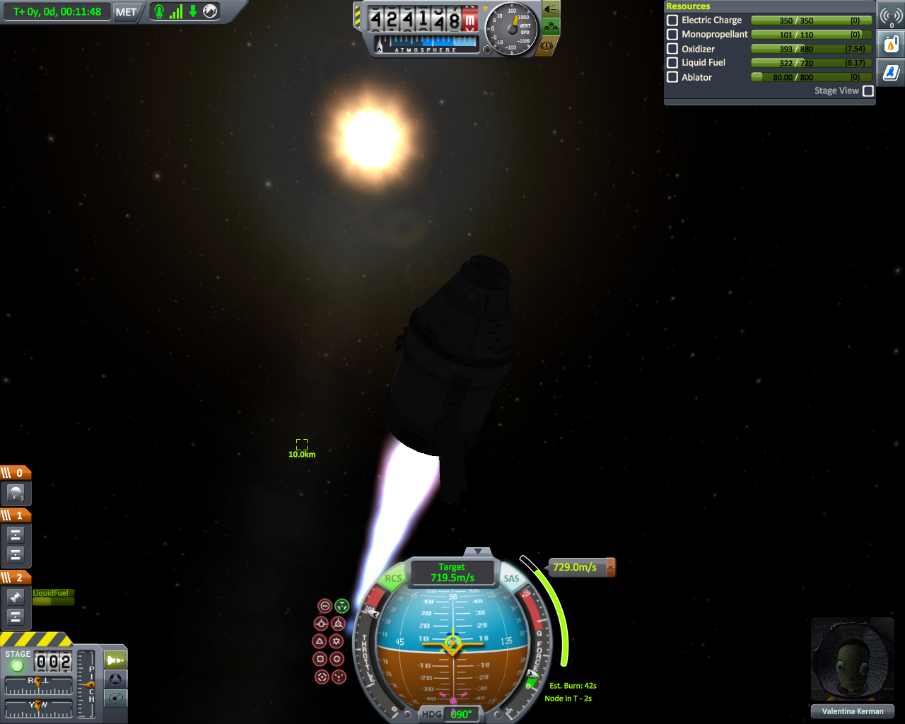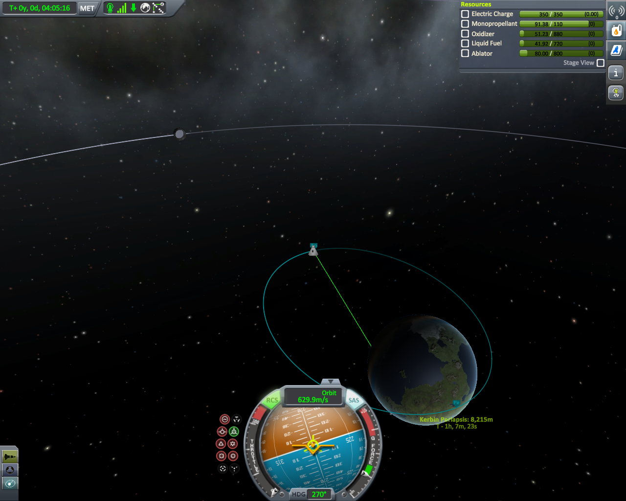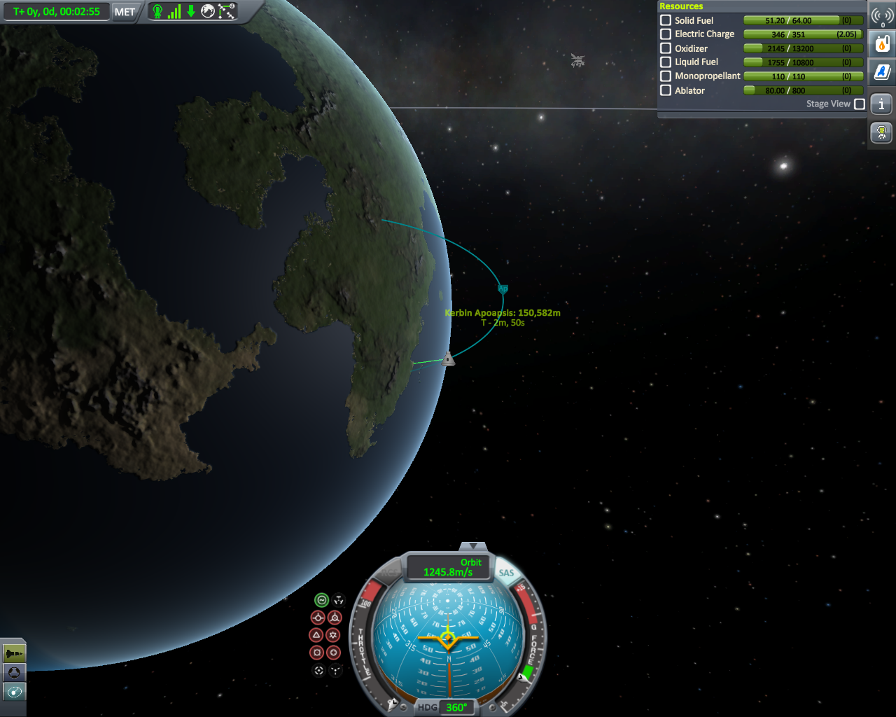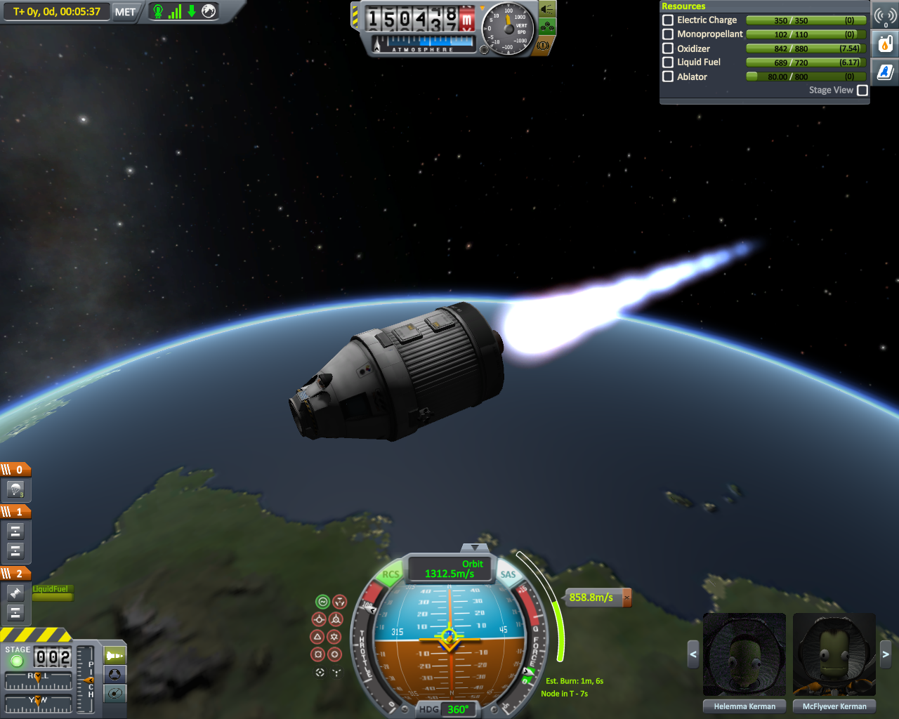 Geflogen bin ich mit meiner lieblings Rakete der Falcon 9 und habe nach etwas über 7 min die geforderte Höhe von 150 Km erreicht. Falls das nicht ganz eindeutig zu erkennen sein sollte (weil Pe verschoben), kann man es auf dem letzten Bild noch mal nachvollziehen.