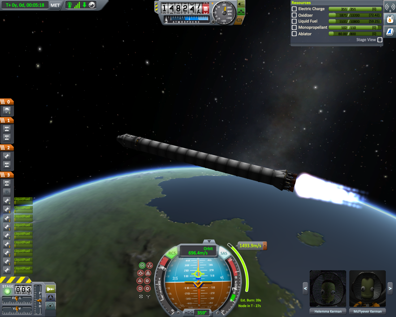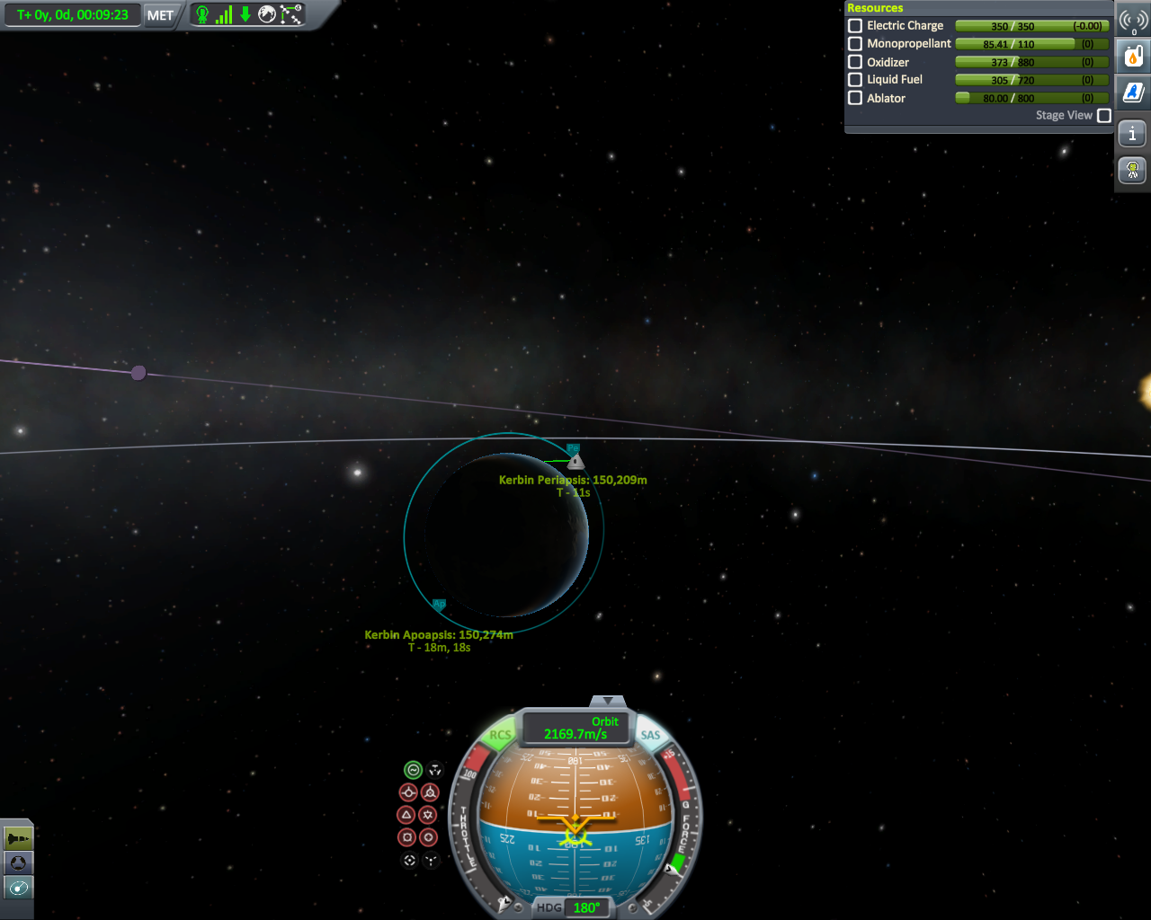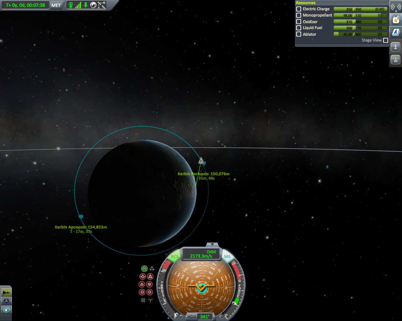 Geflogen bin ich mit meiner lieblings Rakete der Falcon 9 und habe nach etwas über 7 min die geforderte Höhe von 150 Km erreicht. Falls das nicht ganz eindeutig zu erkennen sein sollte (weil Pe verschoben), kann man es auf dem letzten Bild noch mal nachvollziehen.