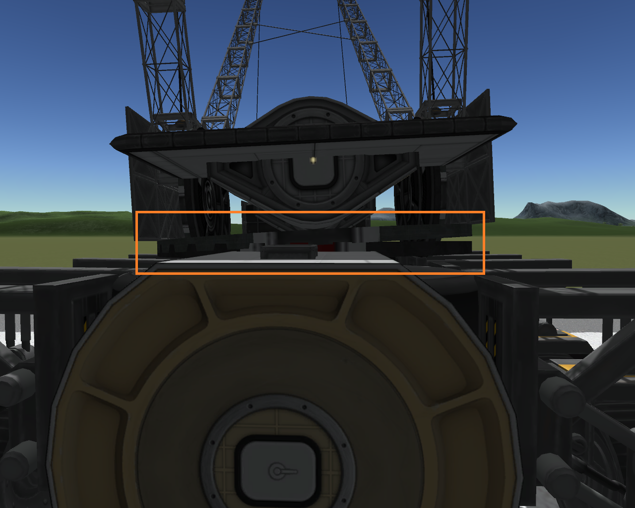 Es geht mal wieder um meinen Schwerlastkran, bei dem ich die große und sehr wichtige Drehplatte verstärken will (siehe Bild). Auf dieser lastet der gesamte Kranaufbau und die Nutzlast - im Schnitt dürften das so um die 50-70t sein, was dieses Teil aushalten muss (mehr wäre natürlich noch besser). Das Teil nennt sich "Docking Washer" und stammt aus dem Mod "Infernal Robotics/Magic Smoke Industries". Es besteht so gesehen aus zwei Teilen - eines davon ist der Ankerpunkt, das andere die bewegliche Platte auf welcher dann eben alles aufgebaut wird.